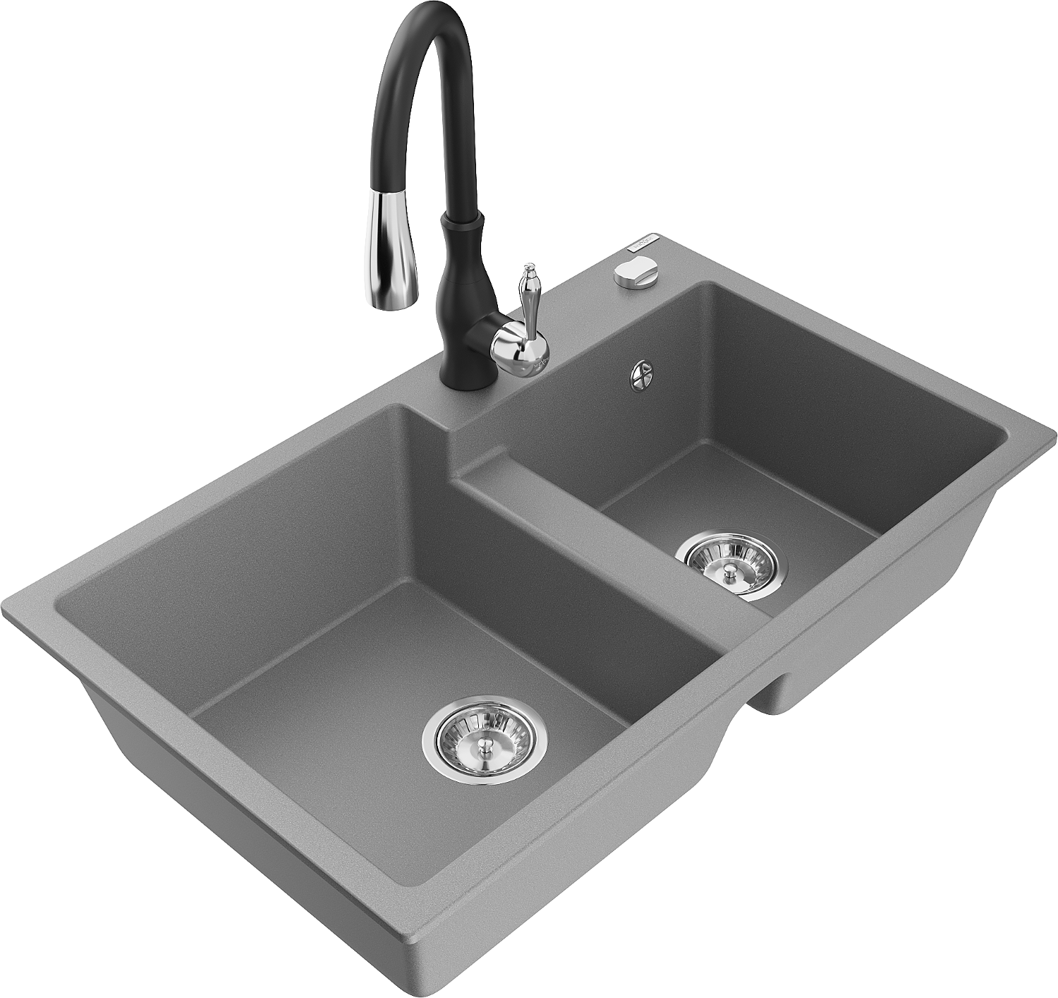 Mexen Tomas granitinė virtuvės plautuvė, dviejų skyrių su virtuviniu maišytuvu Savita, pilka - 6516-71-672601-70