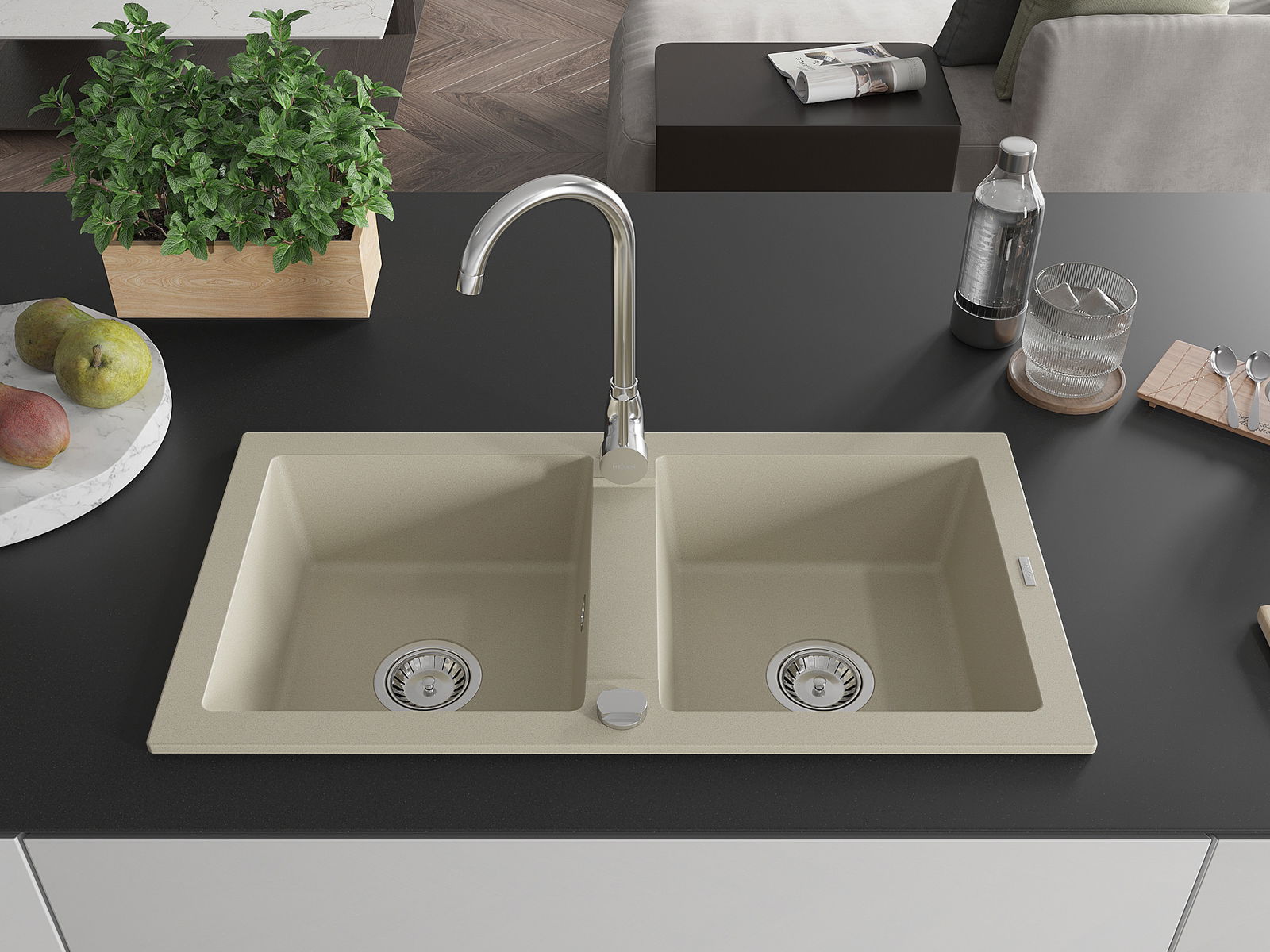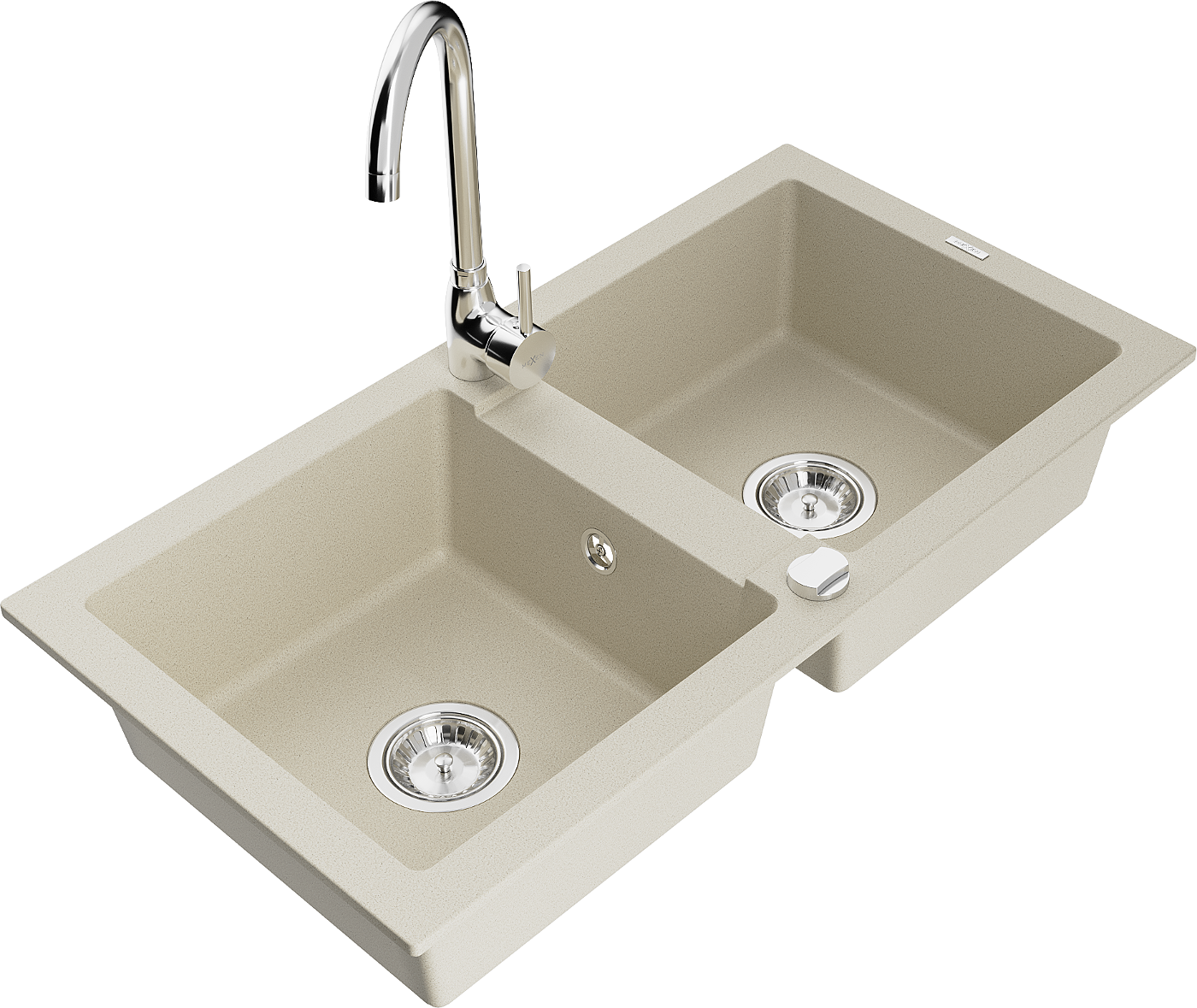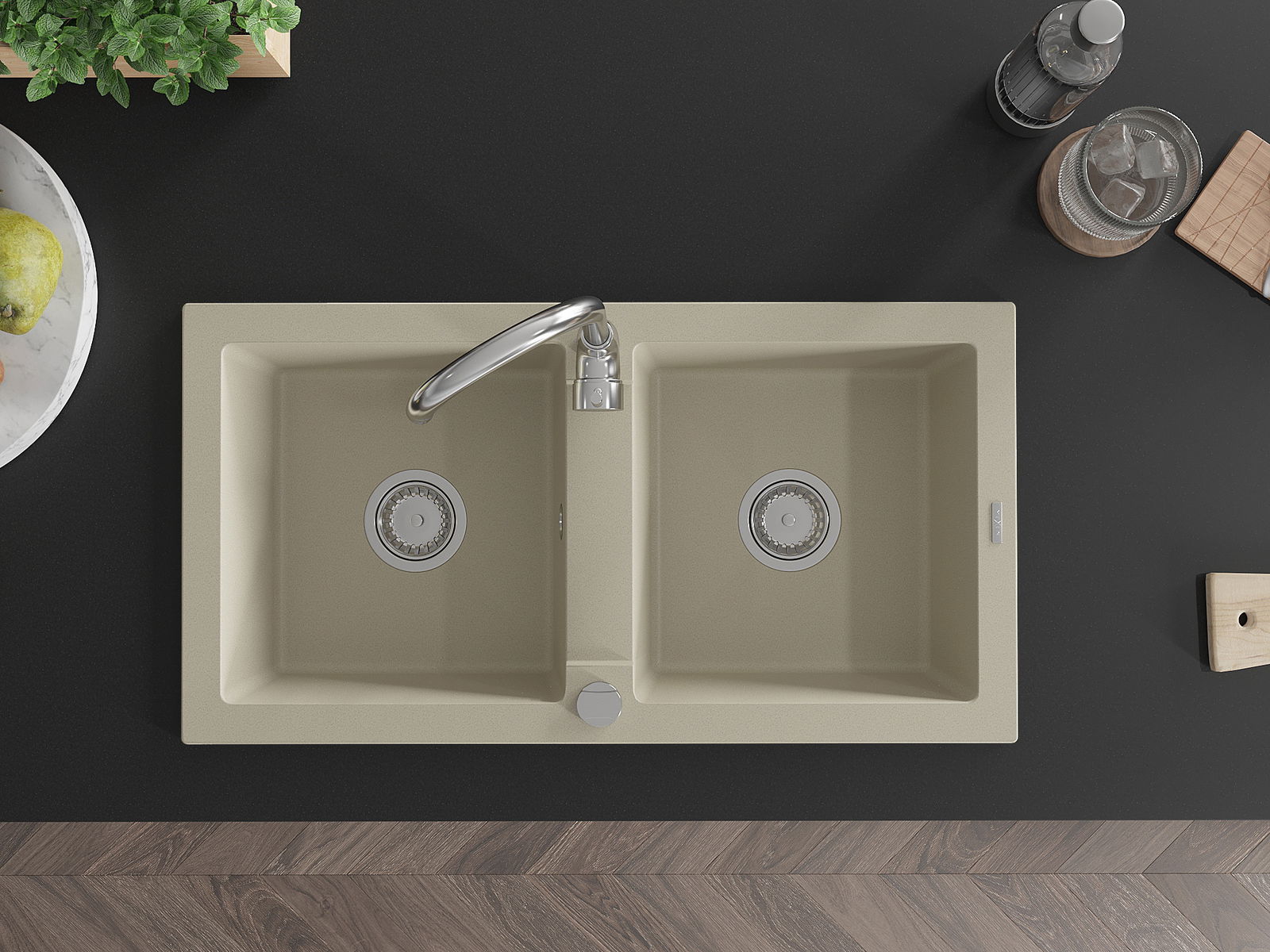 Mexen Mario granito virtuvės kriauklė su 2 skyriais ir Telma virtuvės maišytuvu, smėlio - 6504-69-670200-00