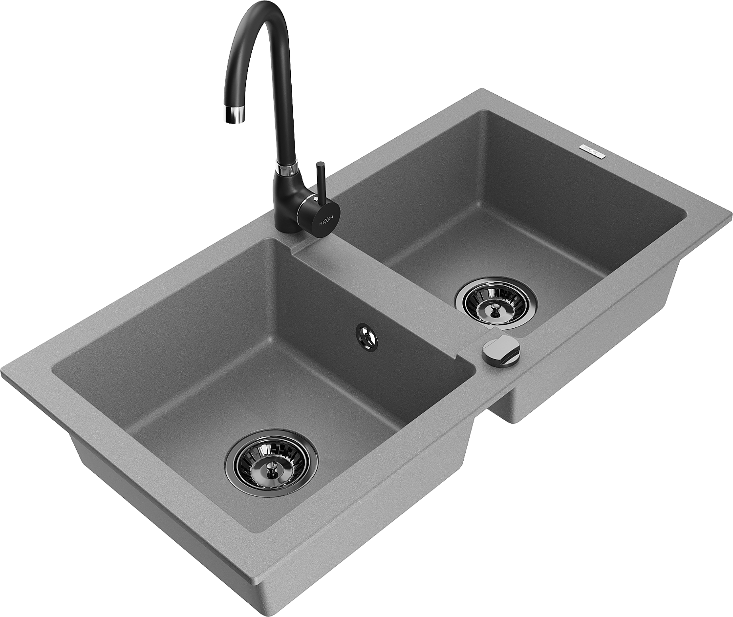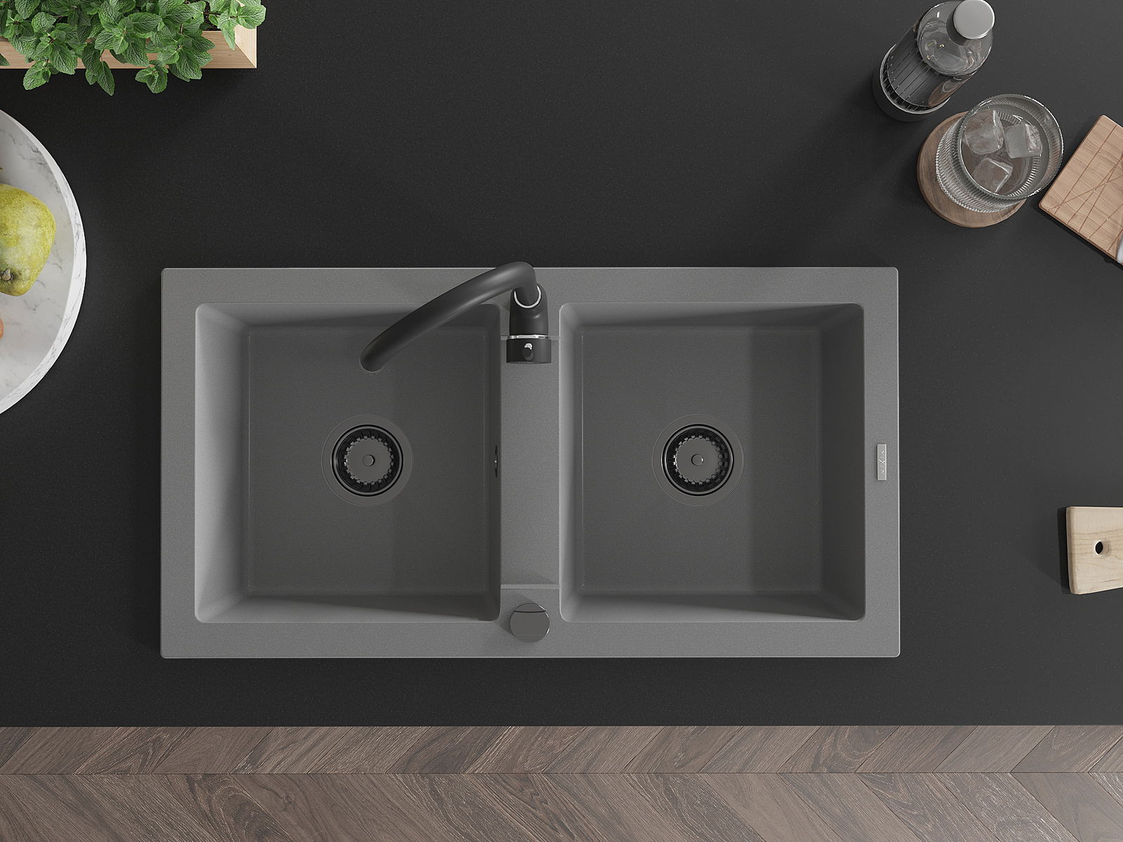 Mexen Mario granito virtuvės kriauklė su dviem kameromis ir virtuviniu maišytuvu Telma, pilka - 6504-71-670200-70-B