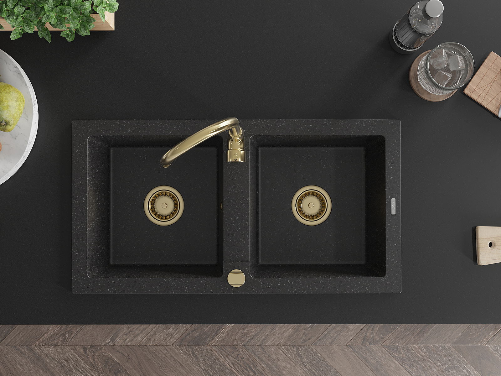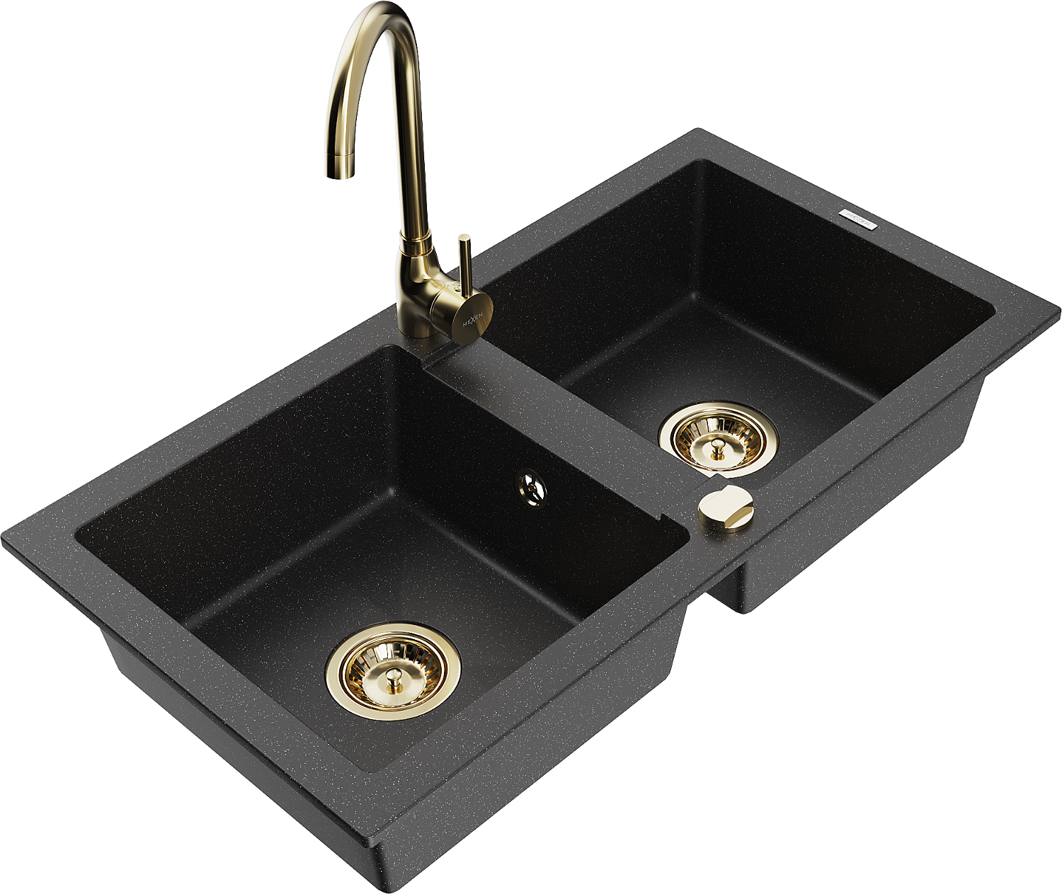 Mexen Mario granitinis dviejų kamerų plautuvė su virtuviniu maišytuvu Telma, juoda/sidabrinė - 6504-73-670200-50