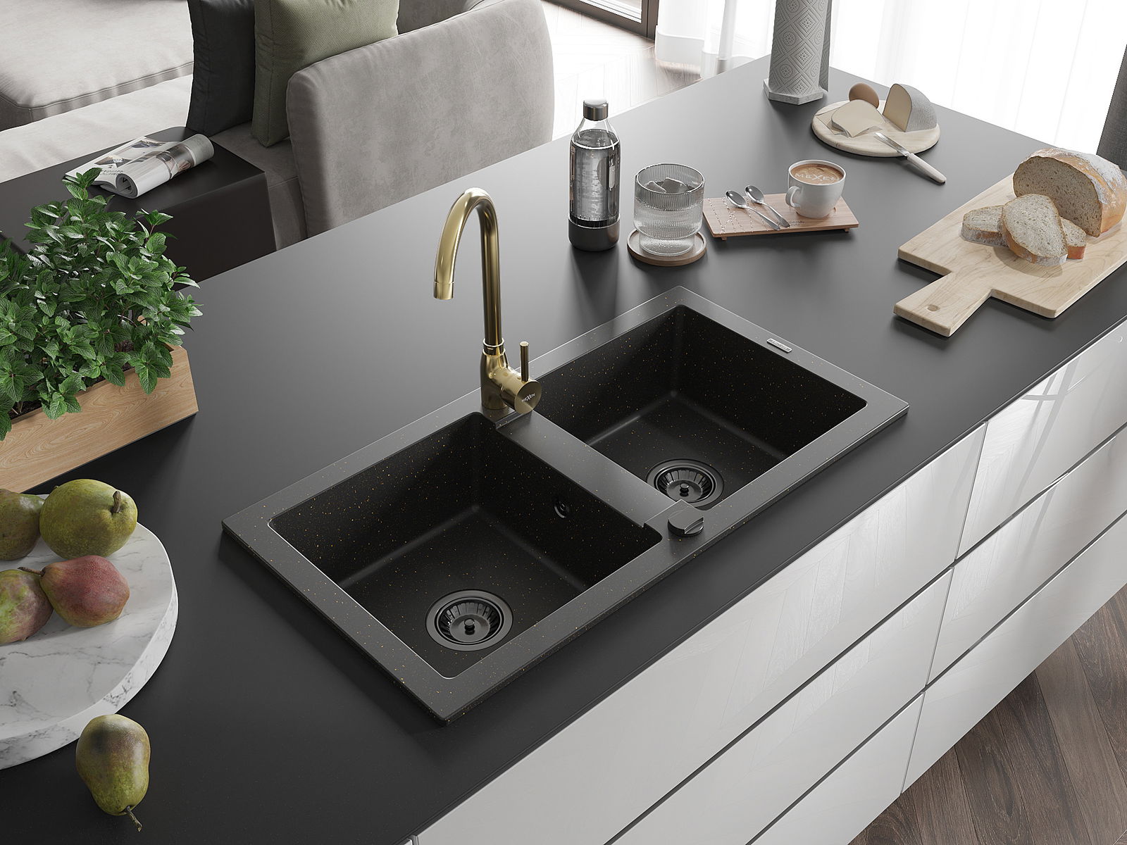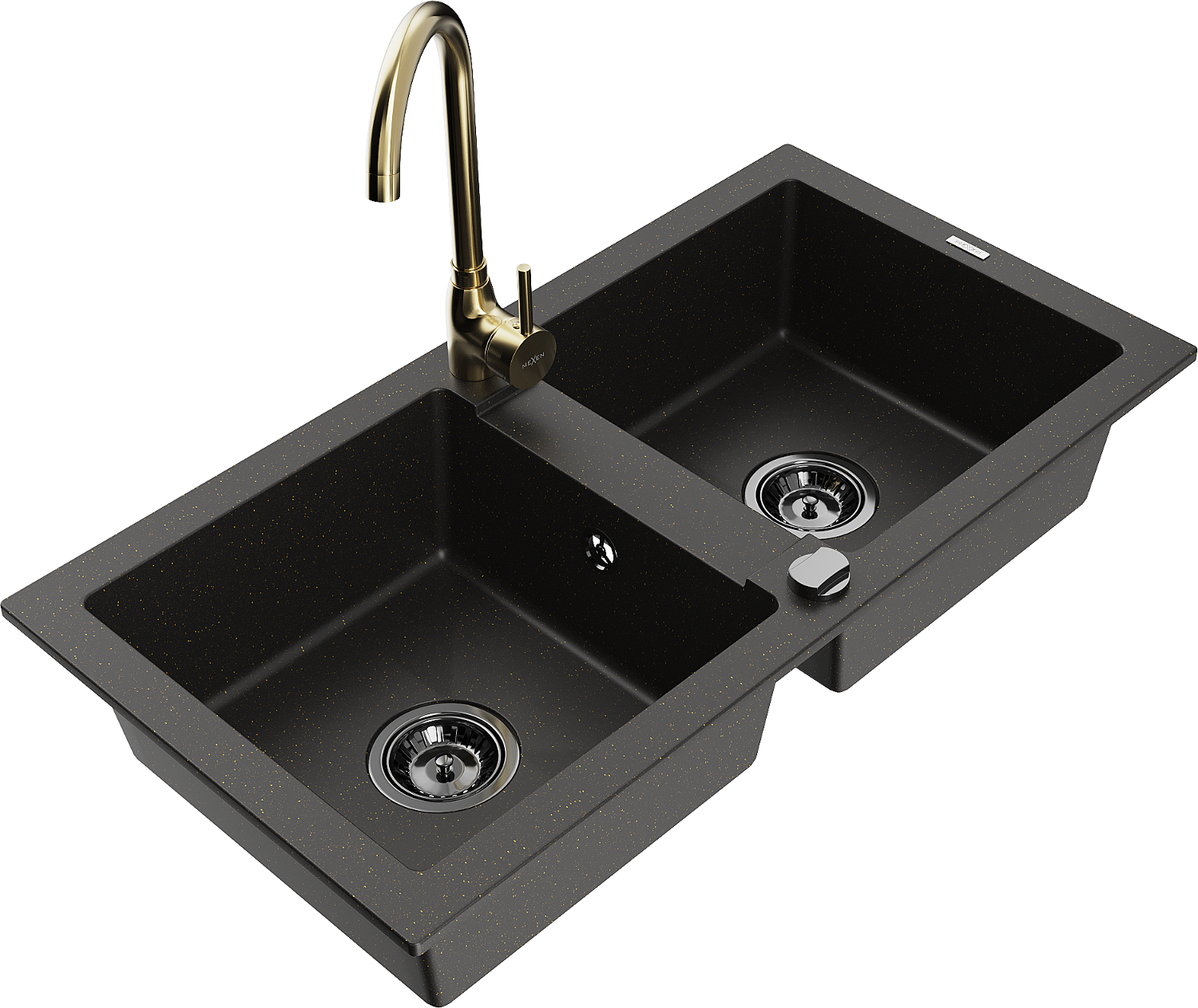 Mexen Mario granito kriauklė 2-jų skyrių su virtuvės maišytuvu Telma, juoda/auksinė - 6504-75-670200-50-B