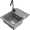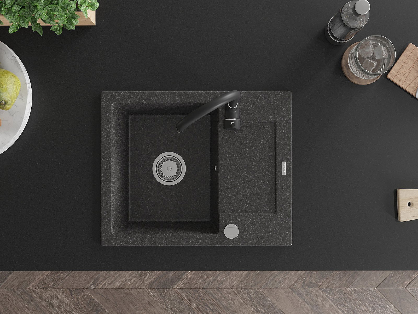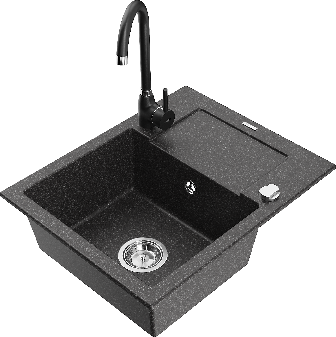 Mexen Enzo granitinė plautuvė su vienu dubeniu, drenažo sistema ir virtuviniu maišytuvu Telma, juoda dėmėta