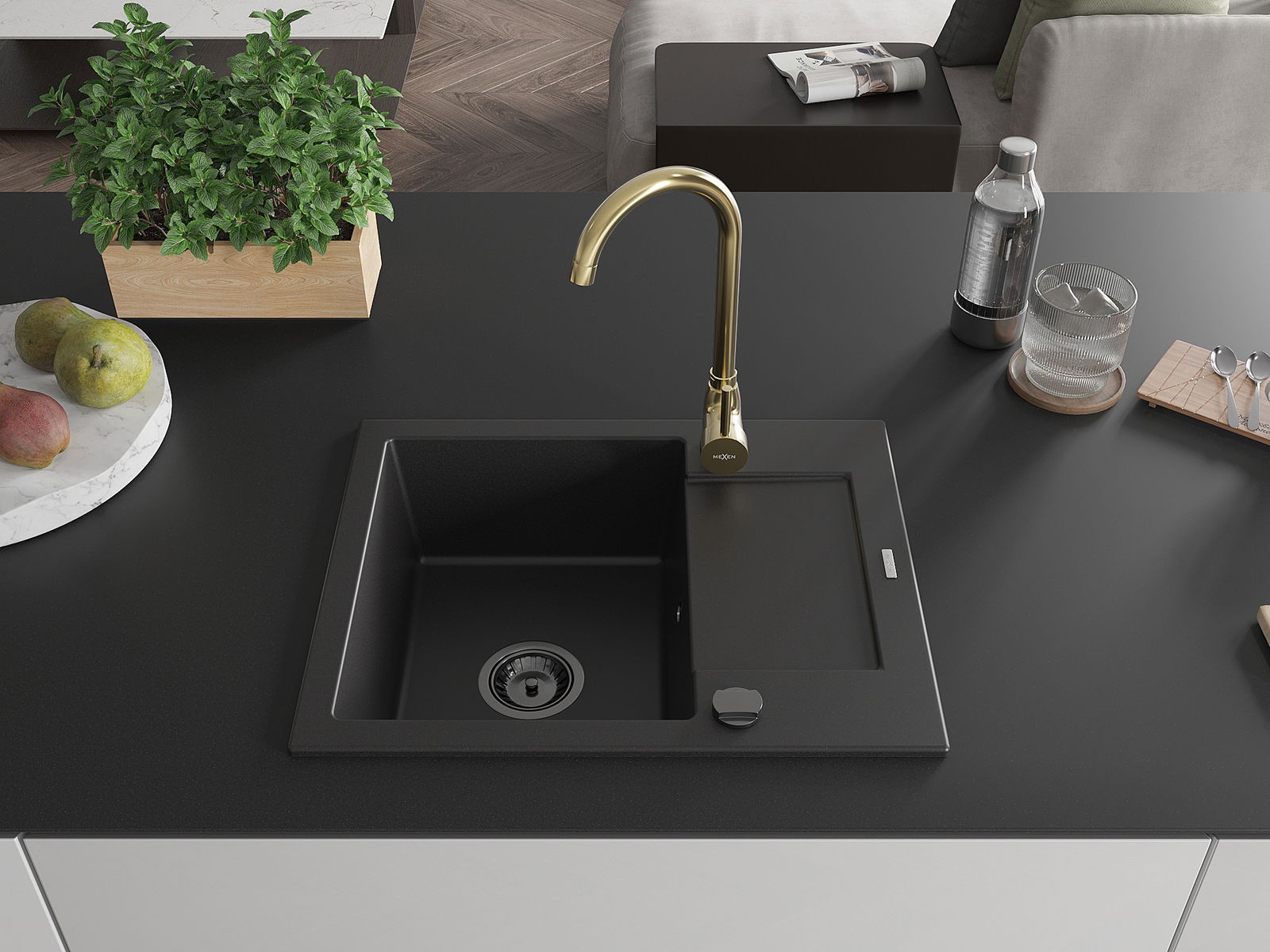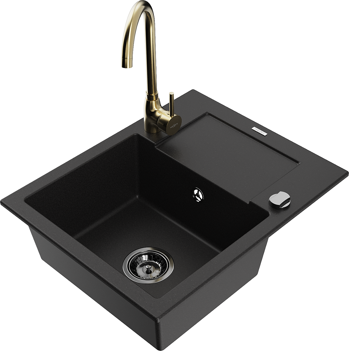 Mexen Enzo vienos dubens granitinė virtuvinė plautuvė su nusausinimo zona ir Telma maišytuvu, juoda - 6506-77-670200-50-B