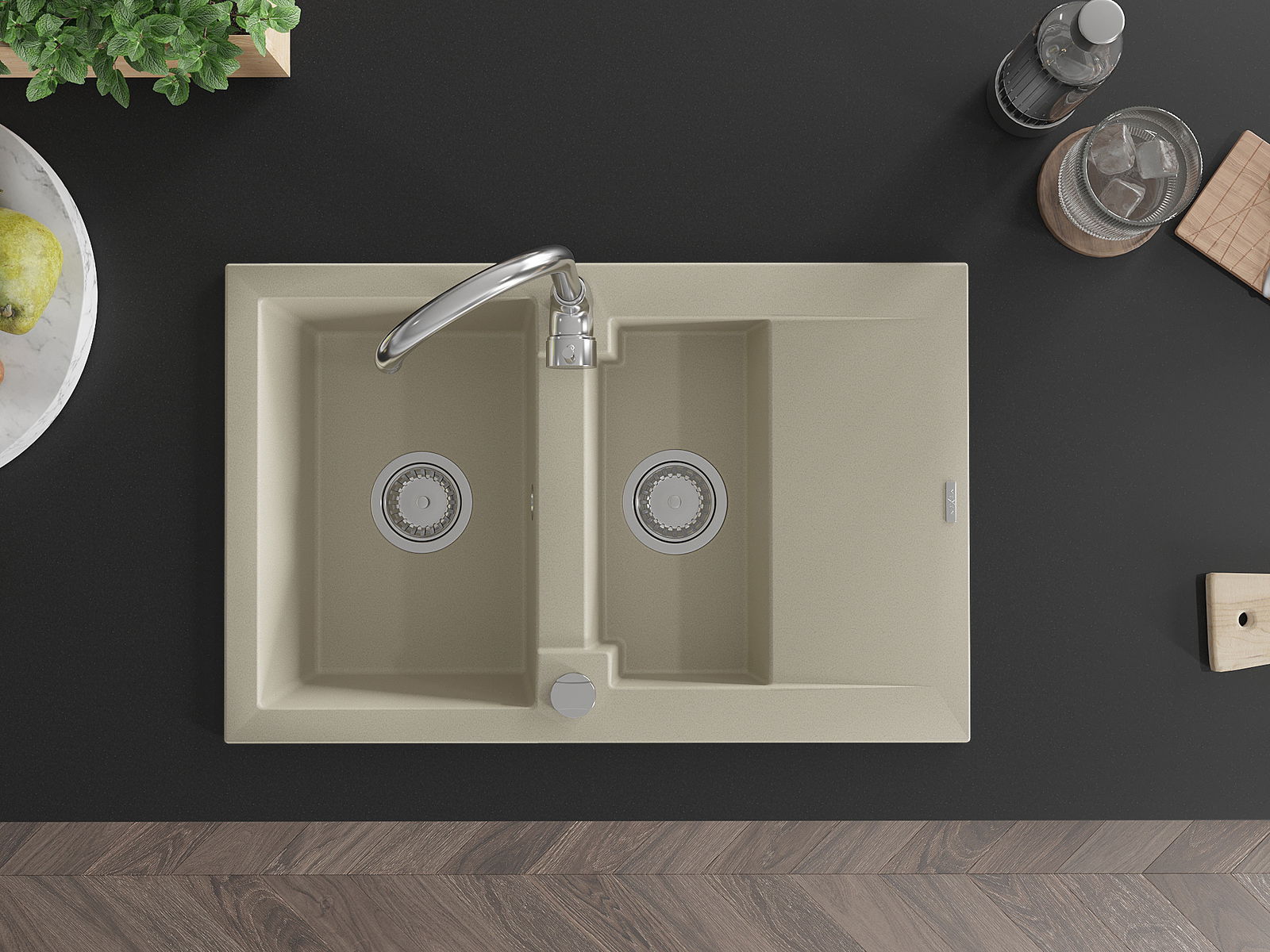 Mexen Gaspar granitinė plautuvė 1,5-skyrių su nusausinimo zona ir virtuviniu maišytuvu Telma, smėlinė - 6507-69-670200-00