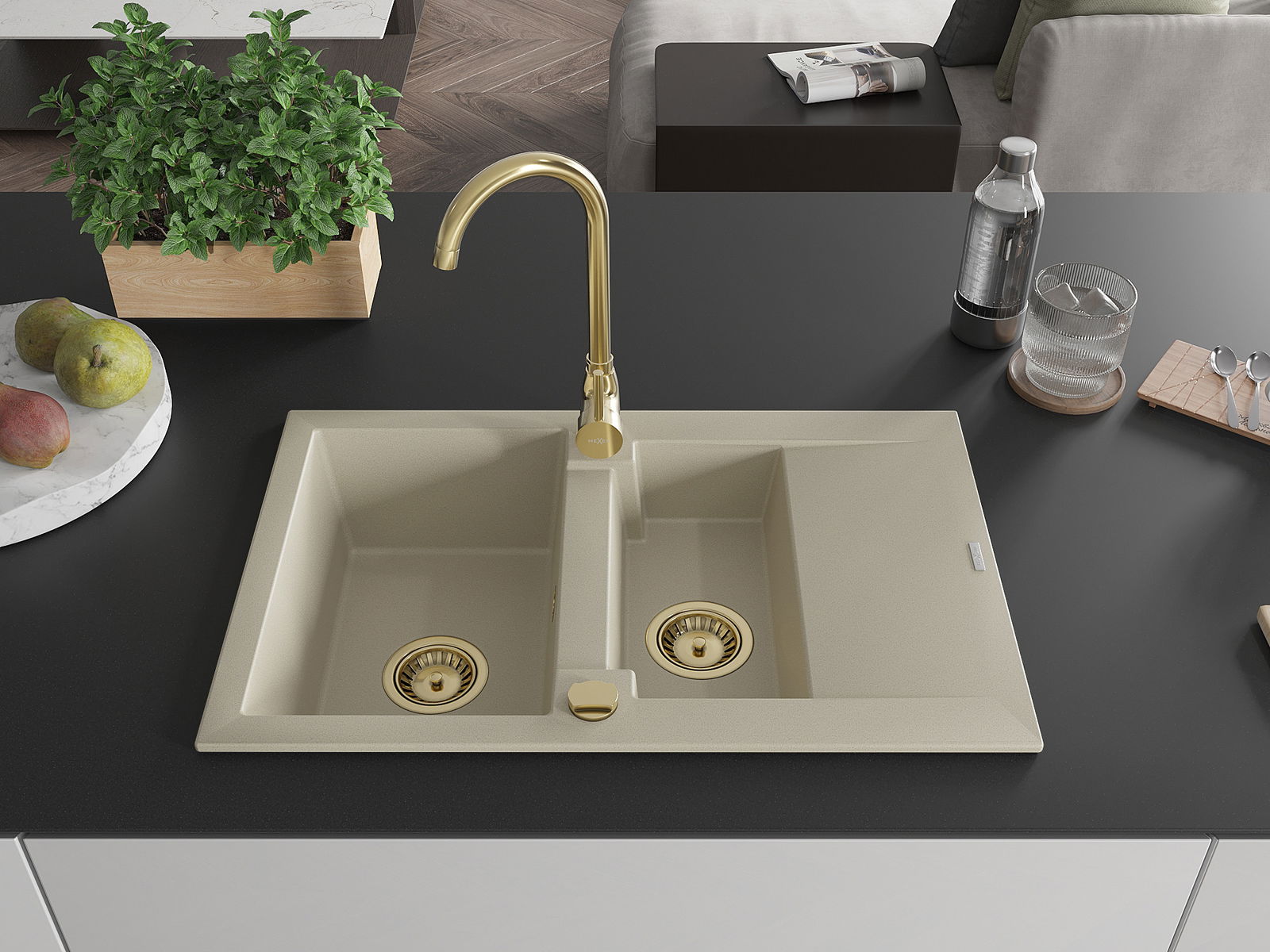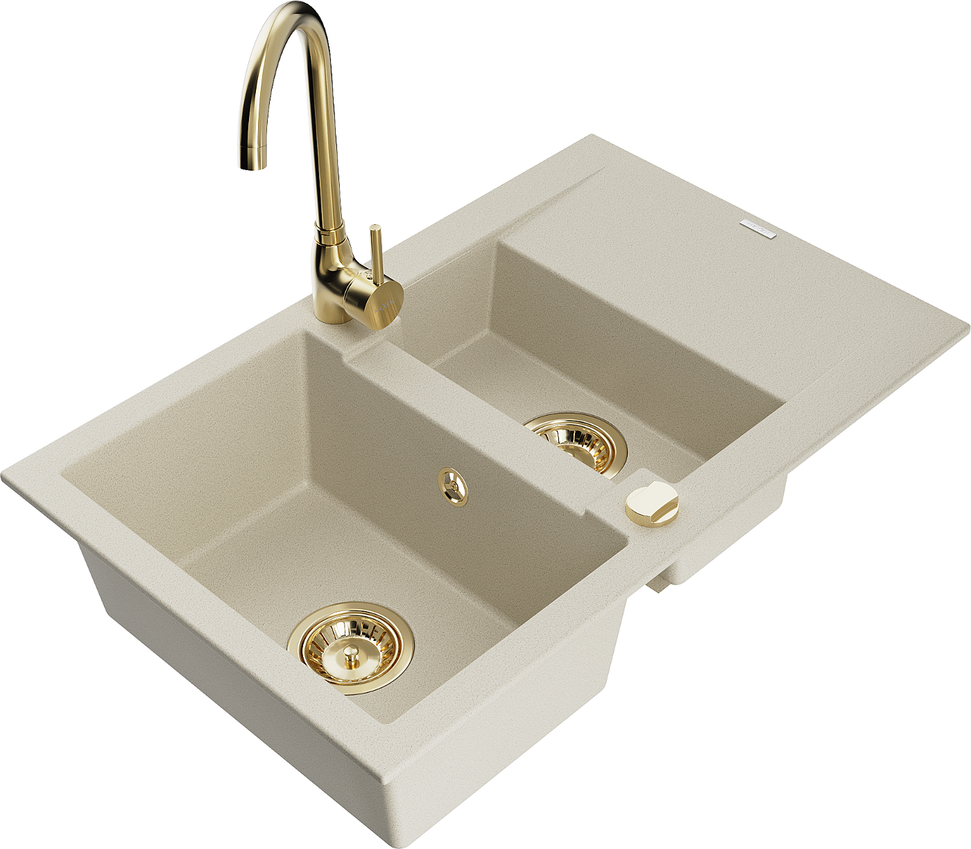 Mexen Gaspar granitinis plautuvė 1,5 kamera su nuvarvėjimo paviršiumi ir virtuviniu maišytuvu Telma, smėlio - 6507-69-670200-50