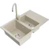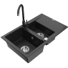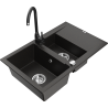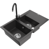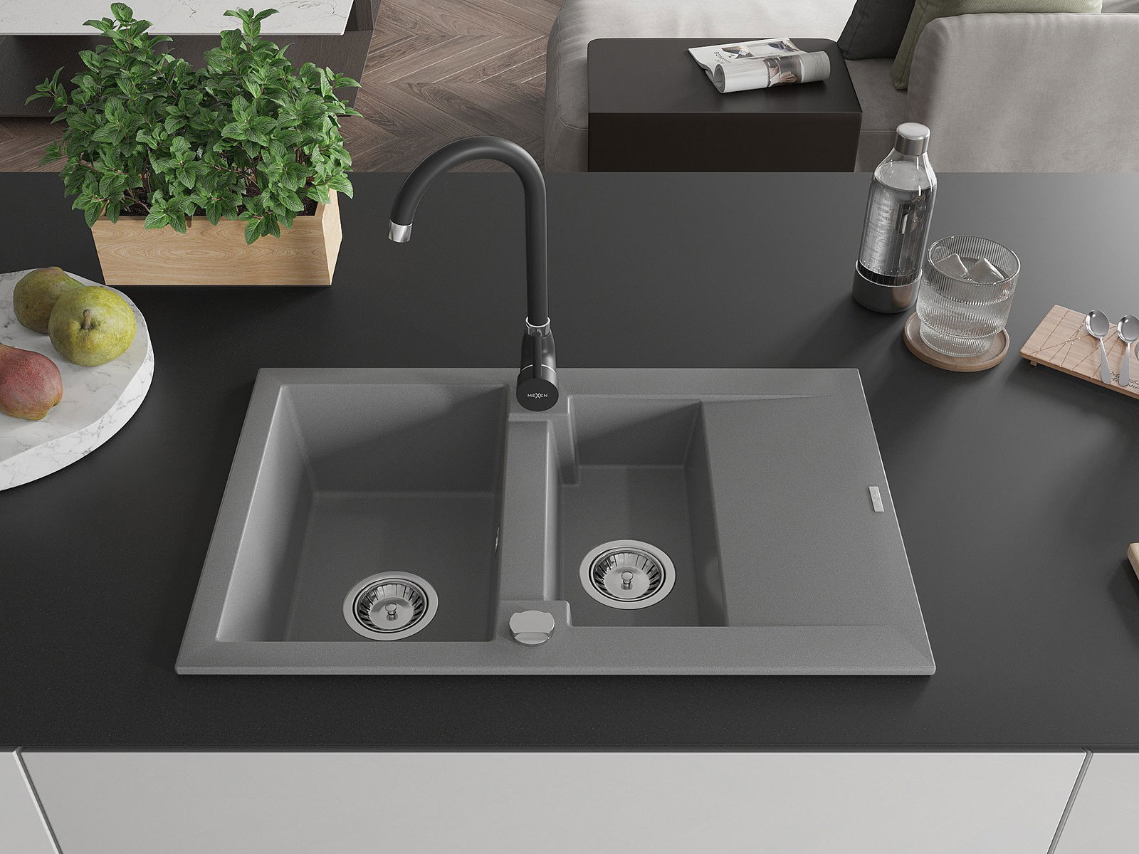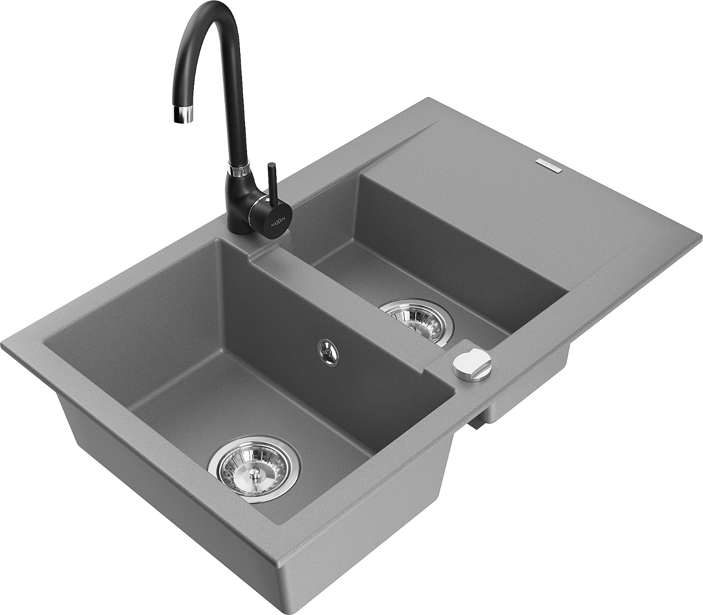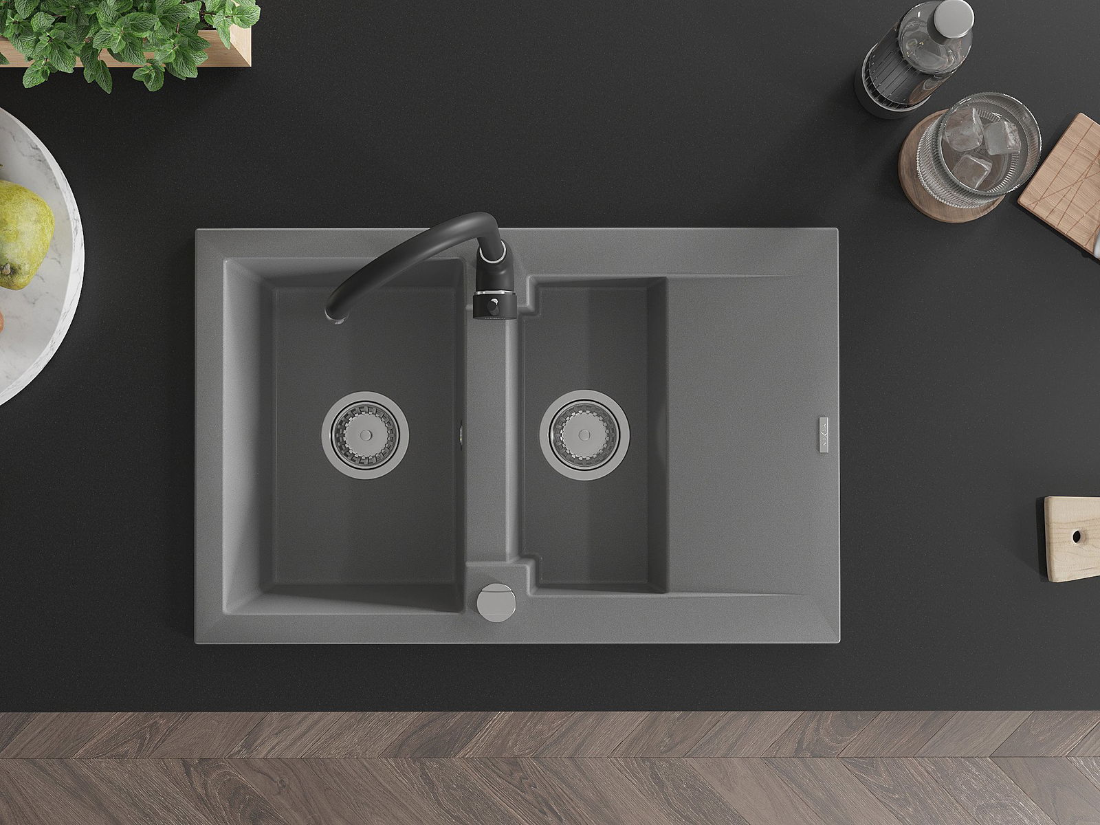 Mexen Gaspar grindinis granitinis dviejų sekcijų plautuvas su nusausinimo padėklu ir virtuviniu maišytuvu Telma, pilkas