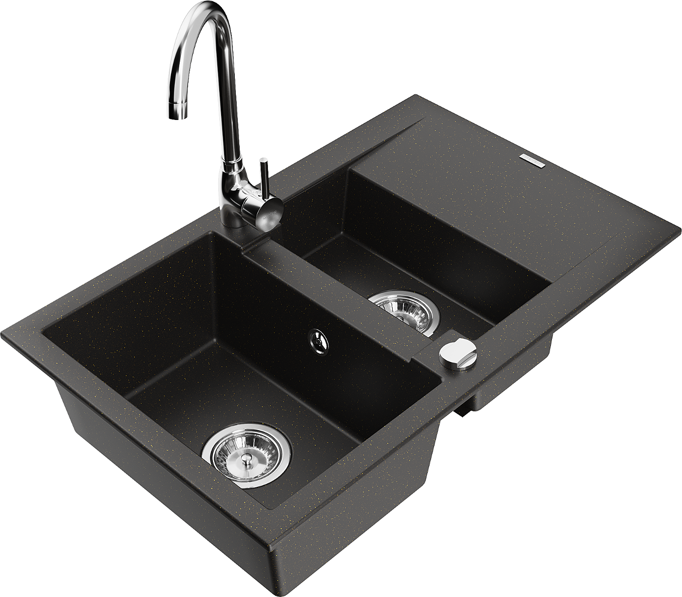 Mexen Gaspar granito plautuvė 1,5-kamerų su nusausintuvu ir virtuvės maišytuvu Telma, juodas/auksinis - 6507-75-670200-00