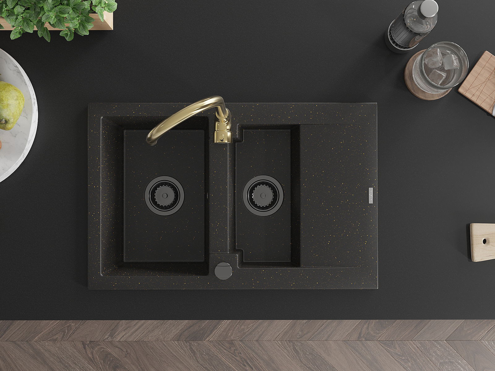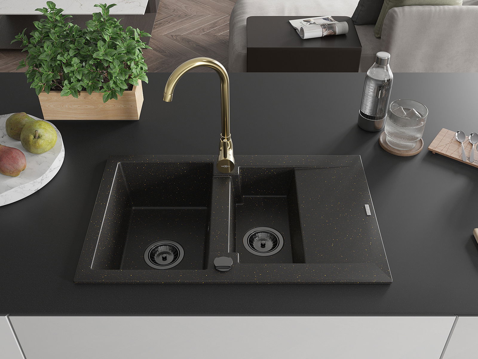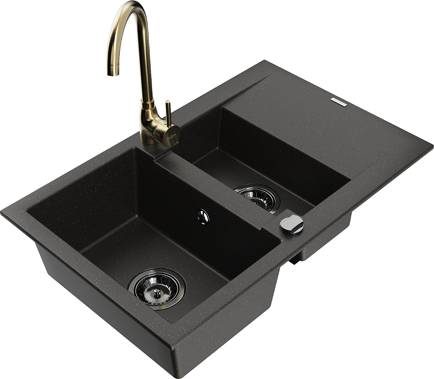 Mexen Gaspar 1,5 skyrių granitinė kriauklė su nusausintuvu ir Telma virtuviniu maišytuvu, juoda/aukso - 6507-75-670200-50-B