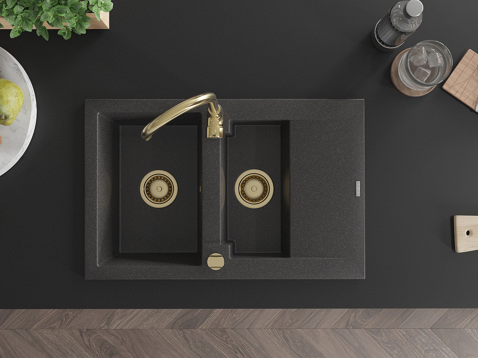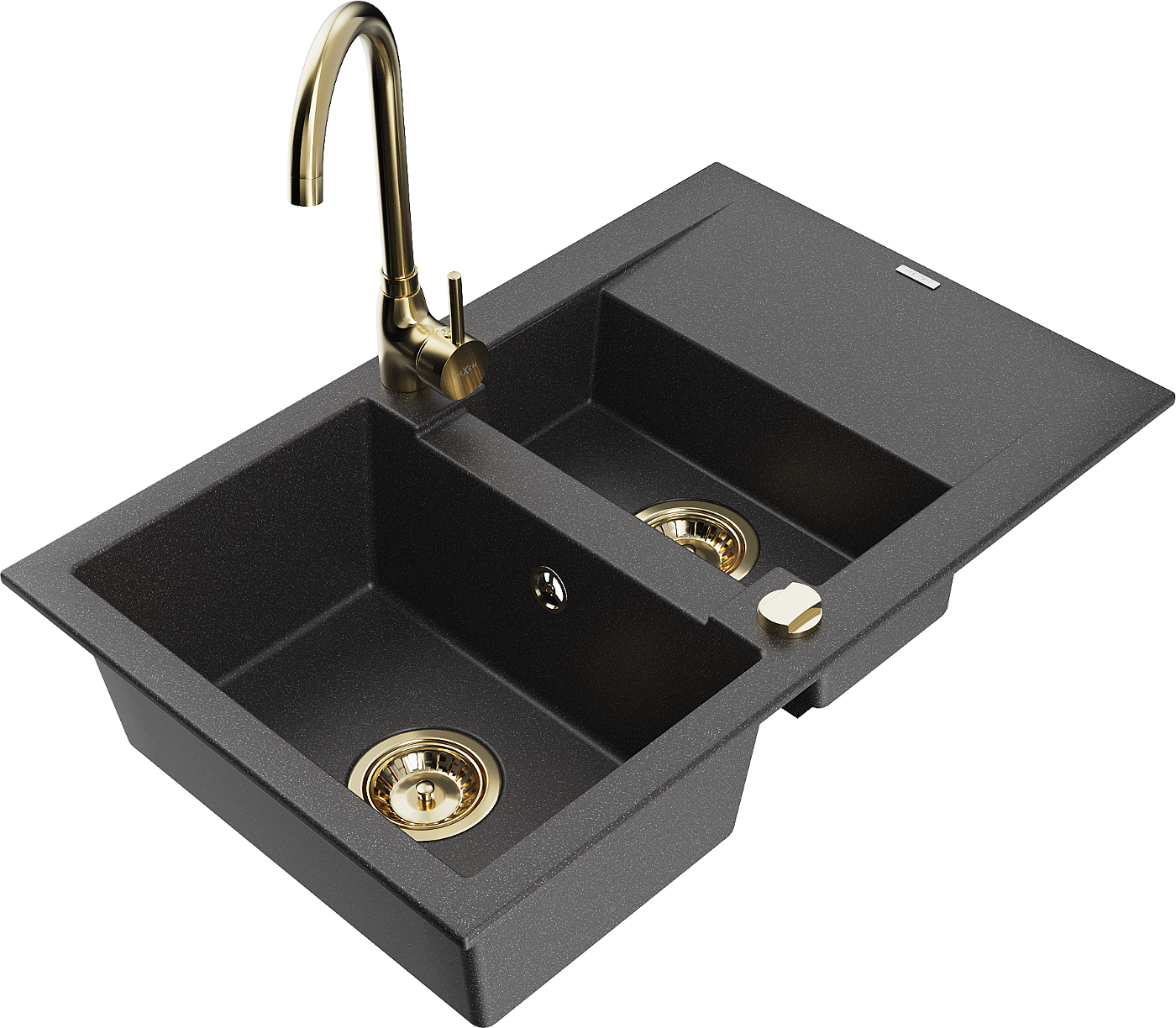 Mexen Gaspar granito plautuvė su 1,5 skyriumi, su nusausintuvu ir Telma virtuviniu maišytuvu, juoda taškuota