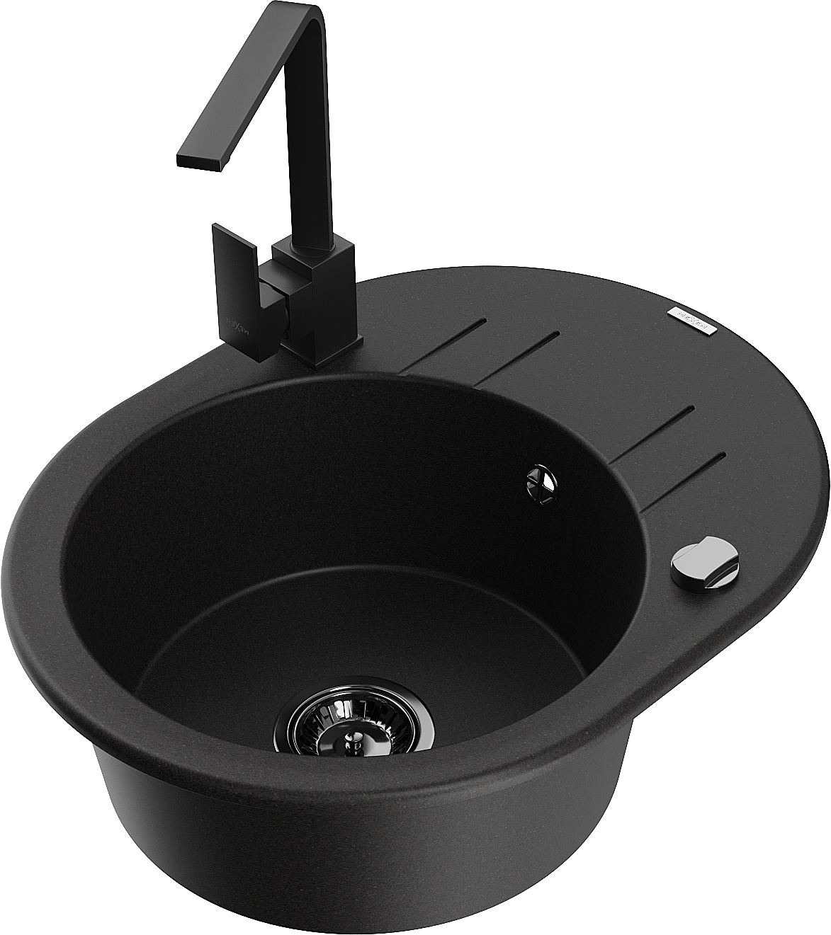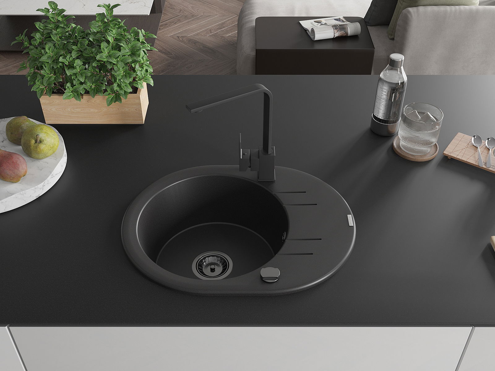 Mexen Kevin granitinė 1 skyrelio kriauklė su nusausintuvu ir virtuviniu maišytuvu Rita, juoda - 6517-77-670300-70-B