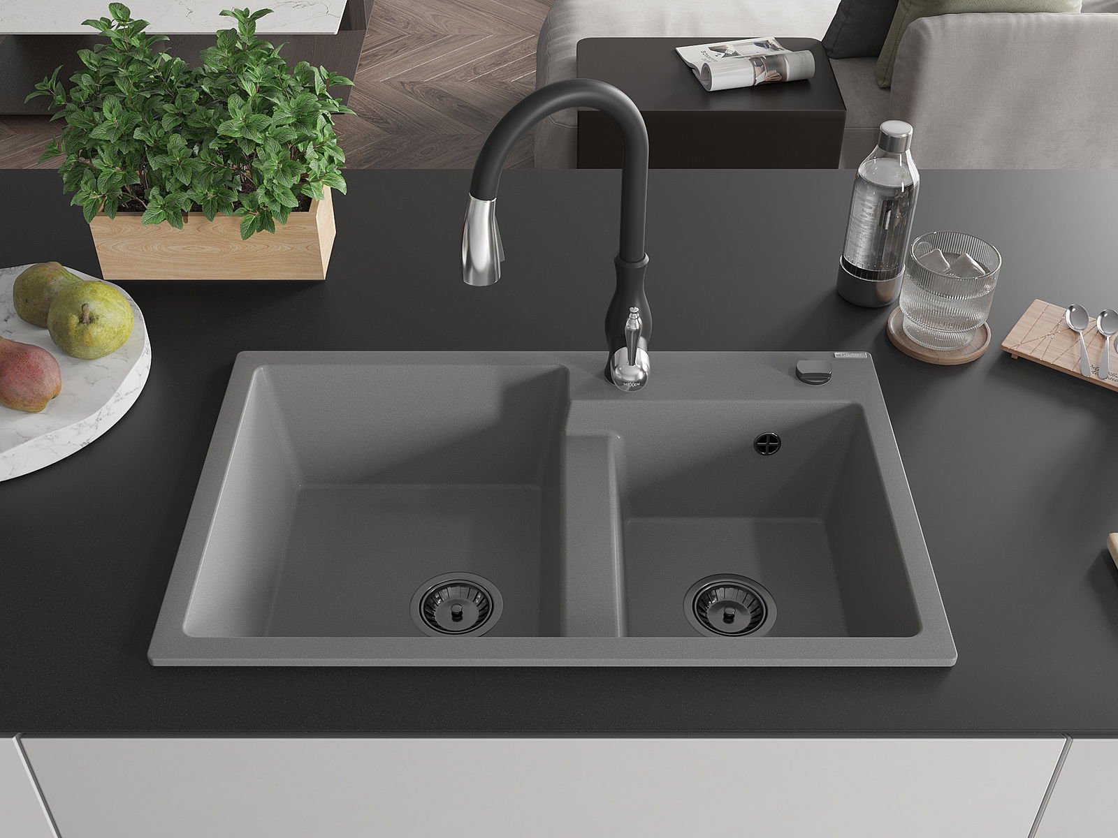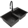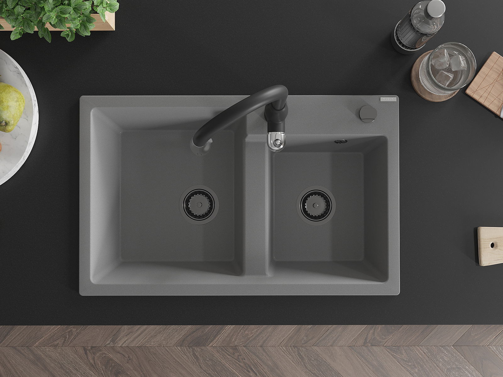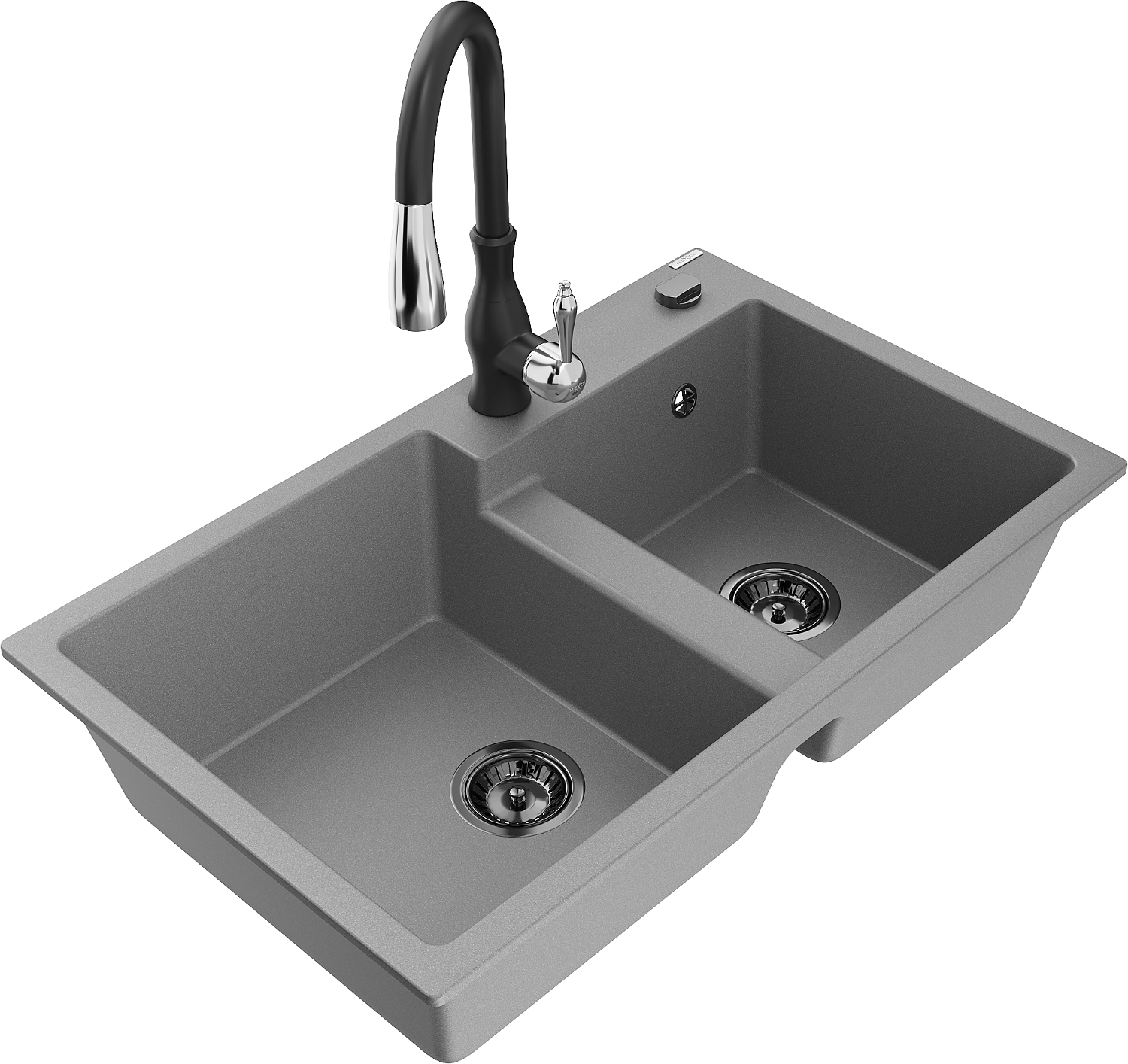 Mexen Tomas granitinė dviejų skyrių virtuvės plautuvė su maišytuvu Savita, pilka - 6516-71-672601-70-B