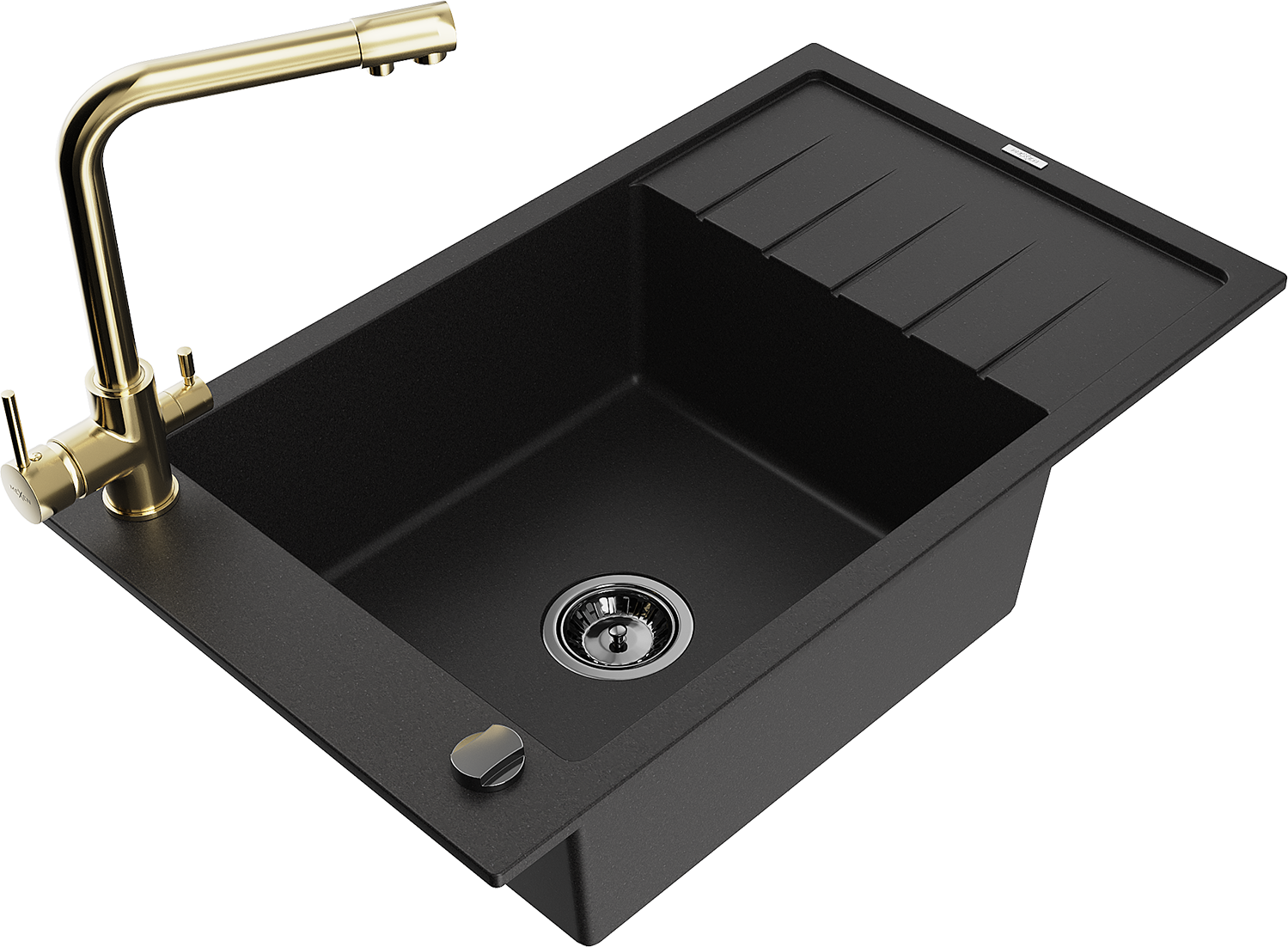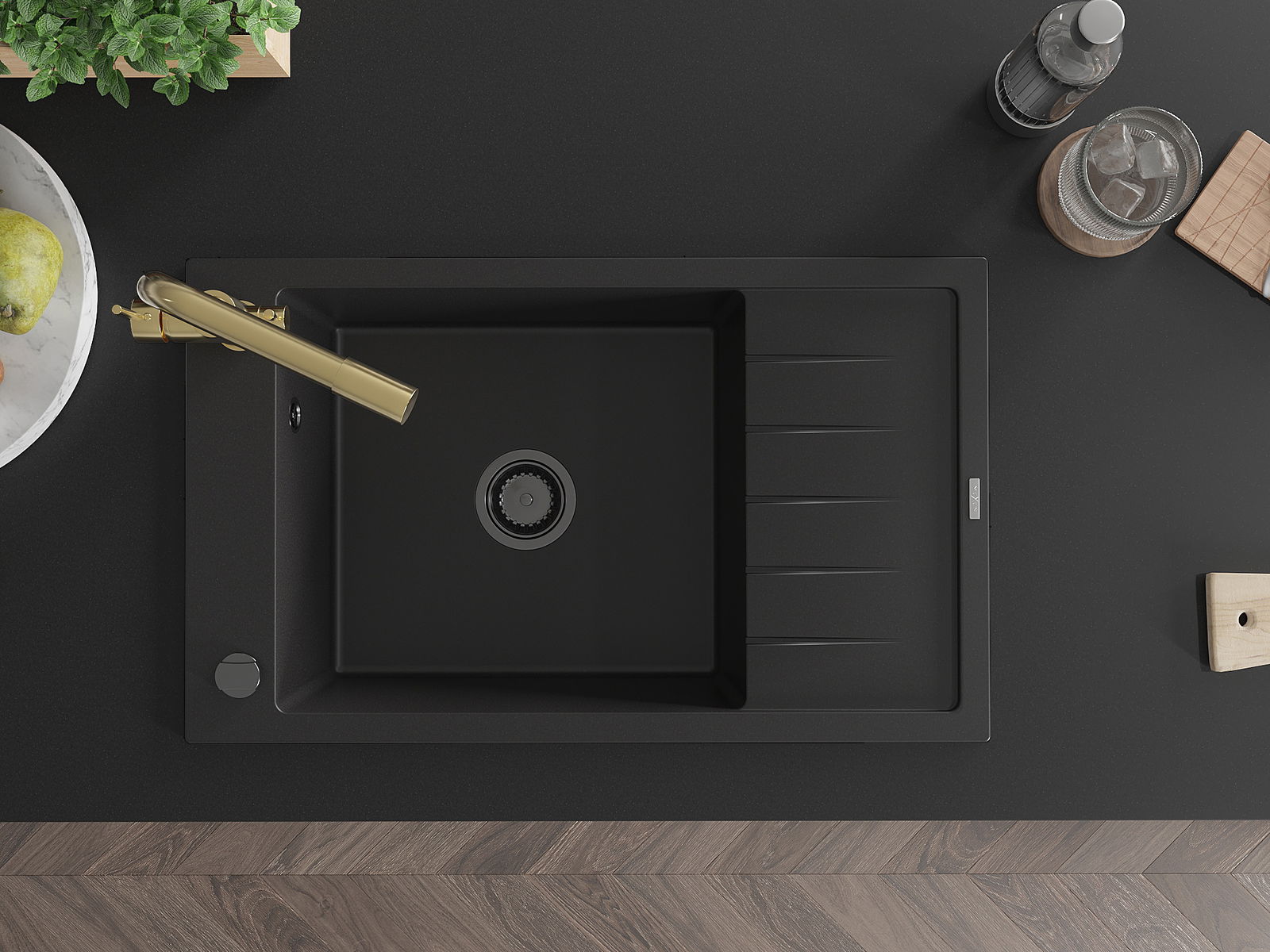 Mexen Elias granitinė kriauklė su 1 skyriumi, lašintuvas ir virtuviniu maišytuvu Duero, juoda - 6511-77-671600-50-B