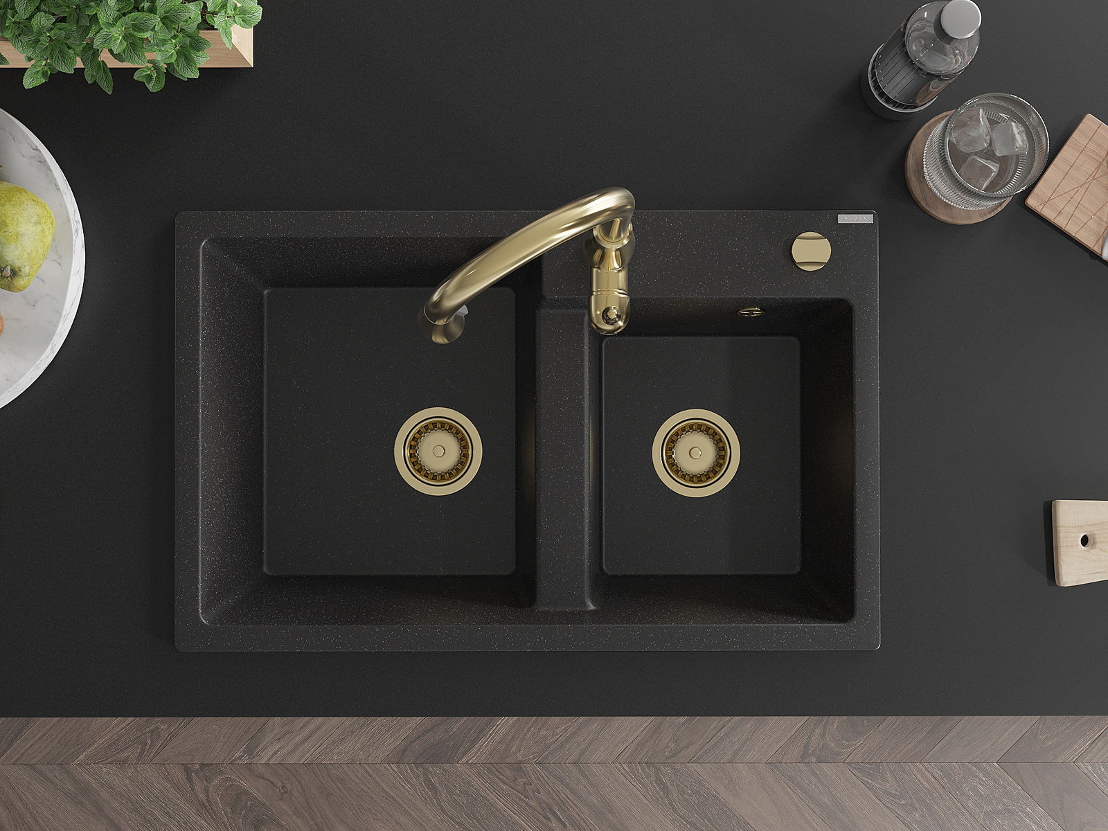 Mexen Tomas granito plautuvė 2 skylių su virtuvės maišytuvu Savita, juodas/sidabrinis metalikas - 6516-73-672601-50