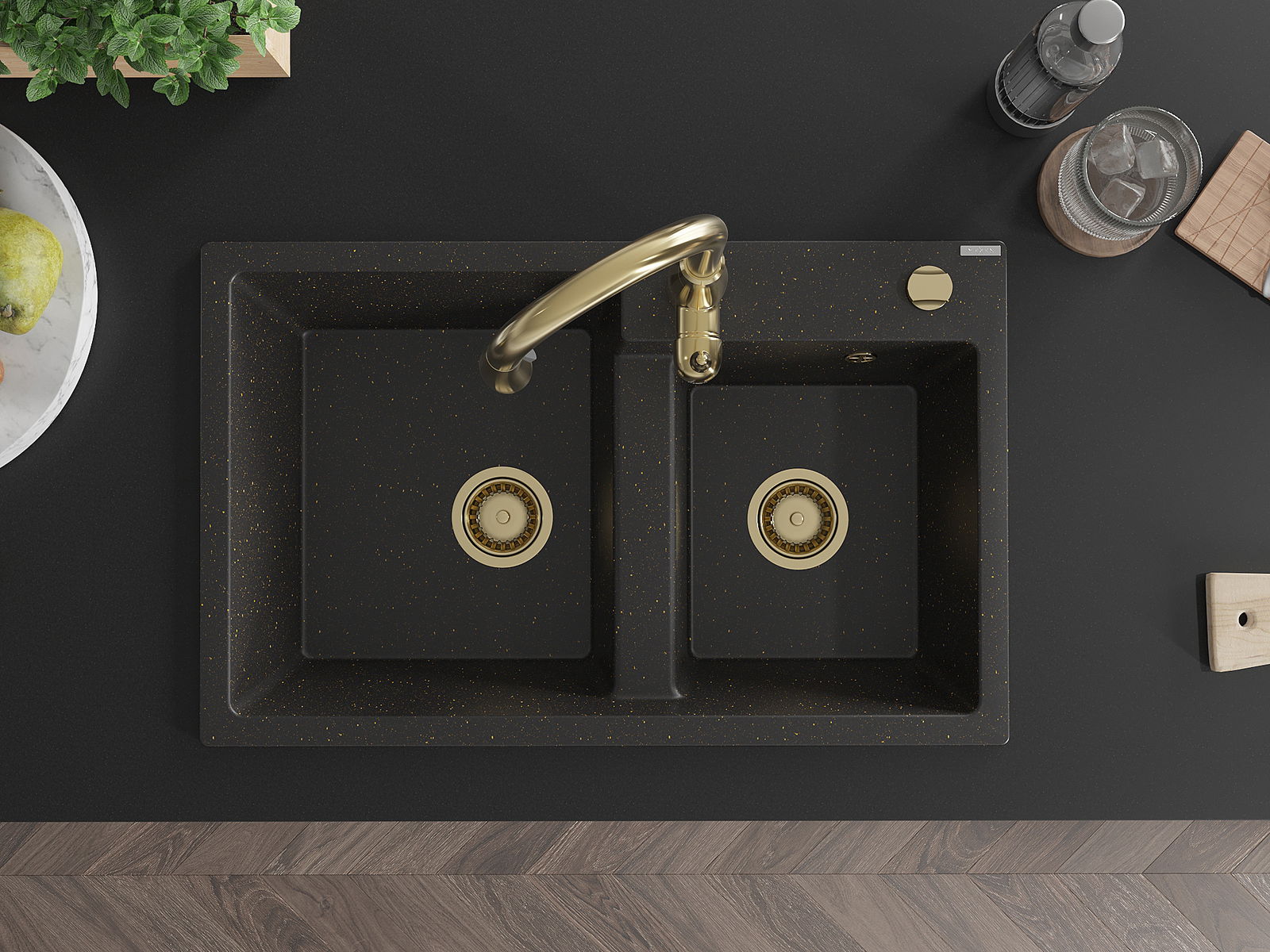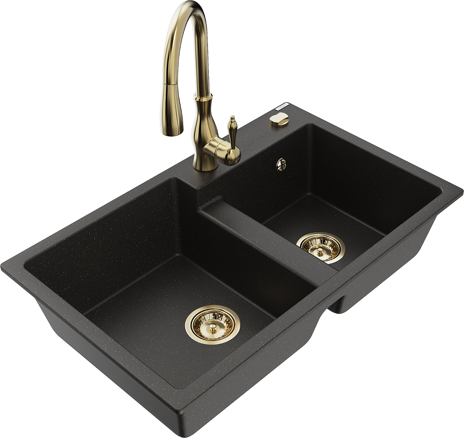 Mexen Tomas granitinis dviejų skylių plautuvas su virtuviniu maišytuvu Savita, juodas/auksinis metalas - 6516-75-672601-50