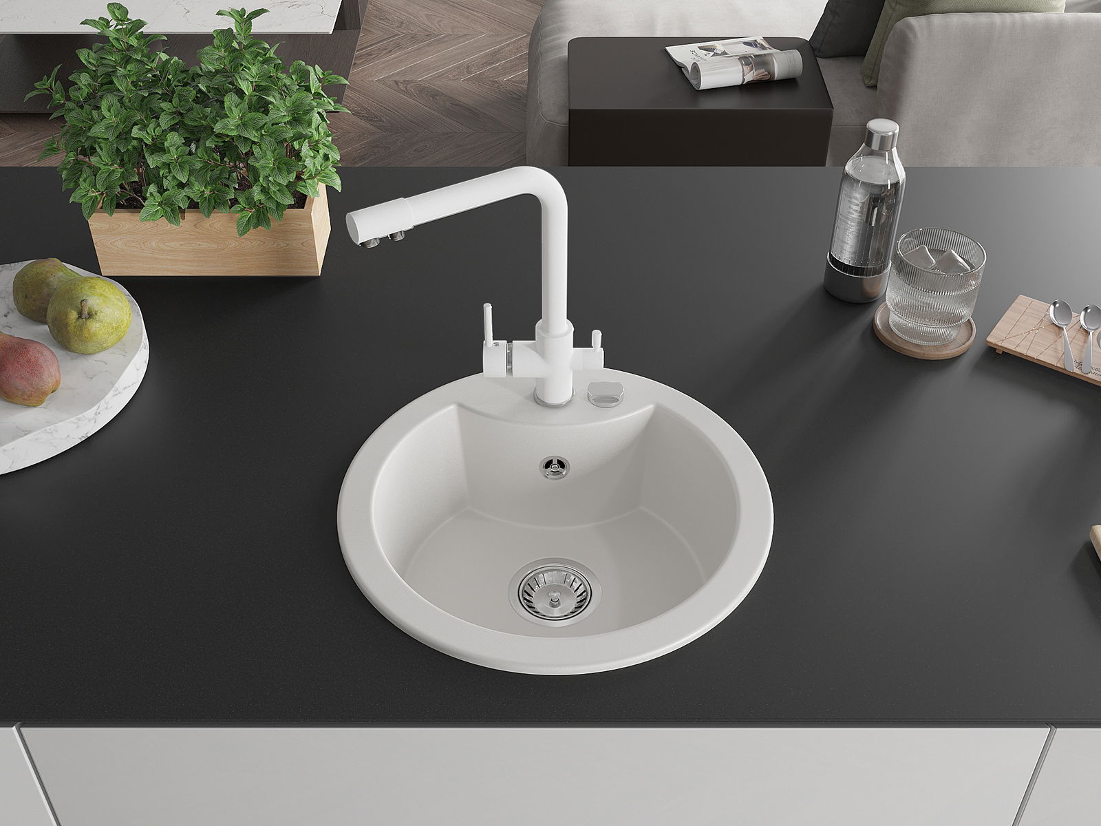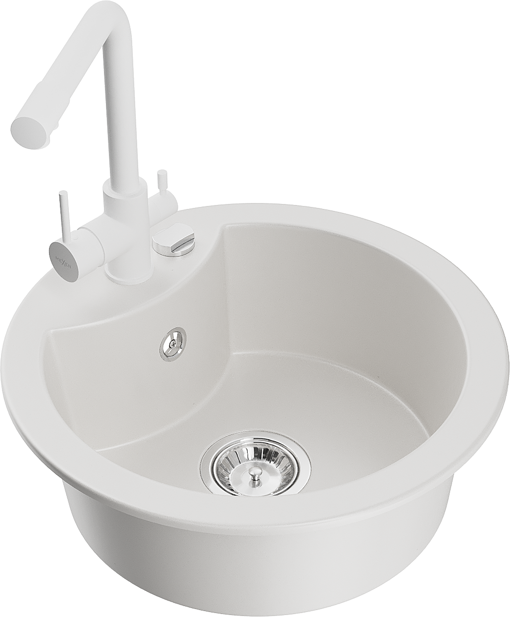 Mexen Diego granito plautuvė 1 skyrius su virtuvės čiaupu Duero, balta - 6512-20-671600-20