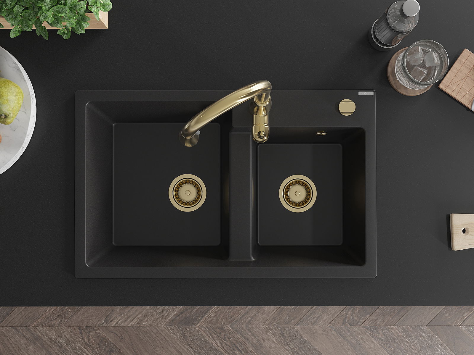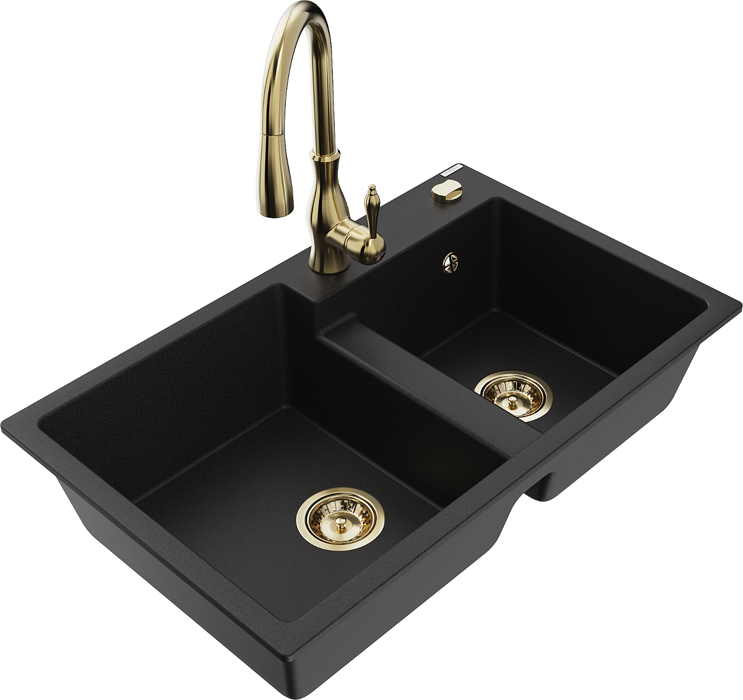 Mexen Tomas granitinis plautuvės su dviem kameromis ir virtuviniu maišytuvu Savita, juodas - 6516-77-672601-50