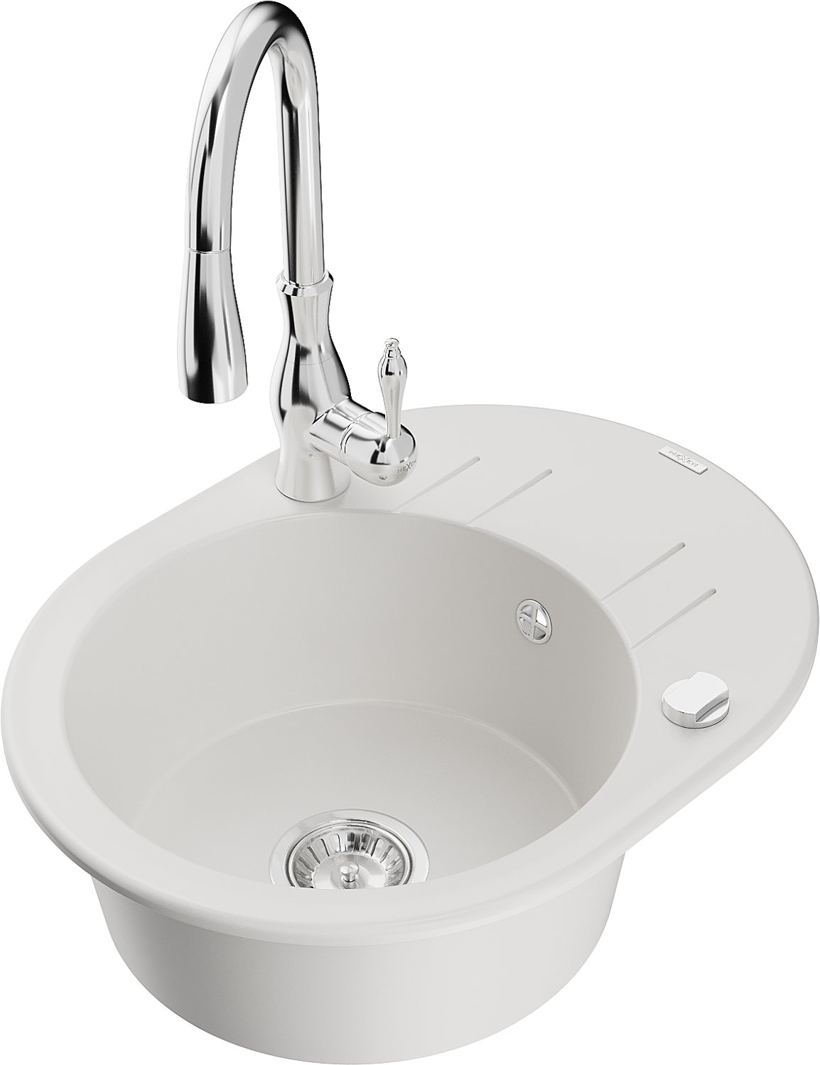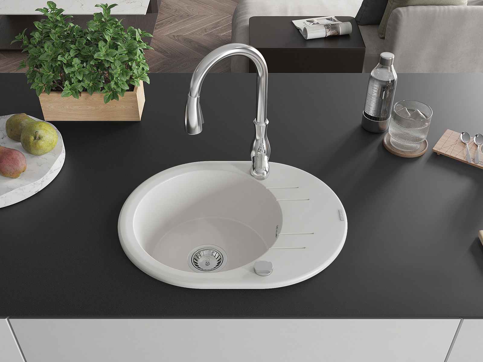 Mexen Kevin granitinė vienos sekcijos plautuvė su nutekėjimu ir virtuviniu maišytuvu Savita, balta - 6517-20-672601-00