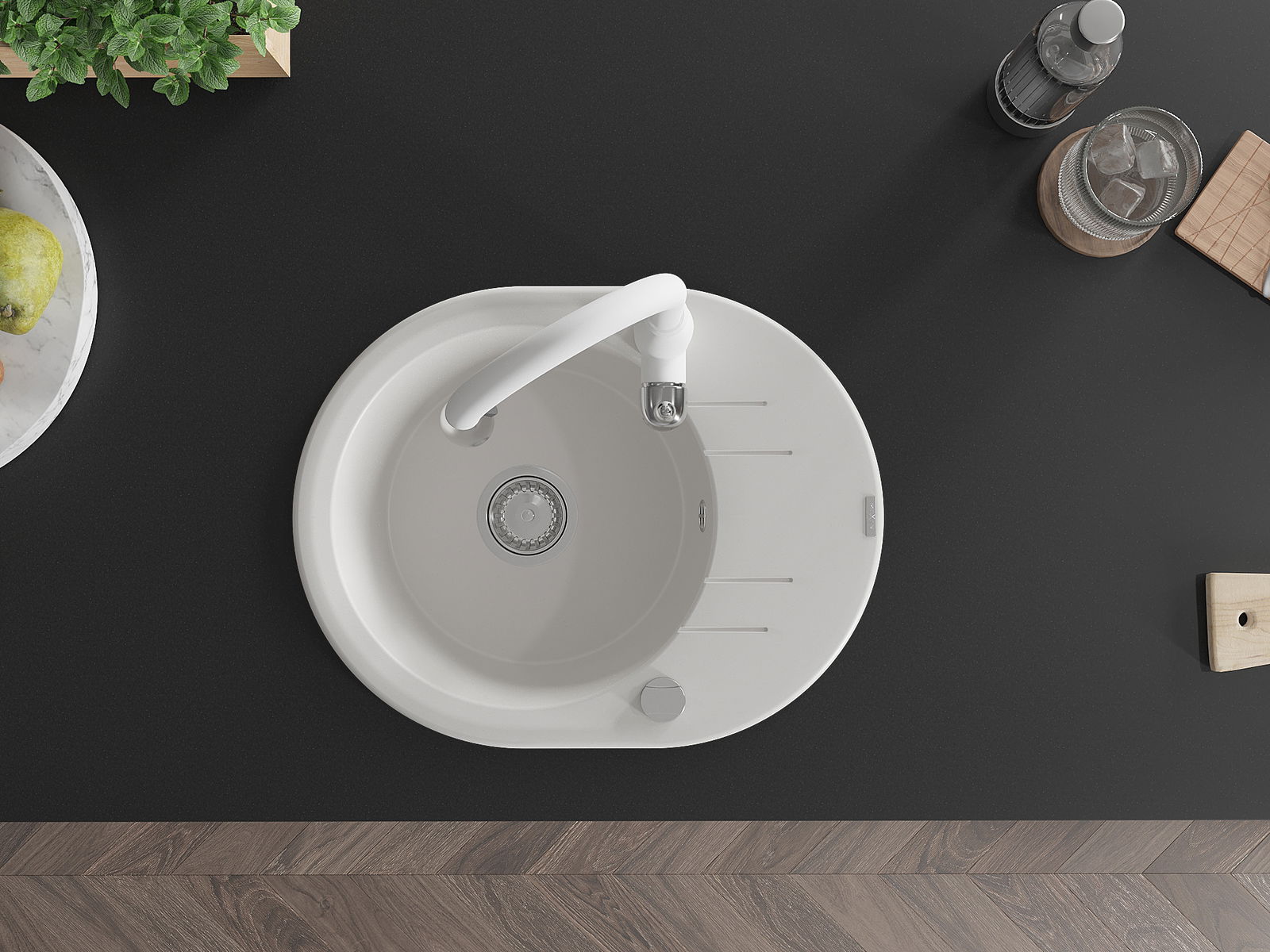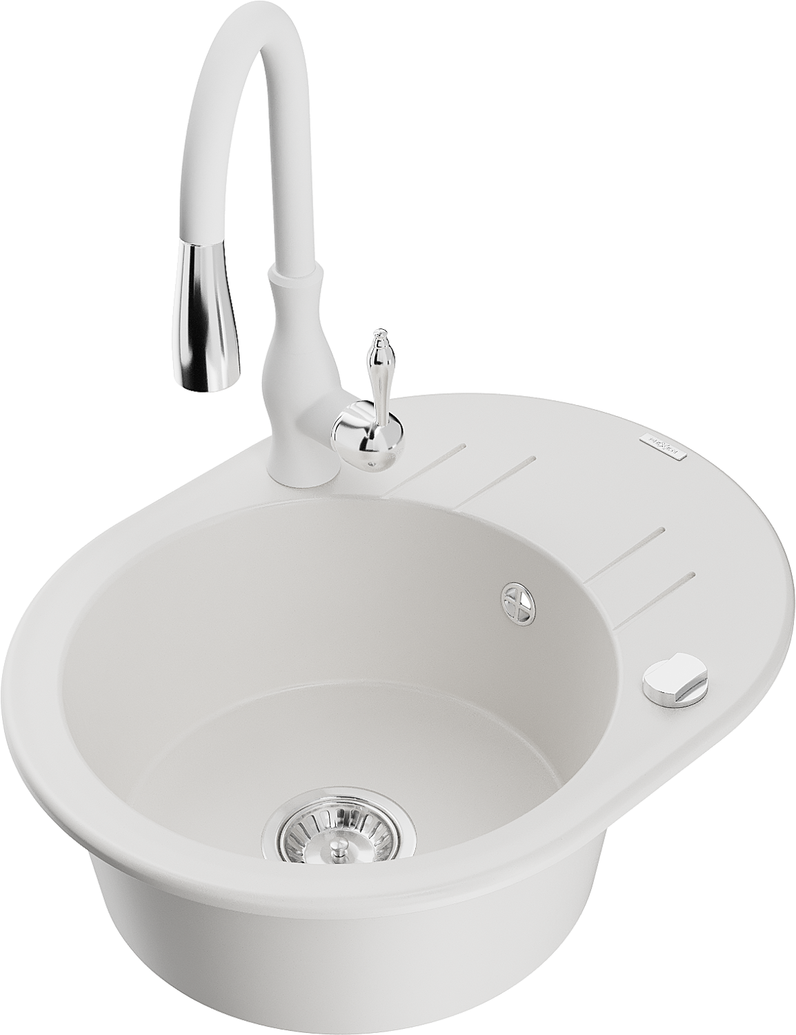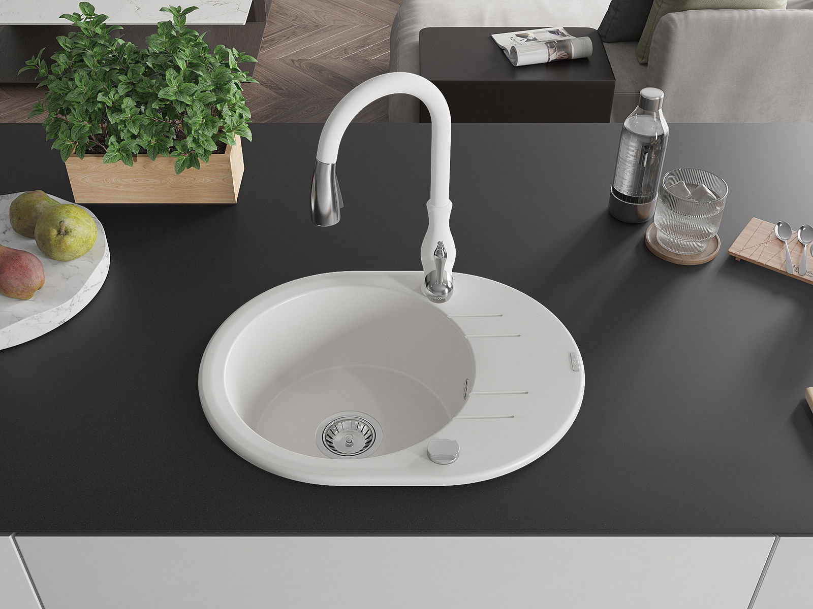 Mexen Kevin vieno dubens granito kriauklė su nutekėjimu ir virtuvės maišytuvu Savita, balta - 6517-20-672601-20