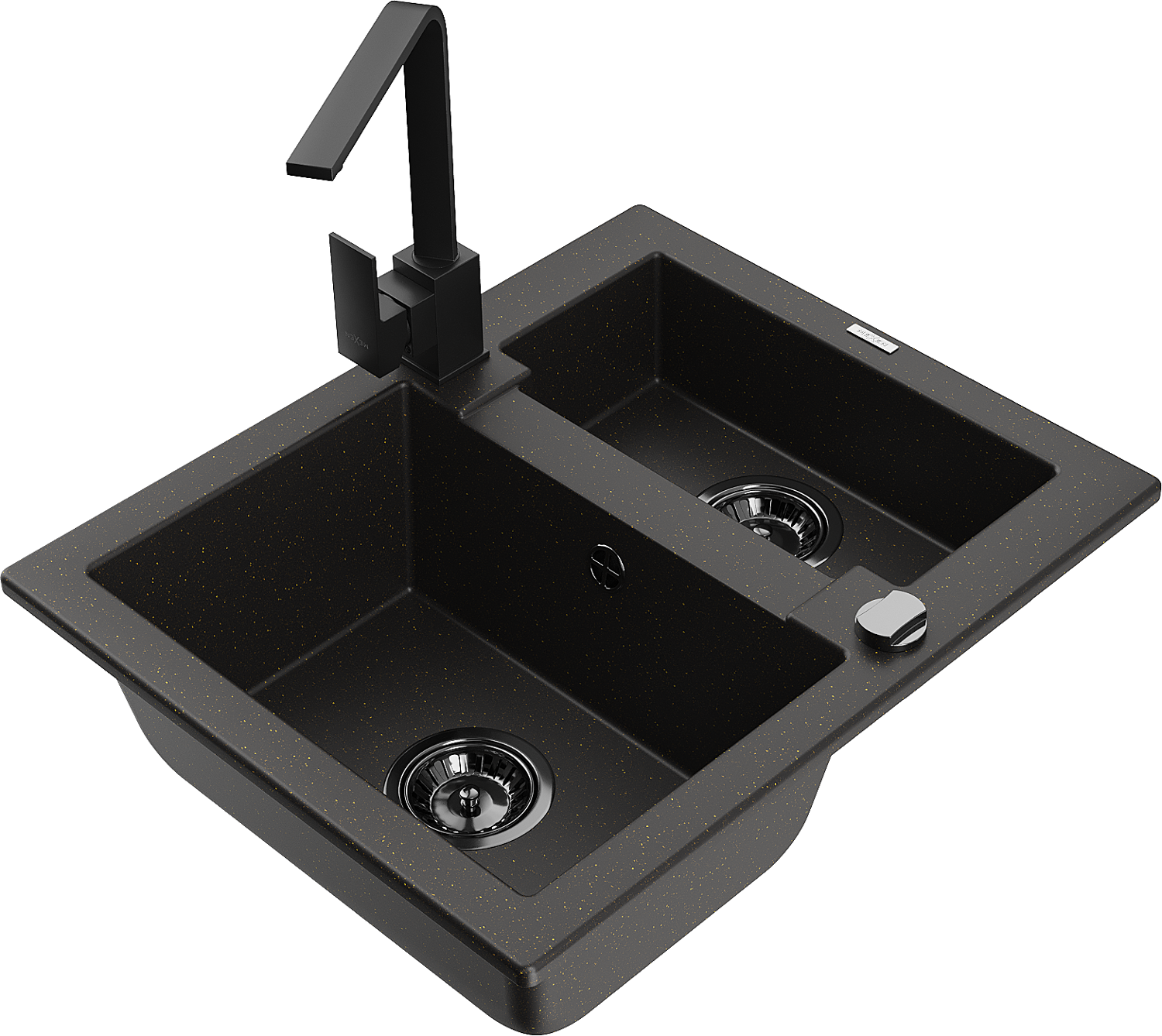 Mexen Carlos granitinis 1,5 skyrių plautuvė su virtuviniu maišytuvu Rita, juoda/auksinis metalikas - 6518-75-670300-70-B