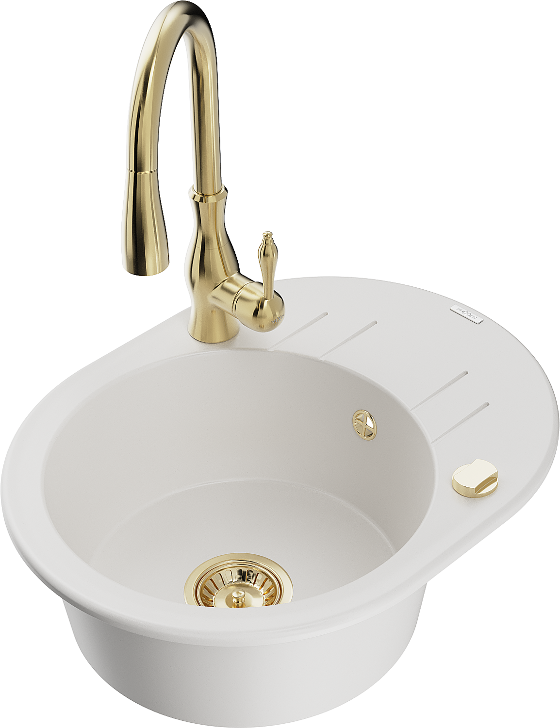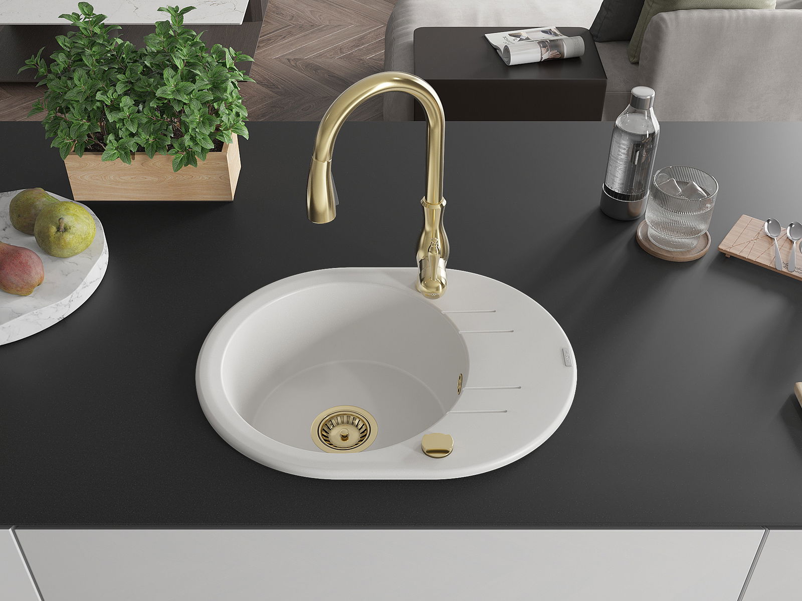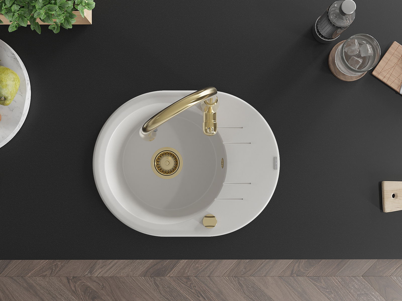 Mexen Kevin granito plautuvė vienos kameros su drenažu ir virtuviniu maišytuvu Savita, balta - 6517-20-672601-50