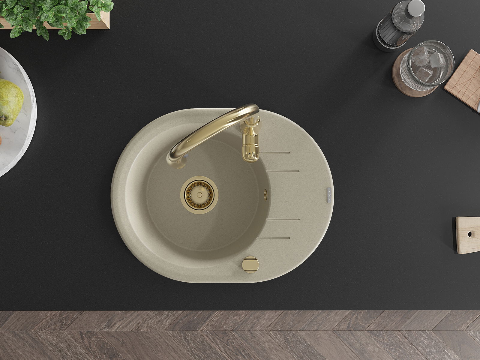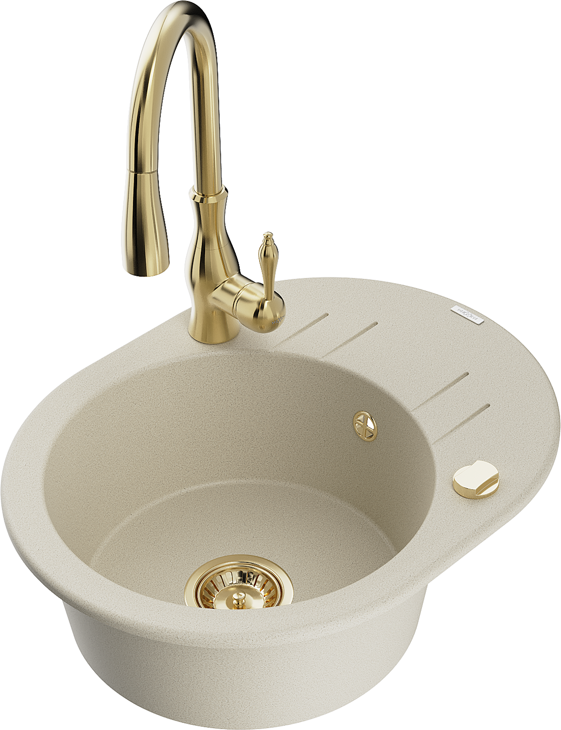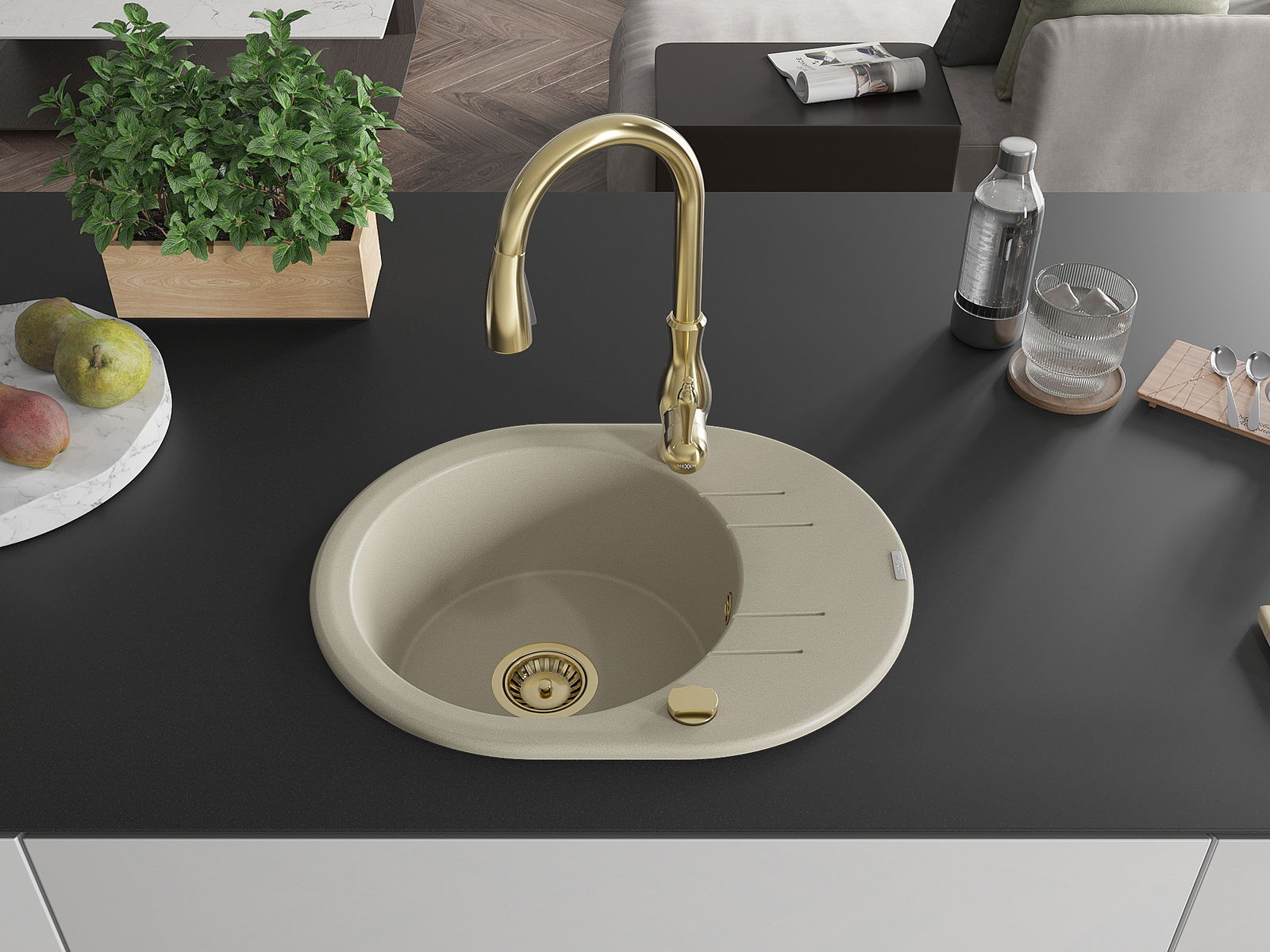 Mexen Kevin granitinė vienos kameros plautuvė su lašintuvu ir virtuvės maišytuvu Savita, smėlio spalvos