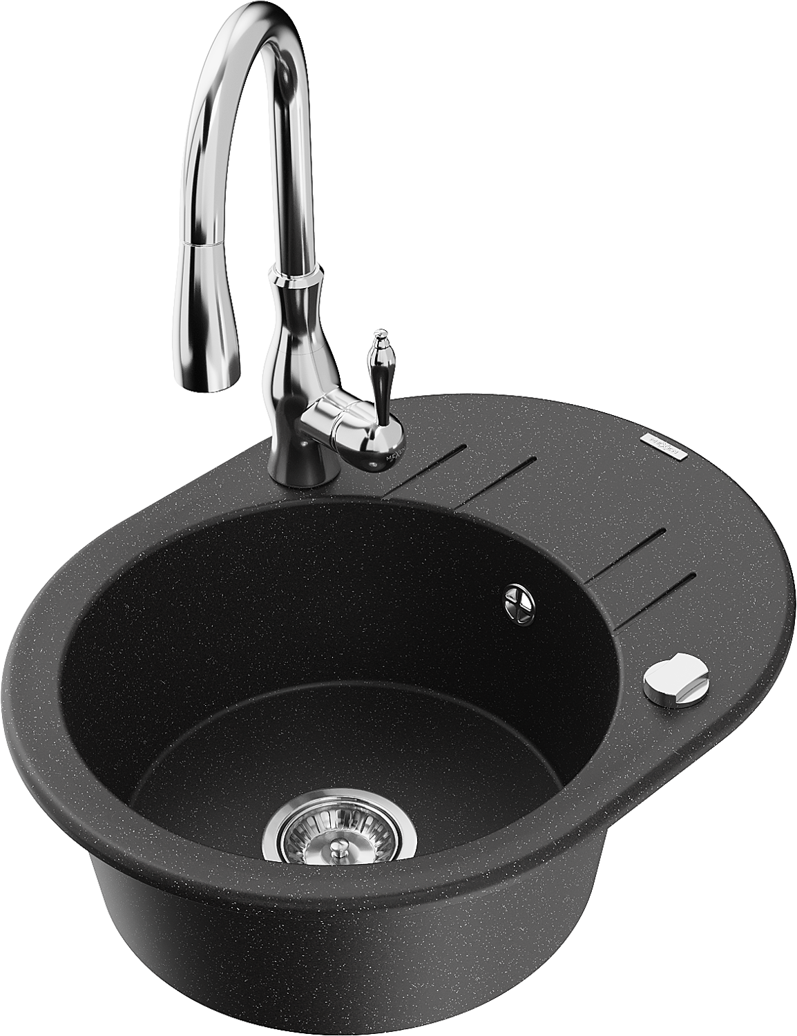 Mexen Kevin 1-komorinis granito kriauklė su lentyna ir virtuvės maišytuvu Savita, juoda/sidabrinė metalo spalva