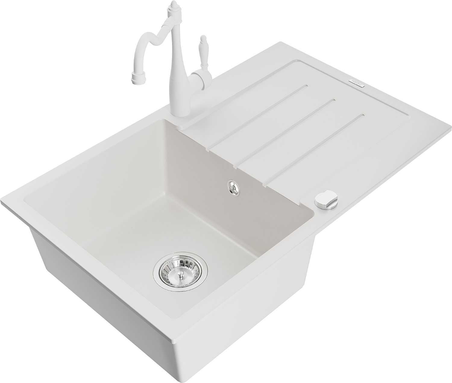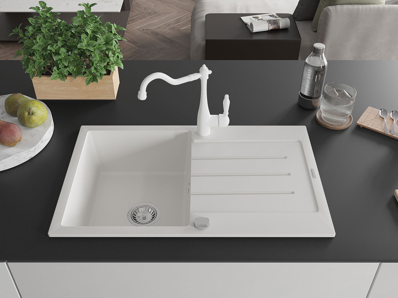 Mexen Bruno granito plautuvė 1 kamerų su lašinimo lenta ir Carla virtuvės maišytuvu, balta - 6513-20-670700-20