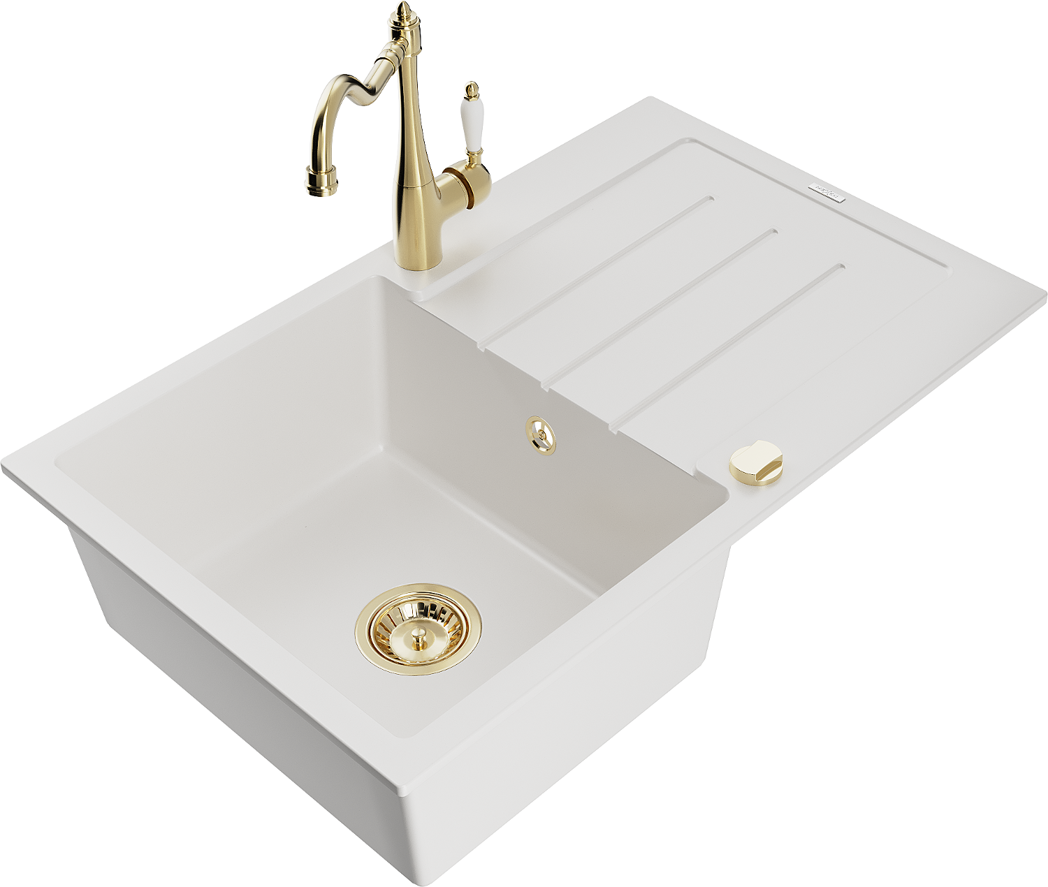 Mexen Bruno vienos plautuvės granito kriauklė su nusausintuvu ir virtuviniu maišytuvu Carla, balta - 6513-20-670700-50