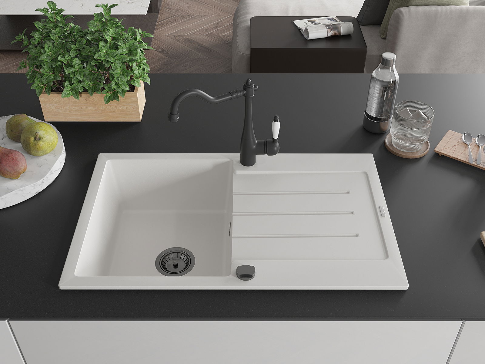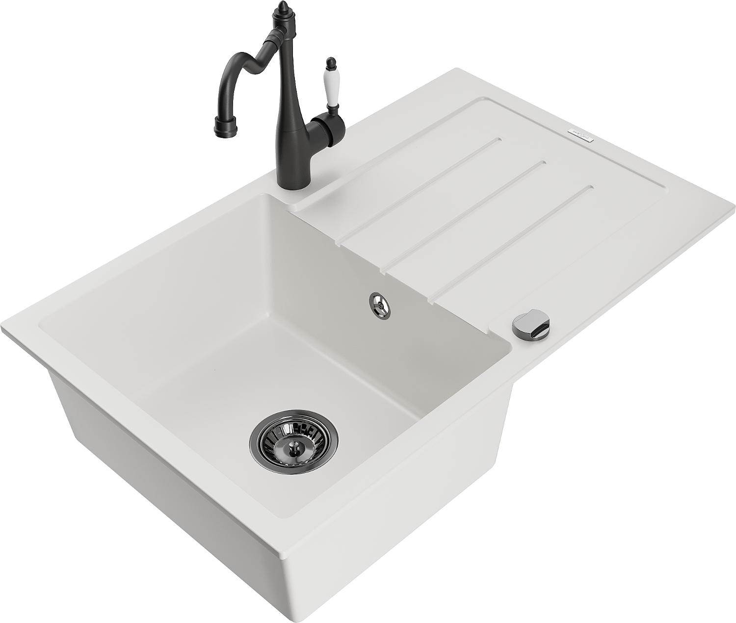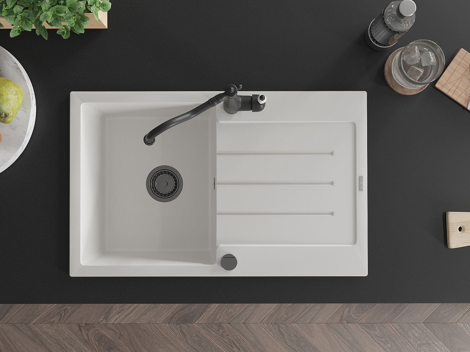 Mexen Bruno granitinis vieno dubens plautuvė su nusausintuvu ir virtuviniu maišytuvu Carla, baltas - 6513-20-670700-70