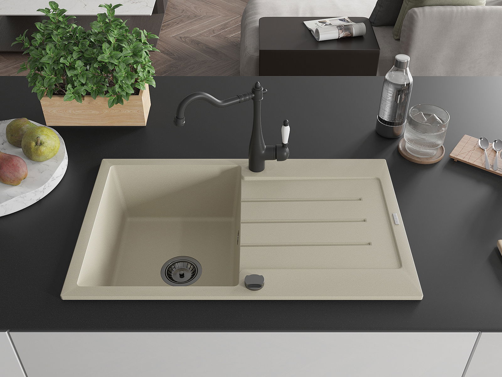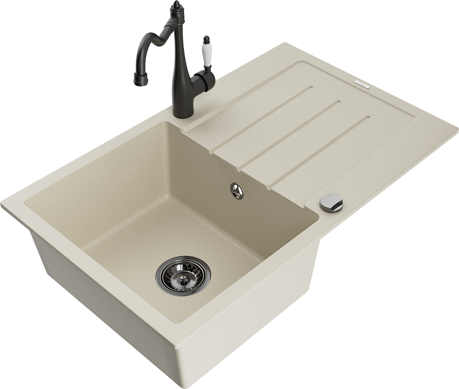 Mexen Bruno granitinė vienos kameros plautuvė su nusausintuvu ir virtuviniu maišytuvu Carla, smėlio spalvos - 6513-69-670700-70