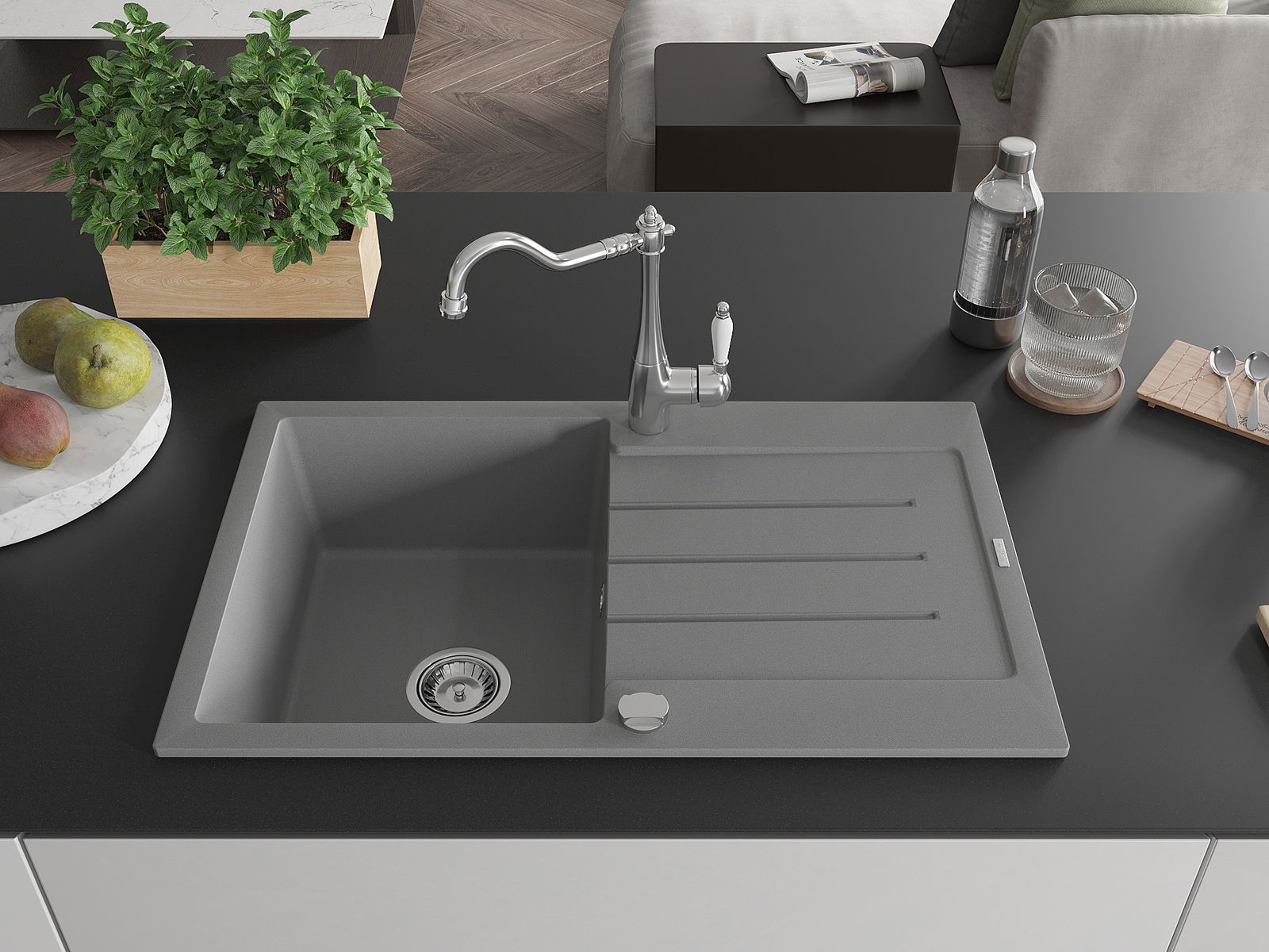 Mexen Bruno granito plautuvė 1 skyrelio su nusausinimo vieta ir virtuviniu maišytuvu Carla, pilkas - 6513-71-670700-00