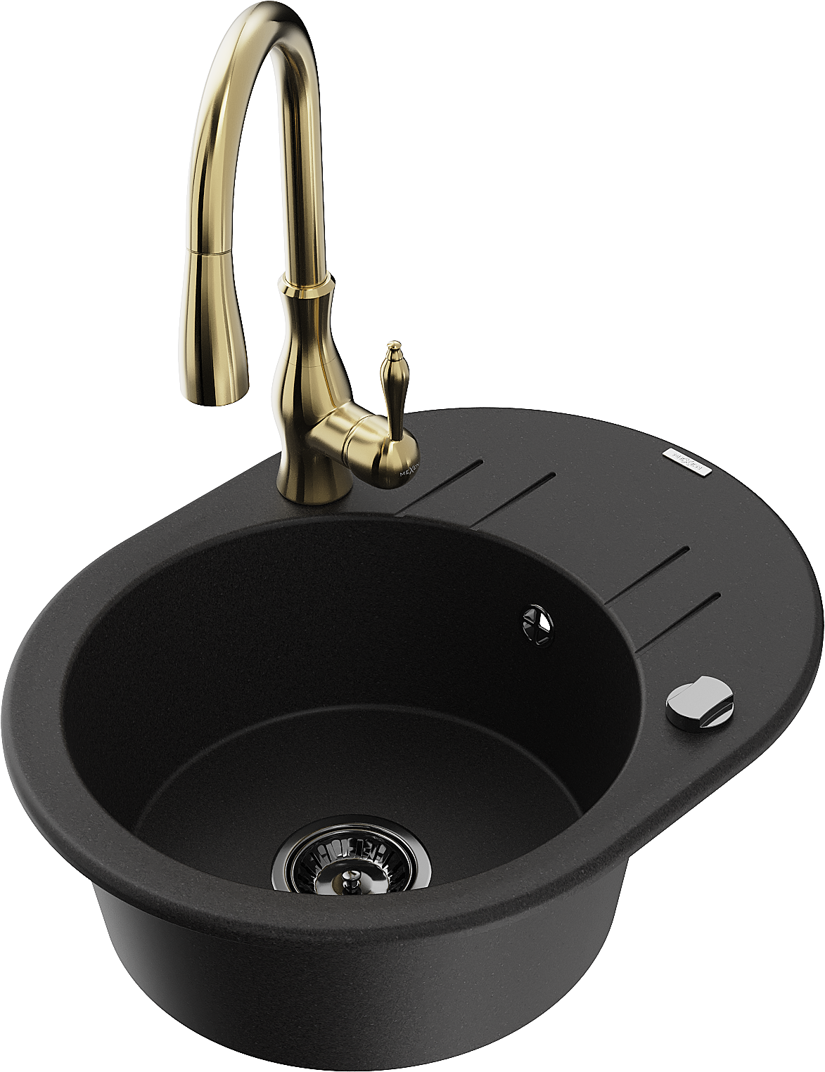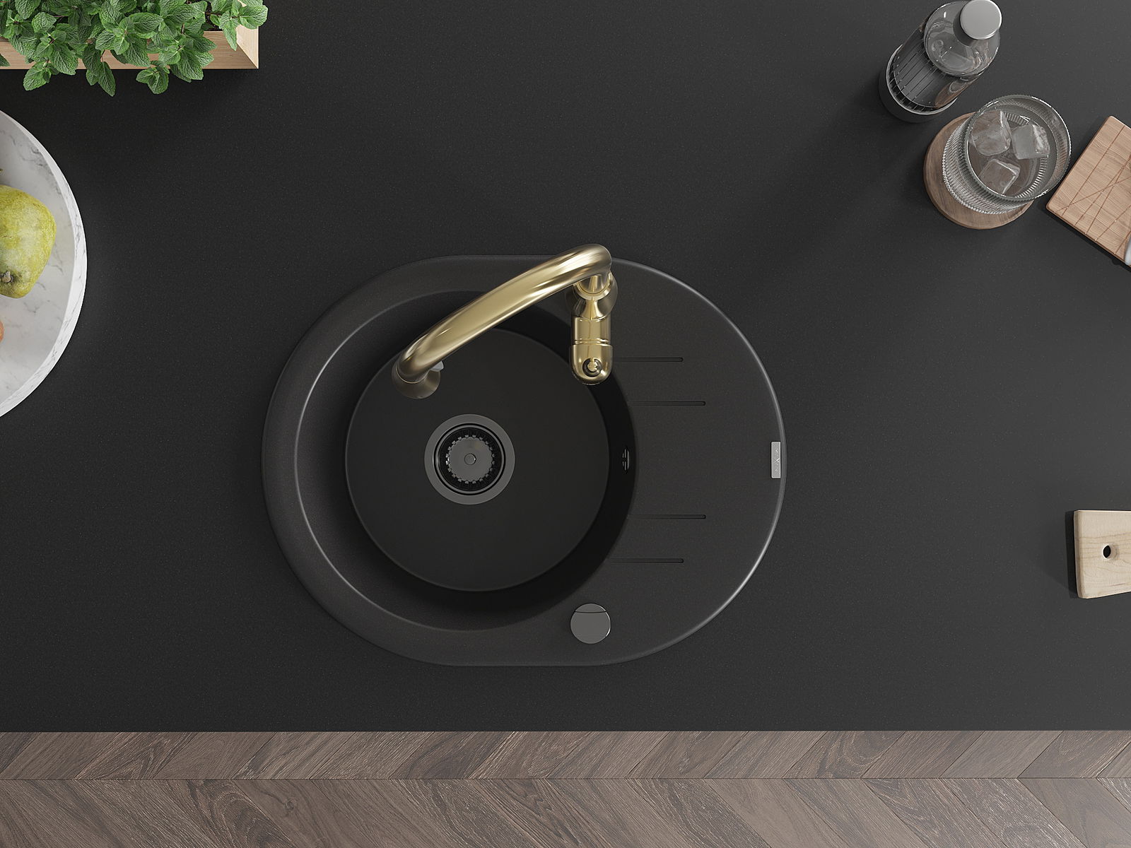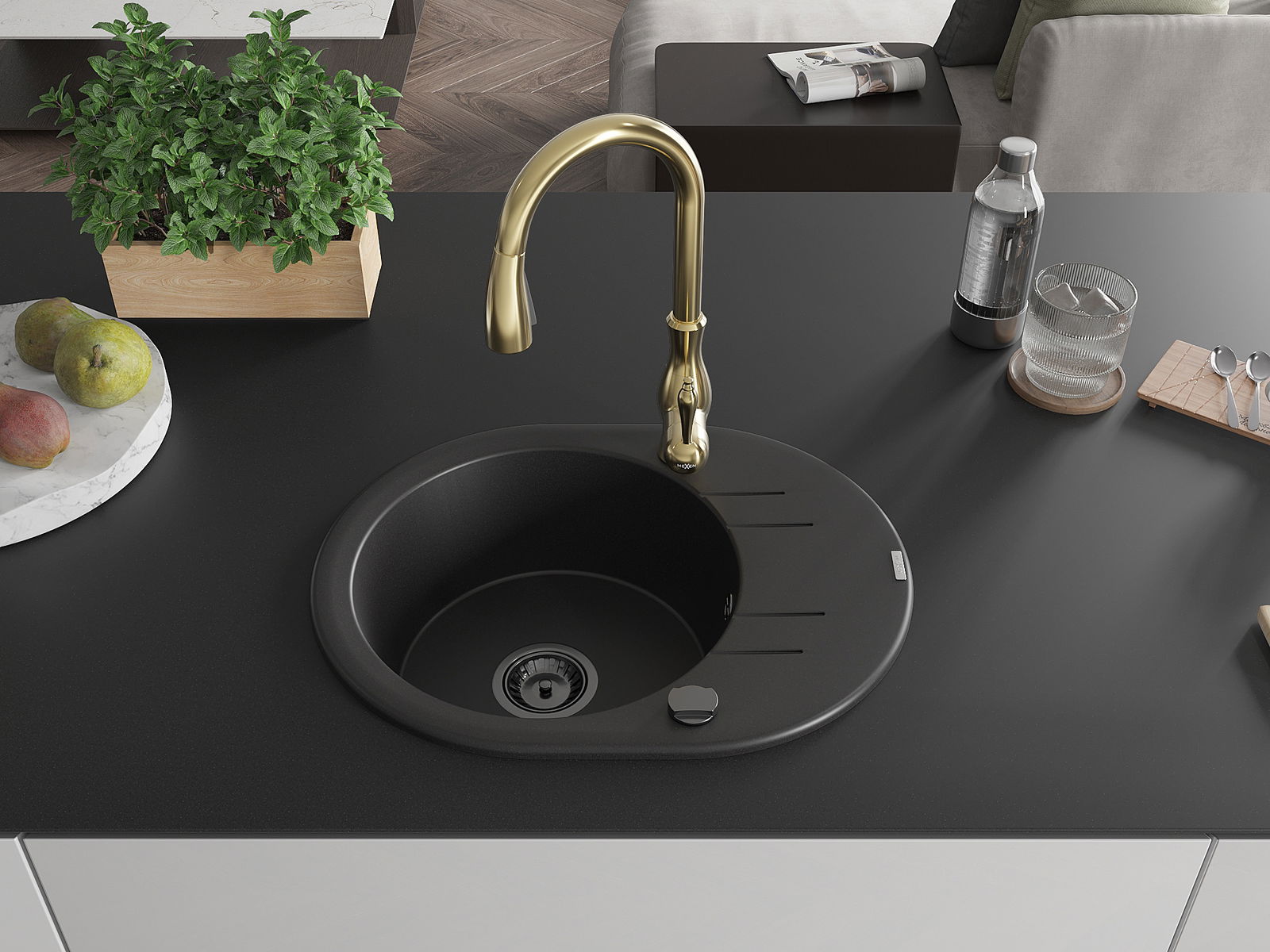 Mexen Kevin granitinė vienos dubens kriauklė su nuvarvėjimo zona ir virtuviniu maišytuvu Savita, juoda - 6517-77-672601-50-B