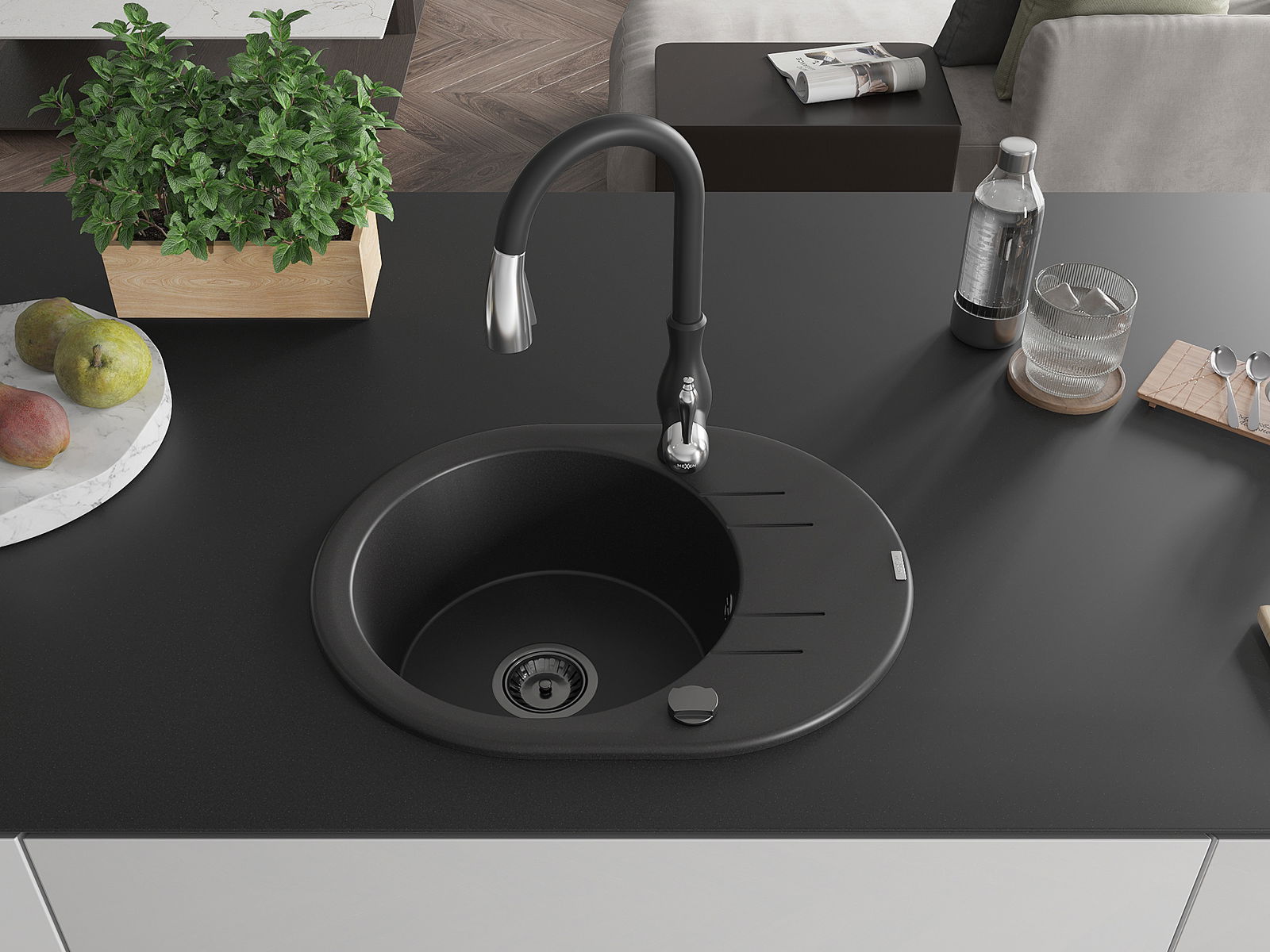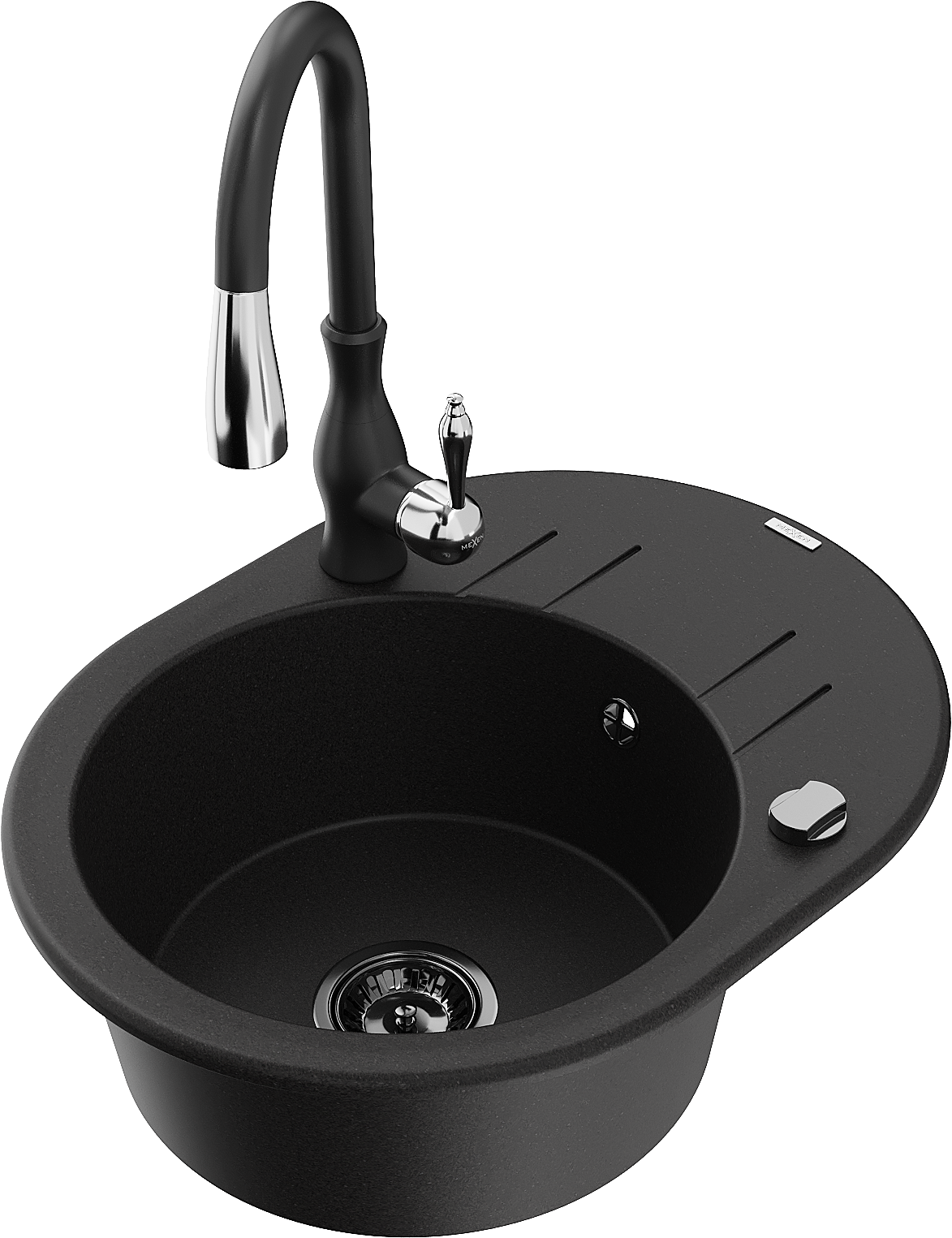 Mexen Kevin vienos kameros granitinė plautuvė su nuvarvėjimu ir virtuviniu maišytuvu Savita, juoda - 6517-77-672601-70-B