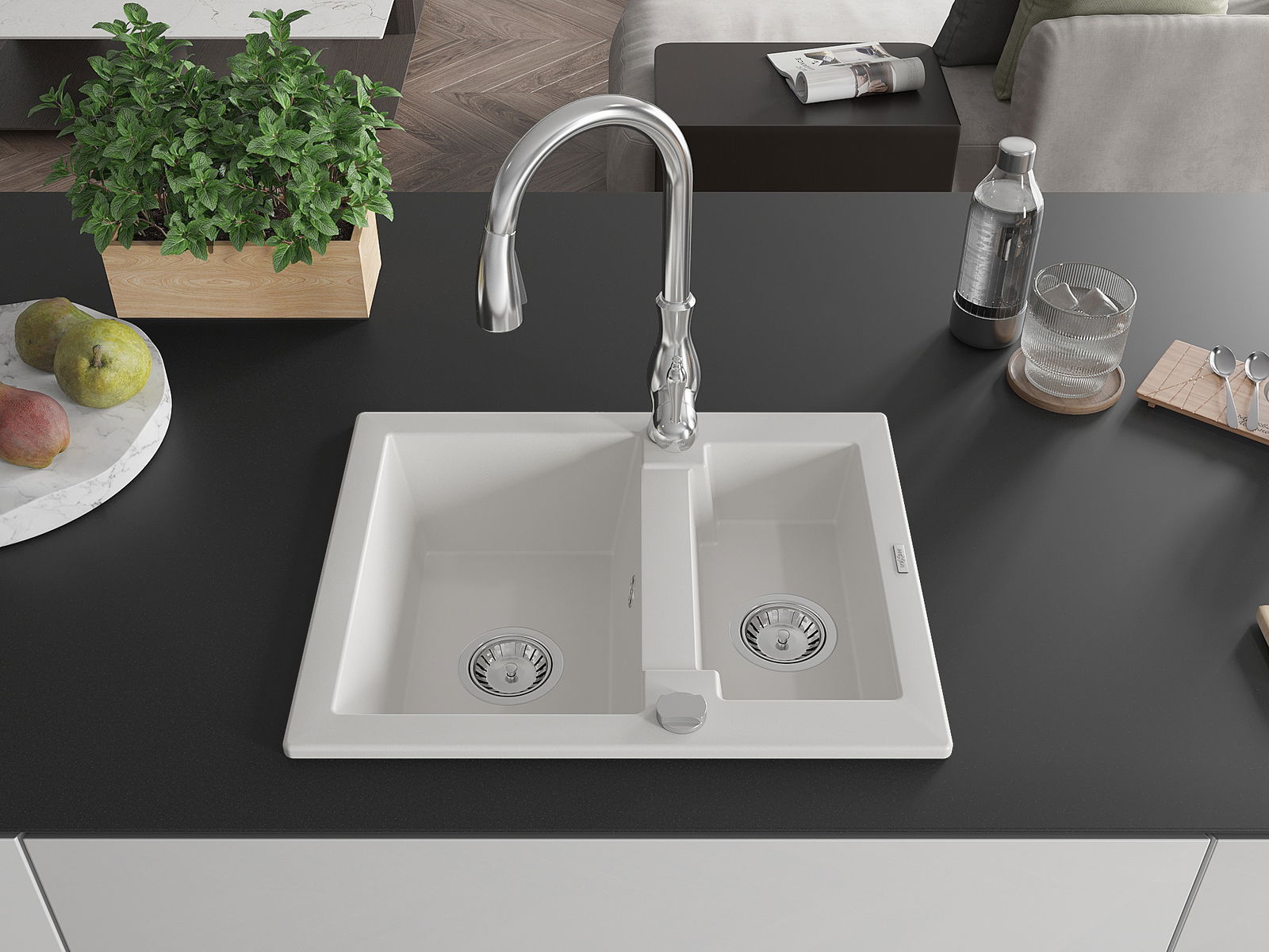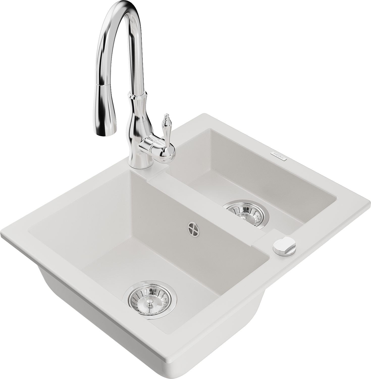 Mexen Carlos granito plautuvė 1,5 skyrių su virtuviniu maišytuvu Savita, baltas - 6518-20-672601-00