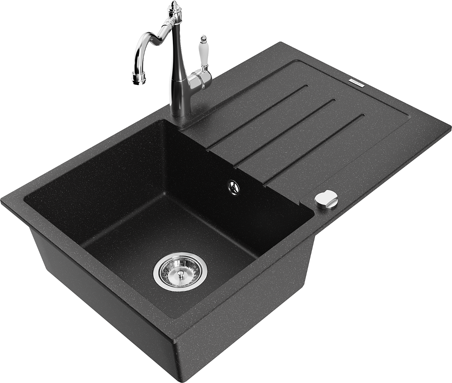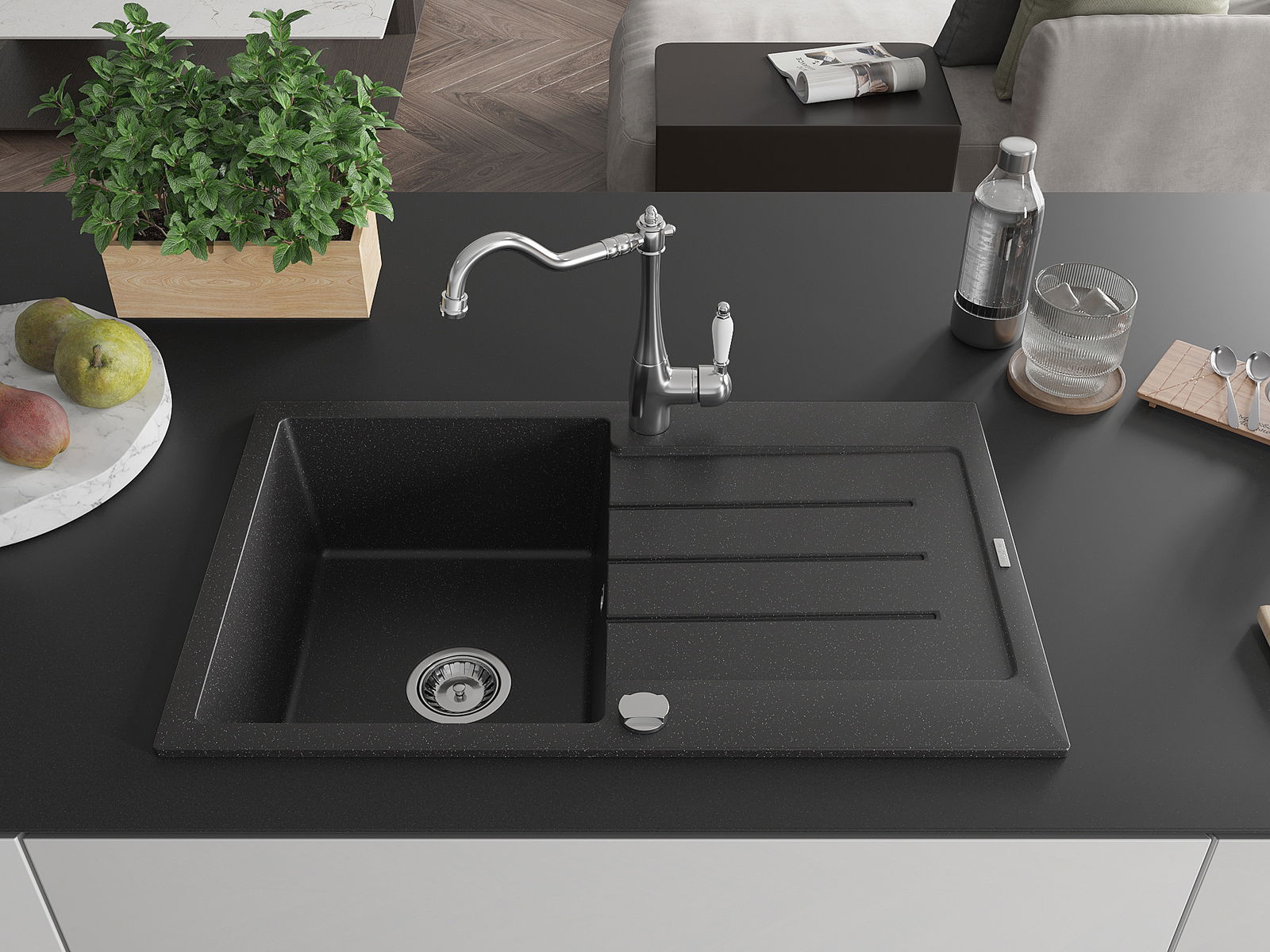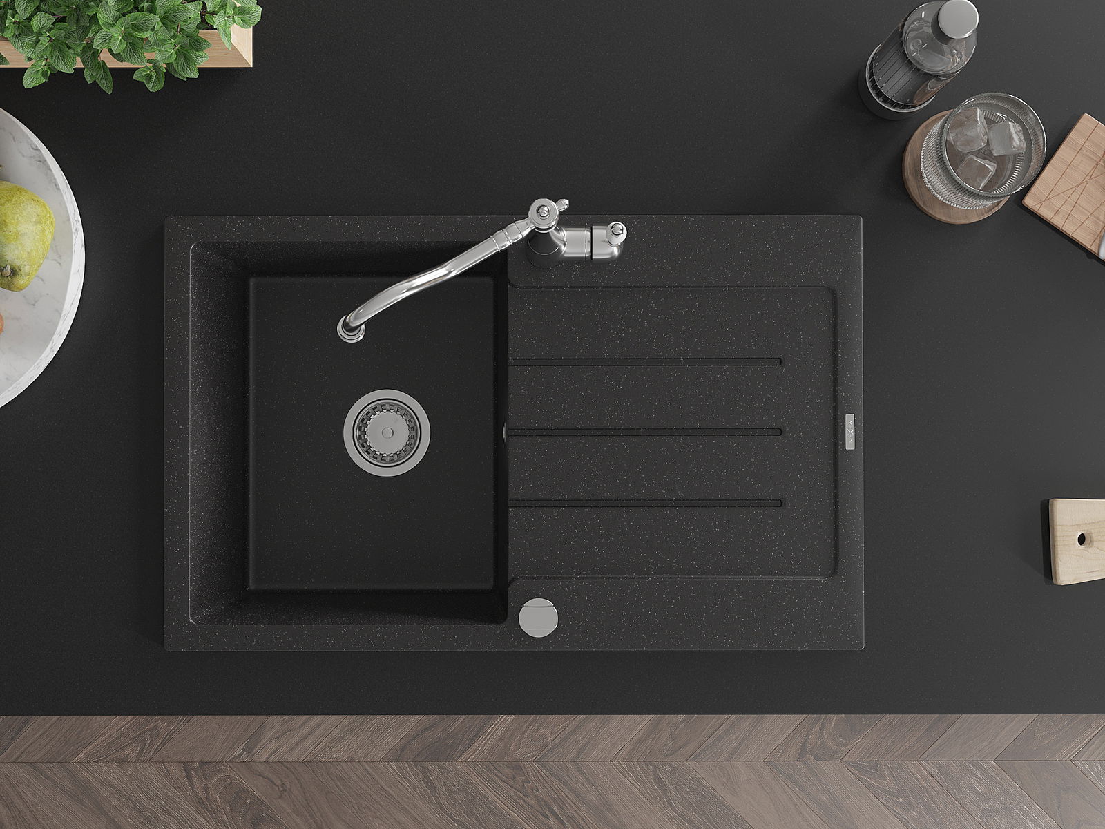 Mexen Bruno granitinė vienos plokštės kriauklė su nutekėjimu ir virtuvės maišytuvu Carla, juoda/sidabrinė metaliko