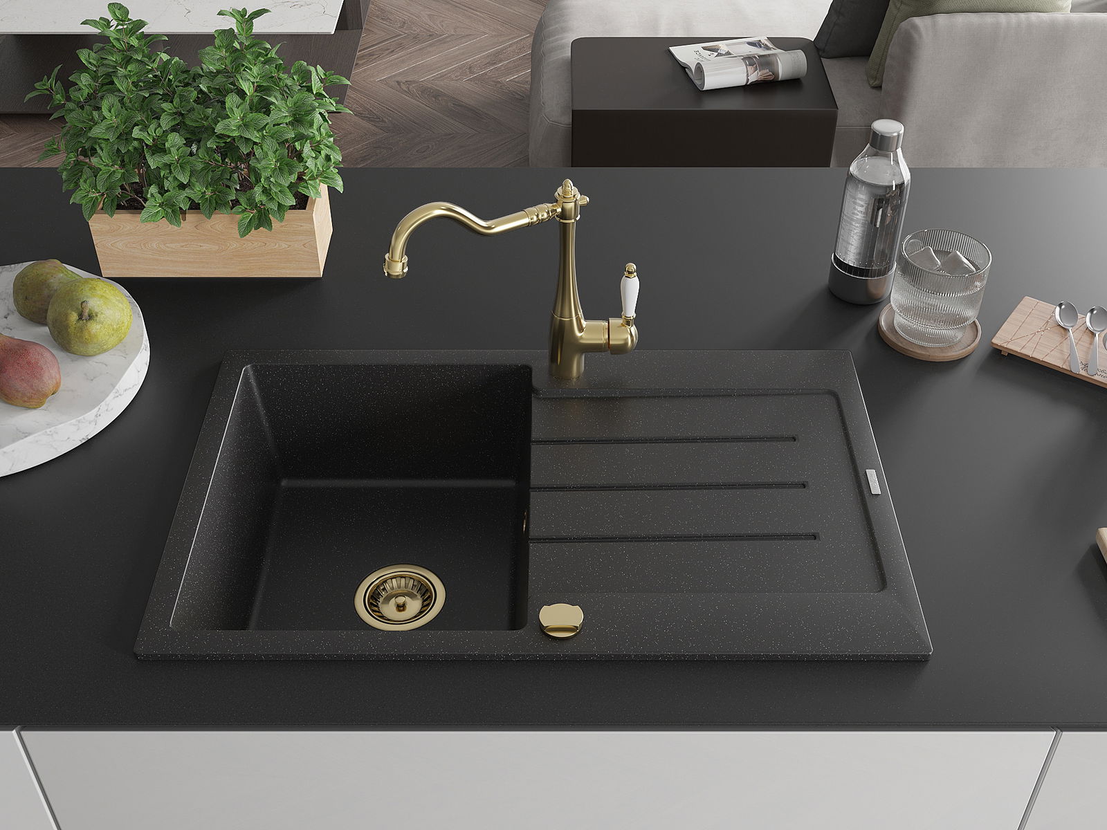 Mexen Bruno granitinė virtuvės plautuvė su nutekėjimo skyriumi ir virtuvės maišytuvu Carla, juodas/sidabrinis metalikas