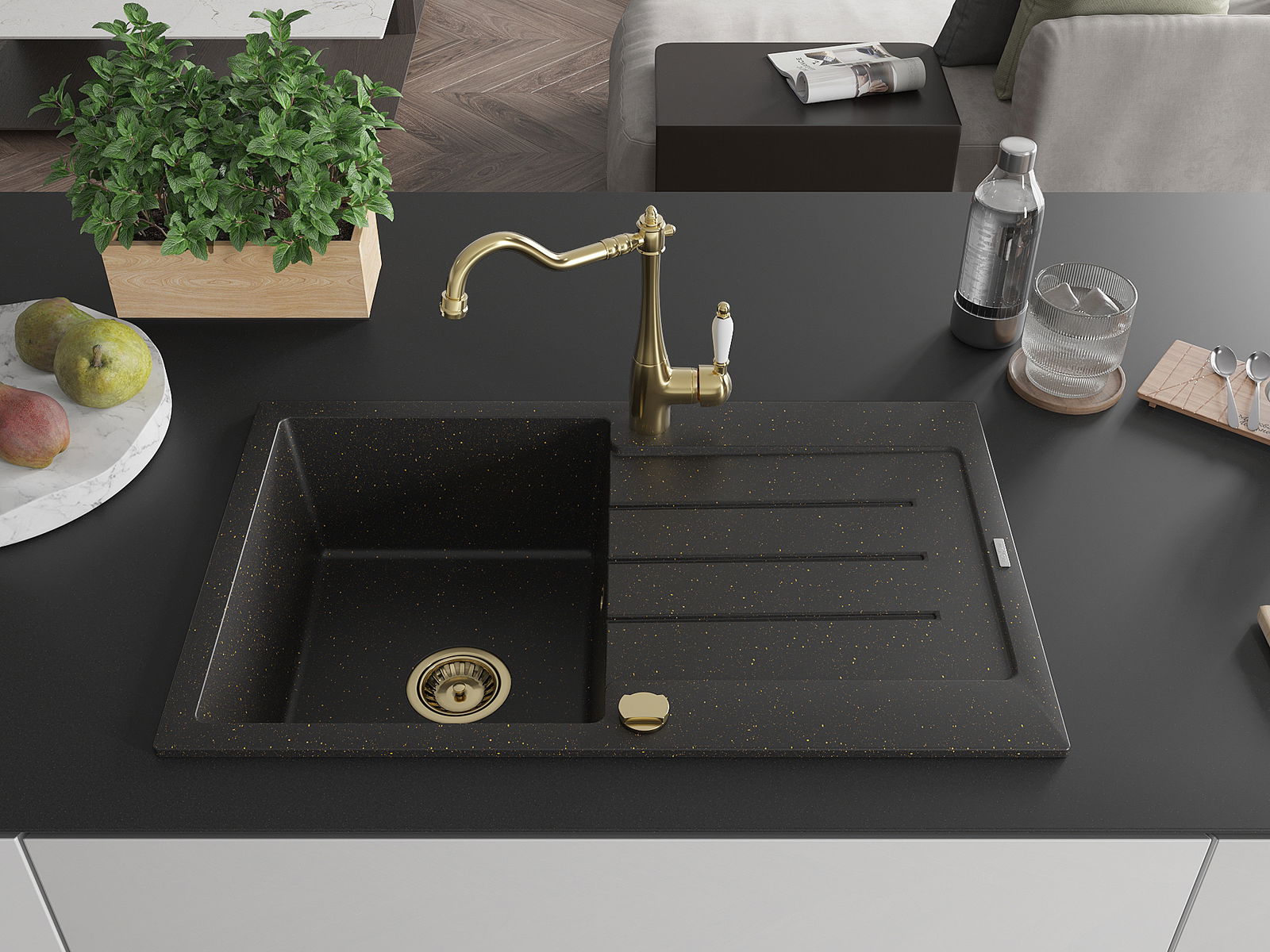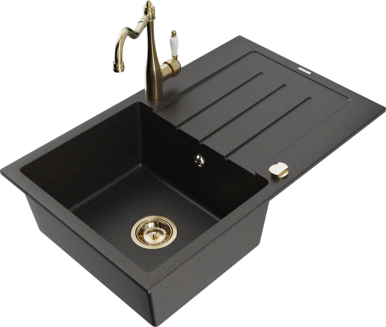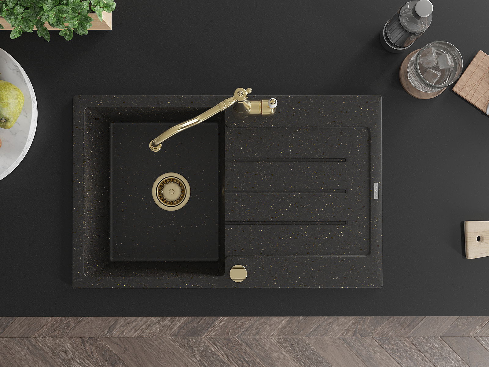 Mexen Bruno granitinė vienos kameros plautuvė su nuvarvėjimo zona ir virtuvine maišytuve Carla, juoda/auksinė metalika