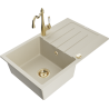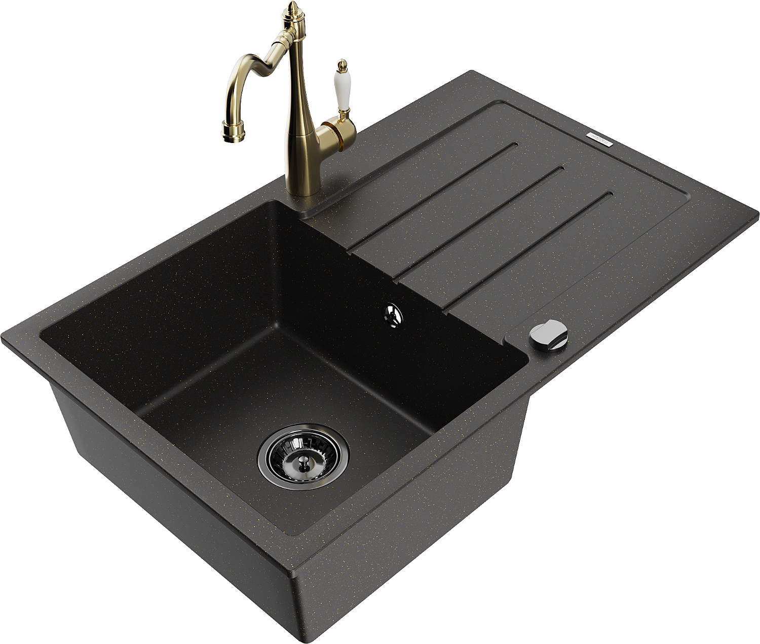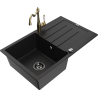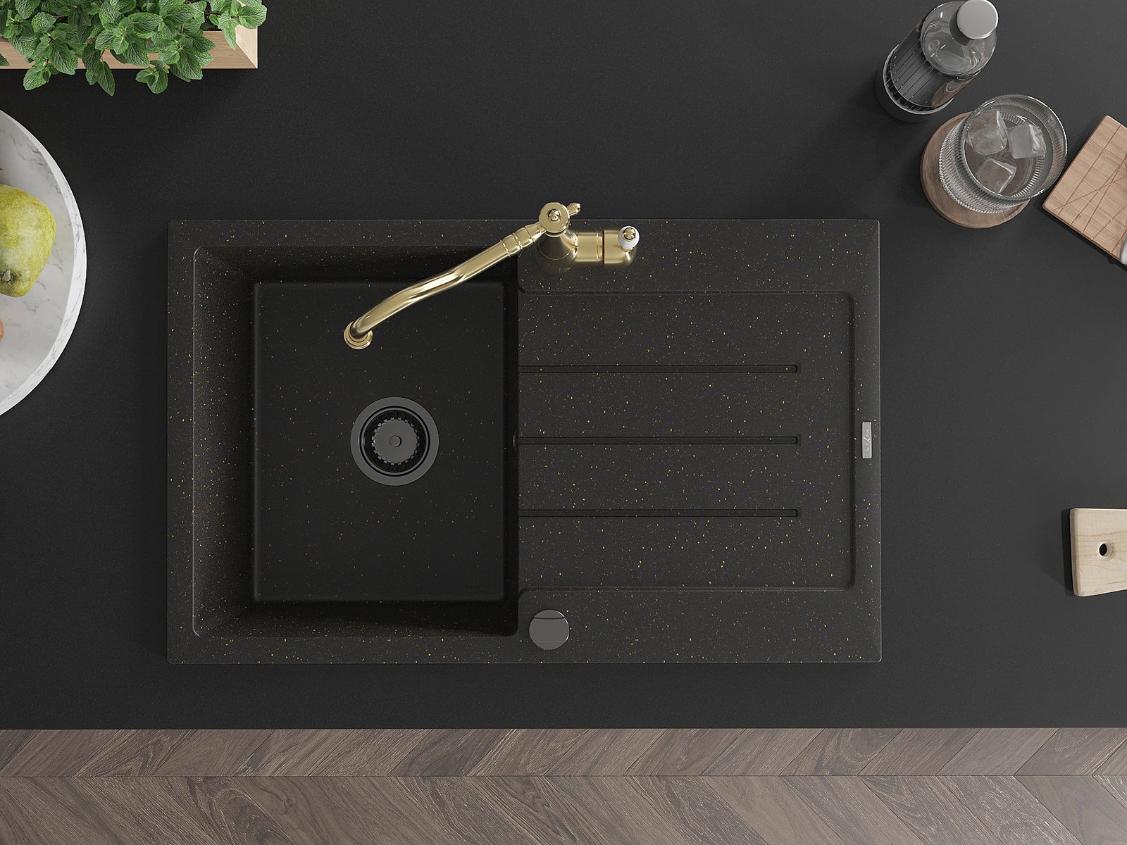 Mexen Bruno granitinė vieno dubens plautuvė su nusausintuvu ir virtuviniu maišytuvu Carla, juoda/auksinė metalo spalva