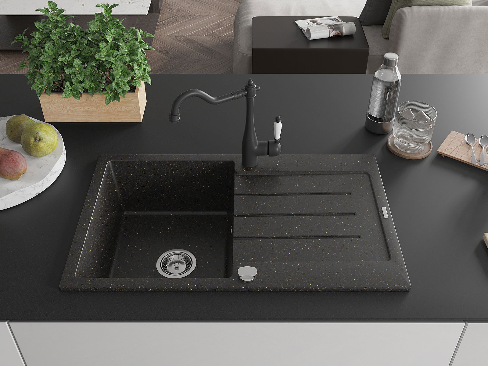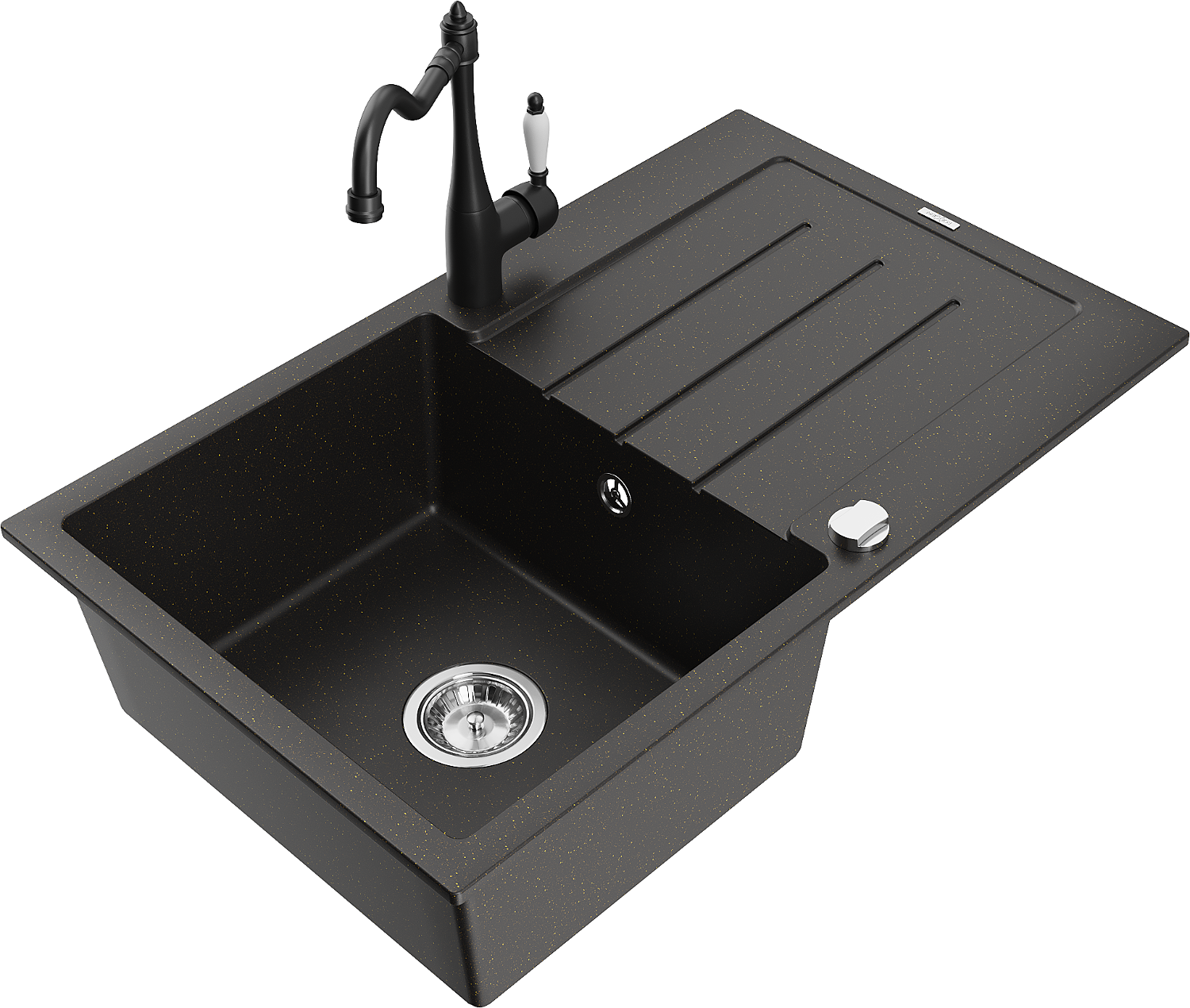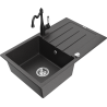Mexen Bruno vieno dubens granito plautuvė su nusausinimo zona ir virtuvės maišytuvu Carla, juoda/aukso spalva