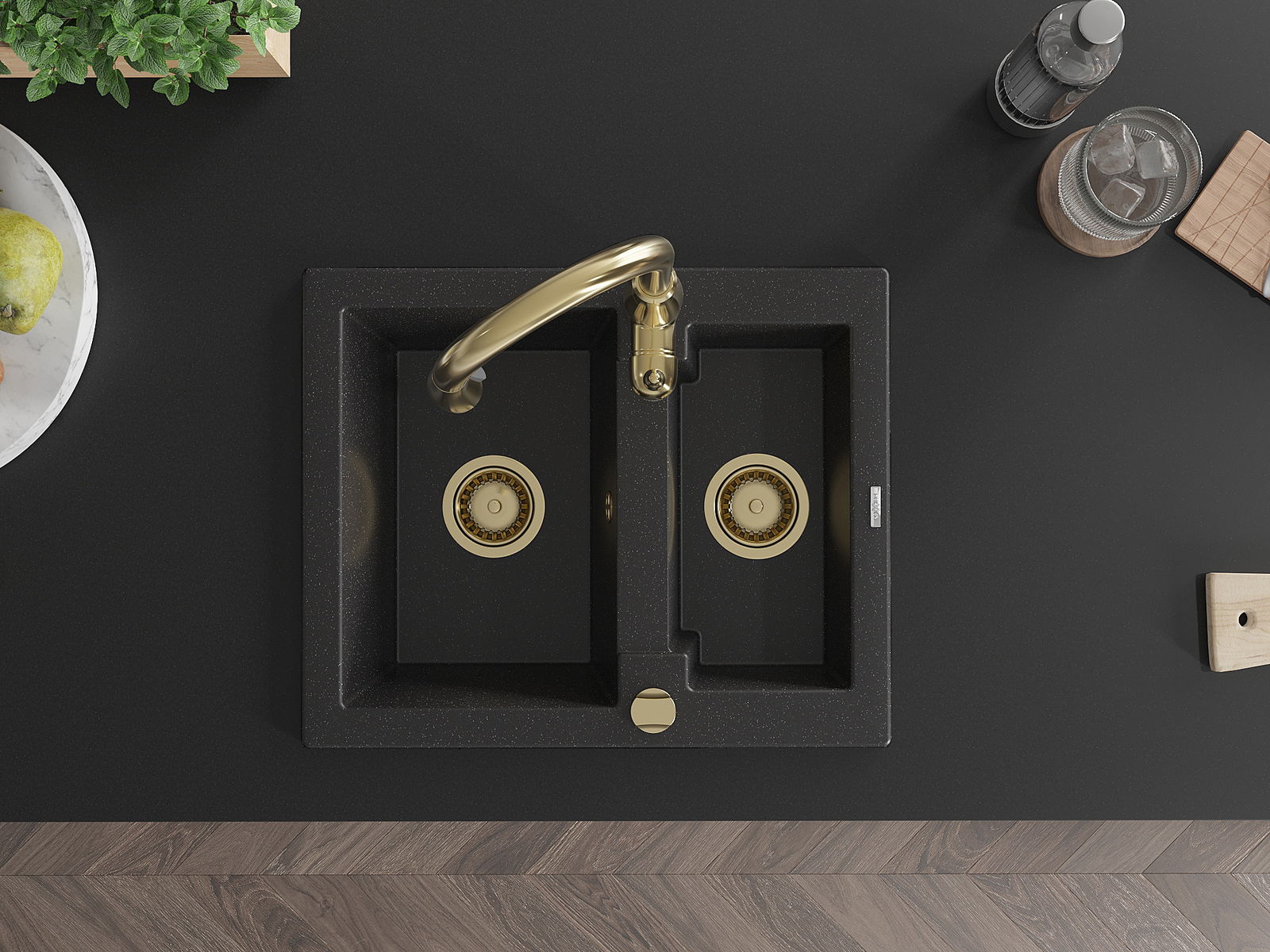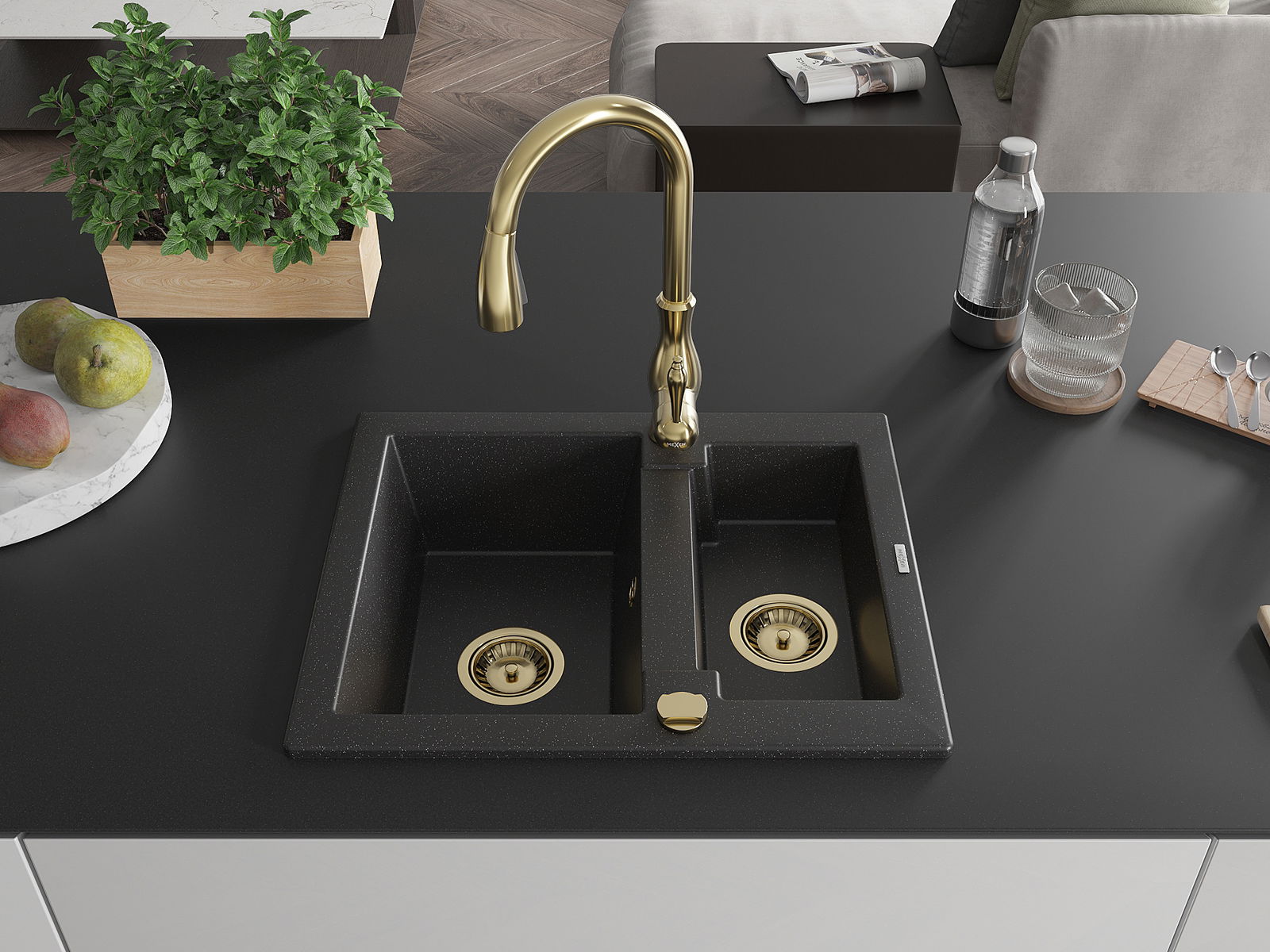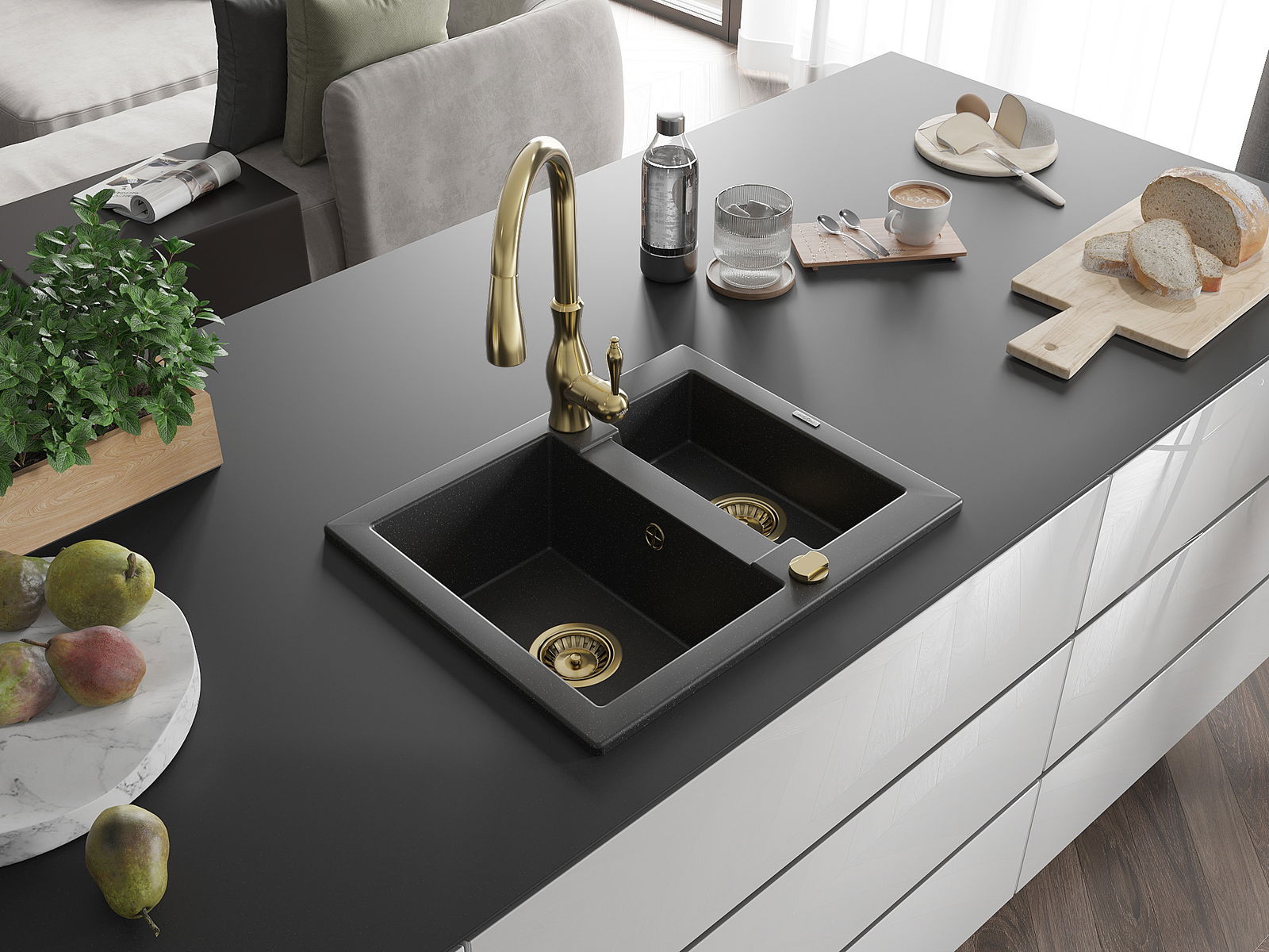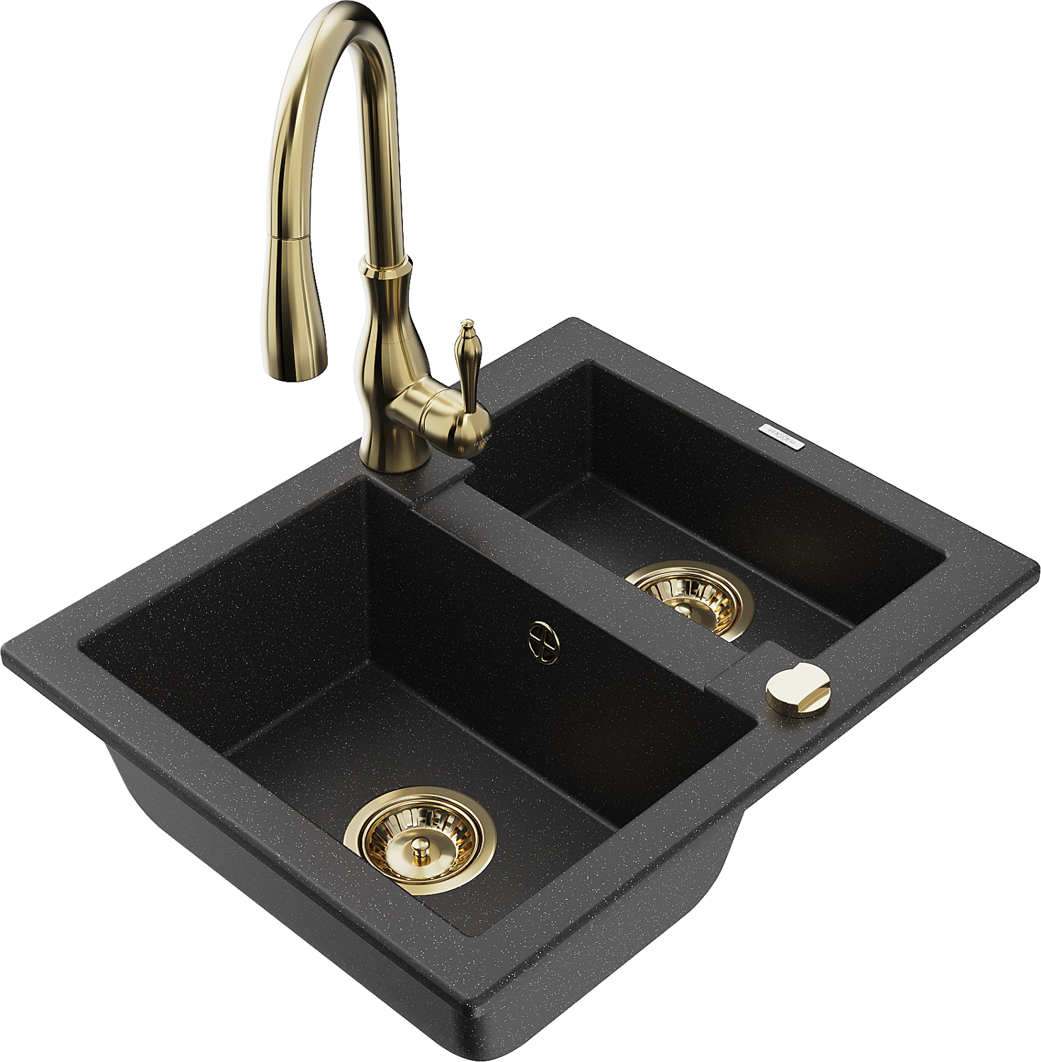 Mexen Carlos granitinė 1,5 skylių virtuvinė kriauklė su maišytuvu Savita, juoda/sidabrinis metalikas - 6518-73-672601-50