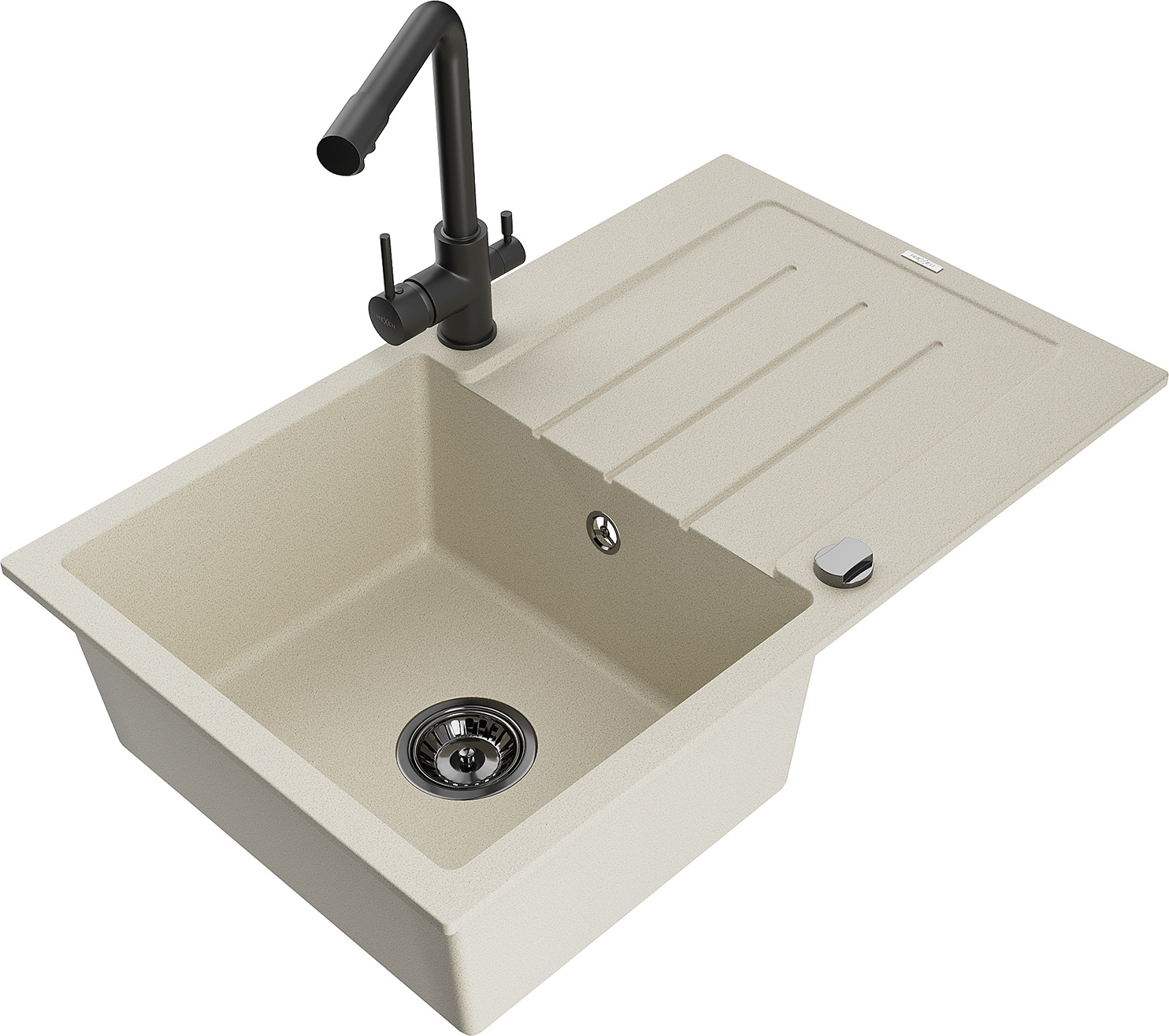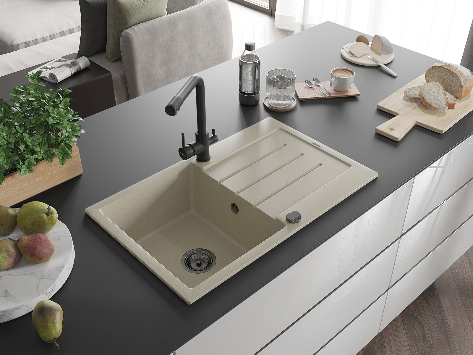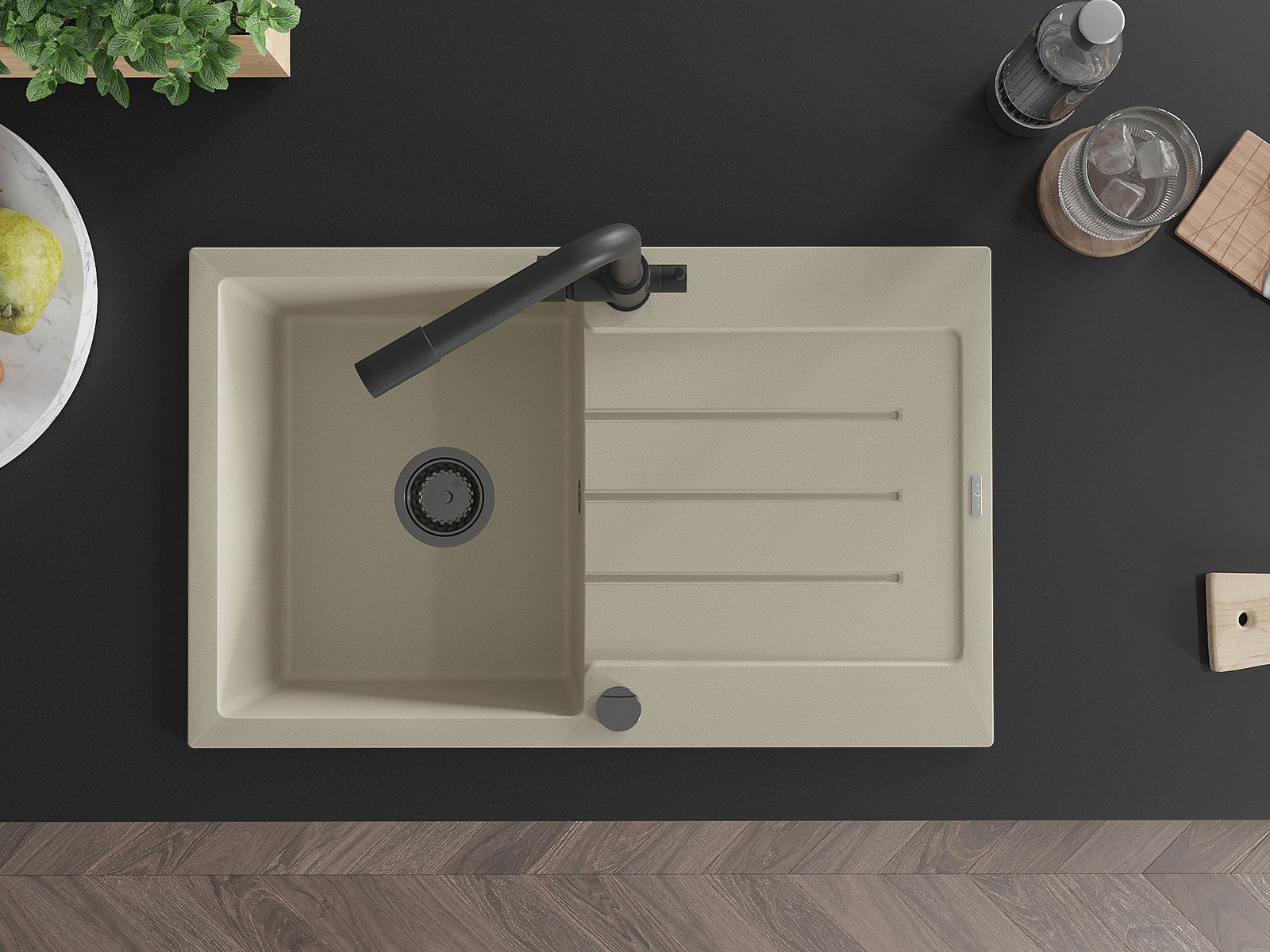 Mexen Bruno granitinė vienakamerė kriauklė su nutekėtu ir virtuviniu maišytuvu Duero, smėlio - 6513-69-671600-70