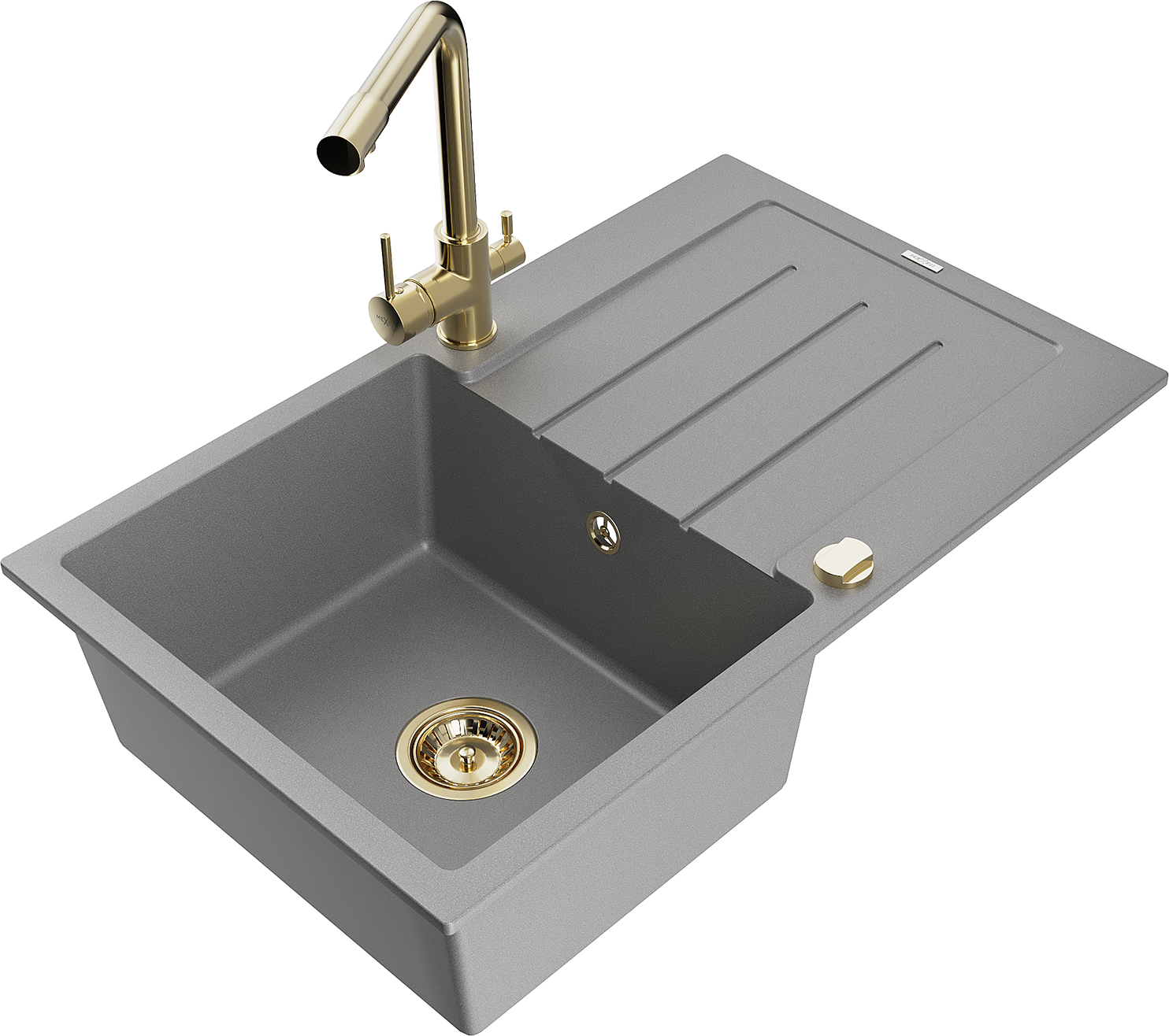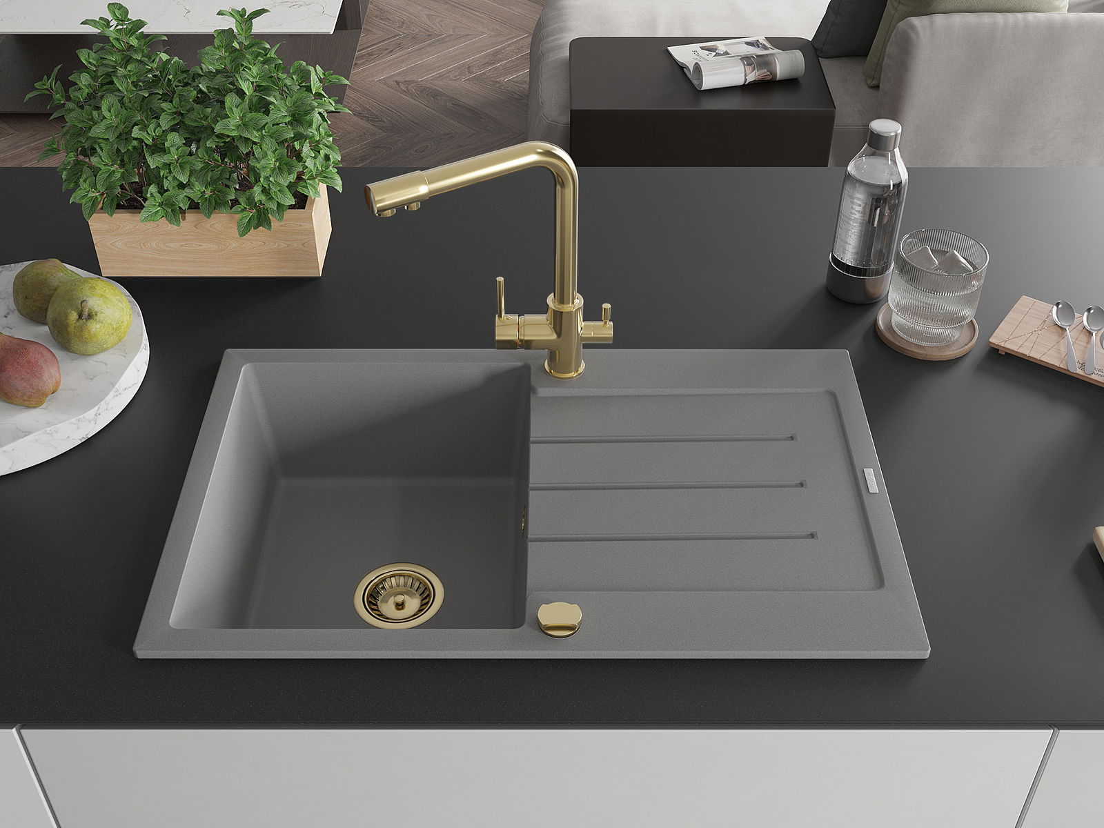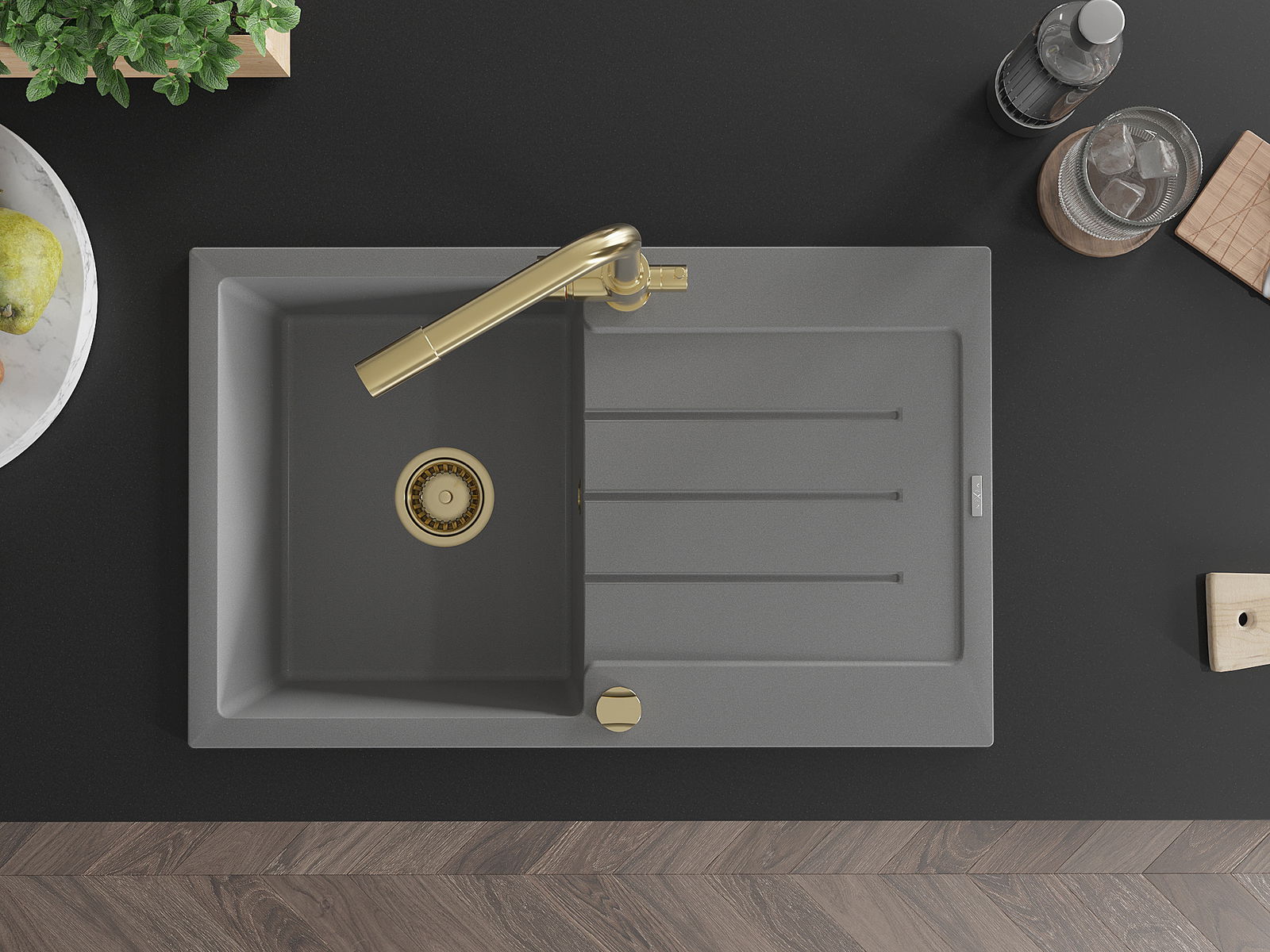 Mexen Bruno granitinė vienos kameros kriauklė su nusausinimo funkcija ir virtuvės maišytuvu Duero, pilka - 6513-71-671600-50
