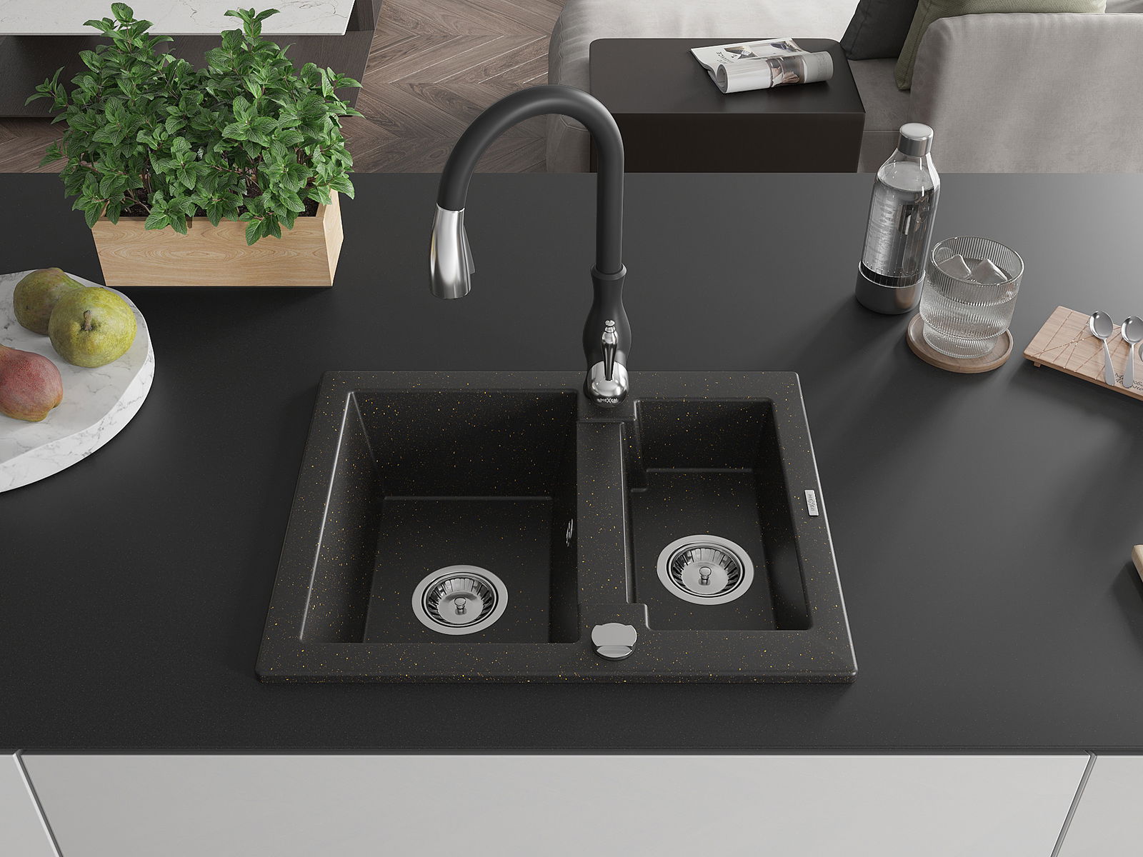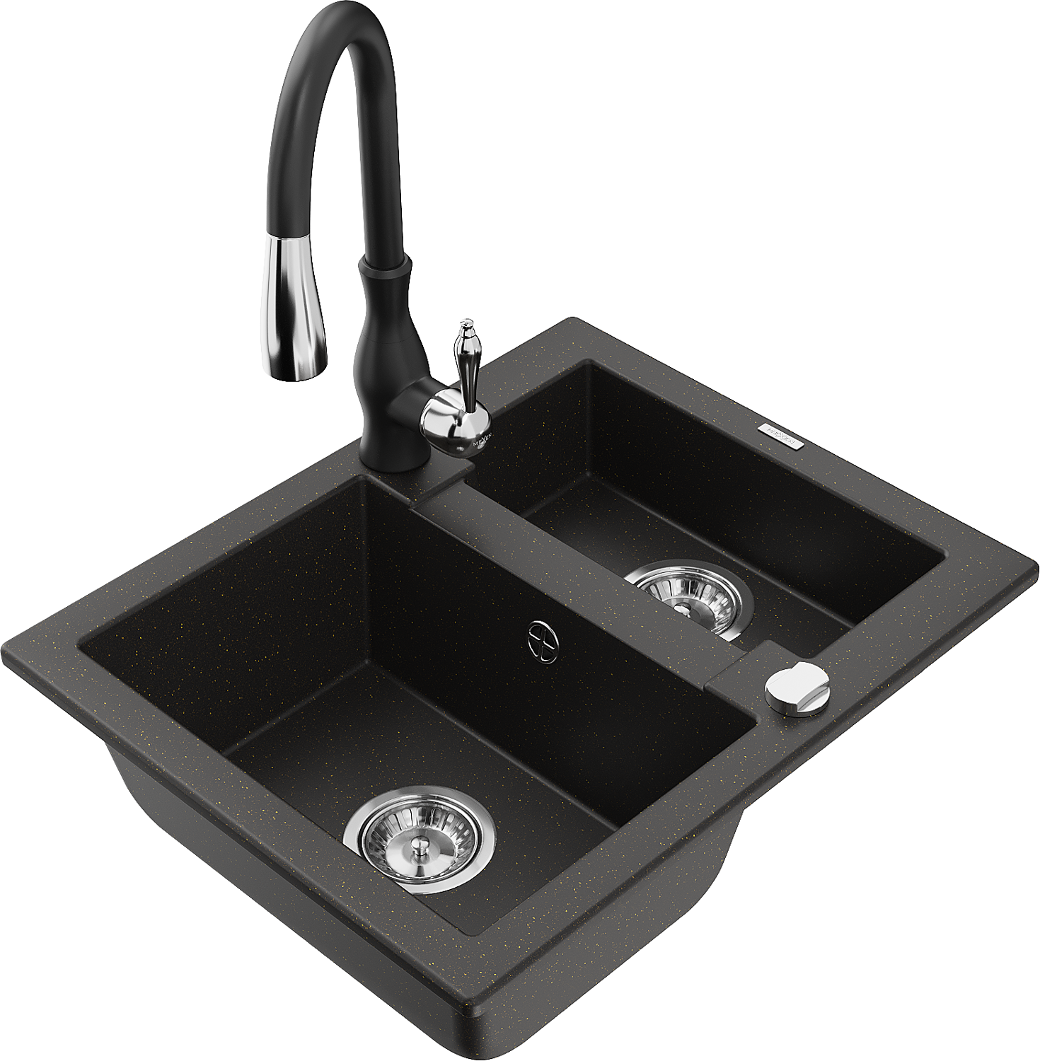 Mexen Carlos granito plautuvės 1,5 kamerų su virtuviniu maišytuvu Savita, juoda/auksinis metalikas - 6518-75-672601-70