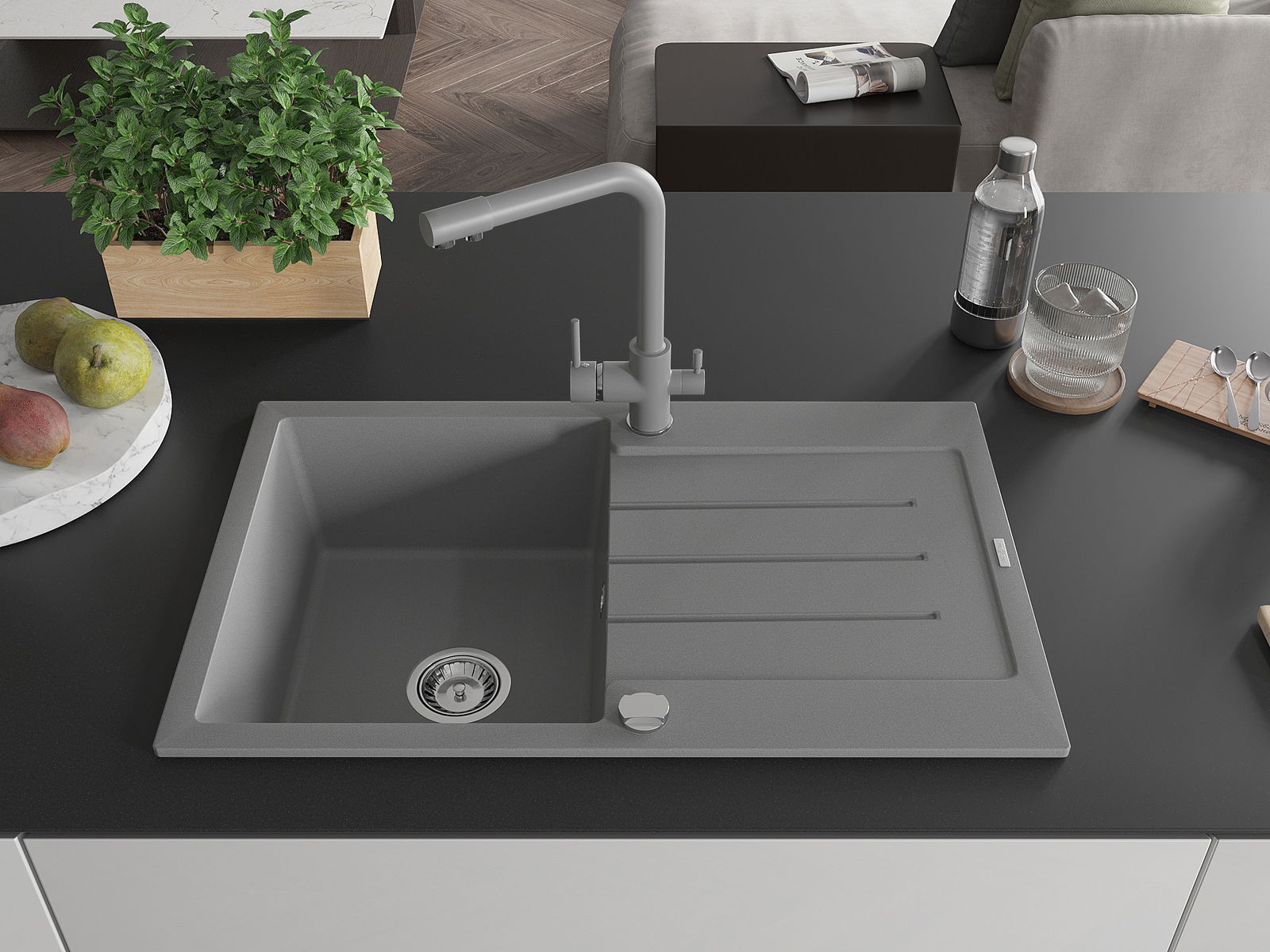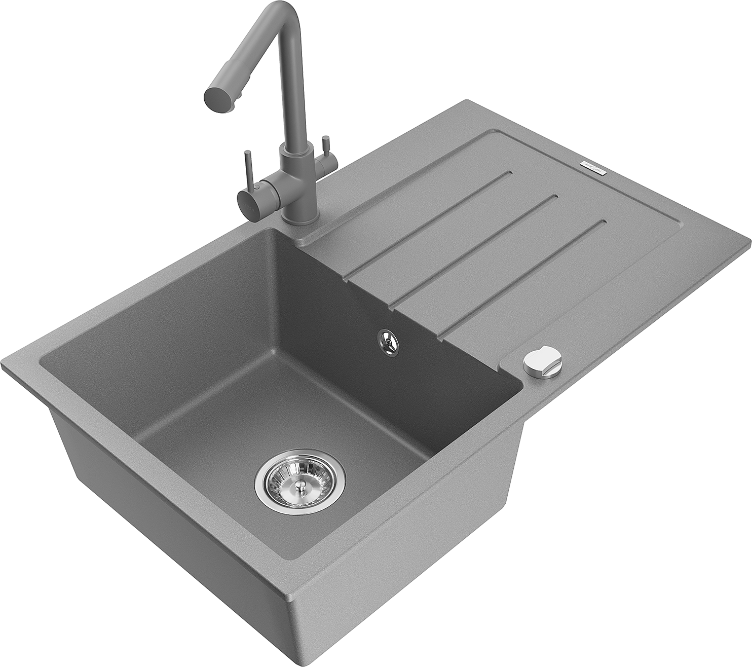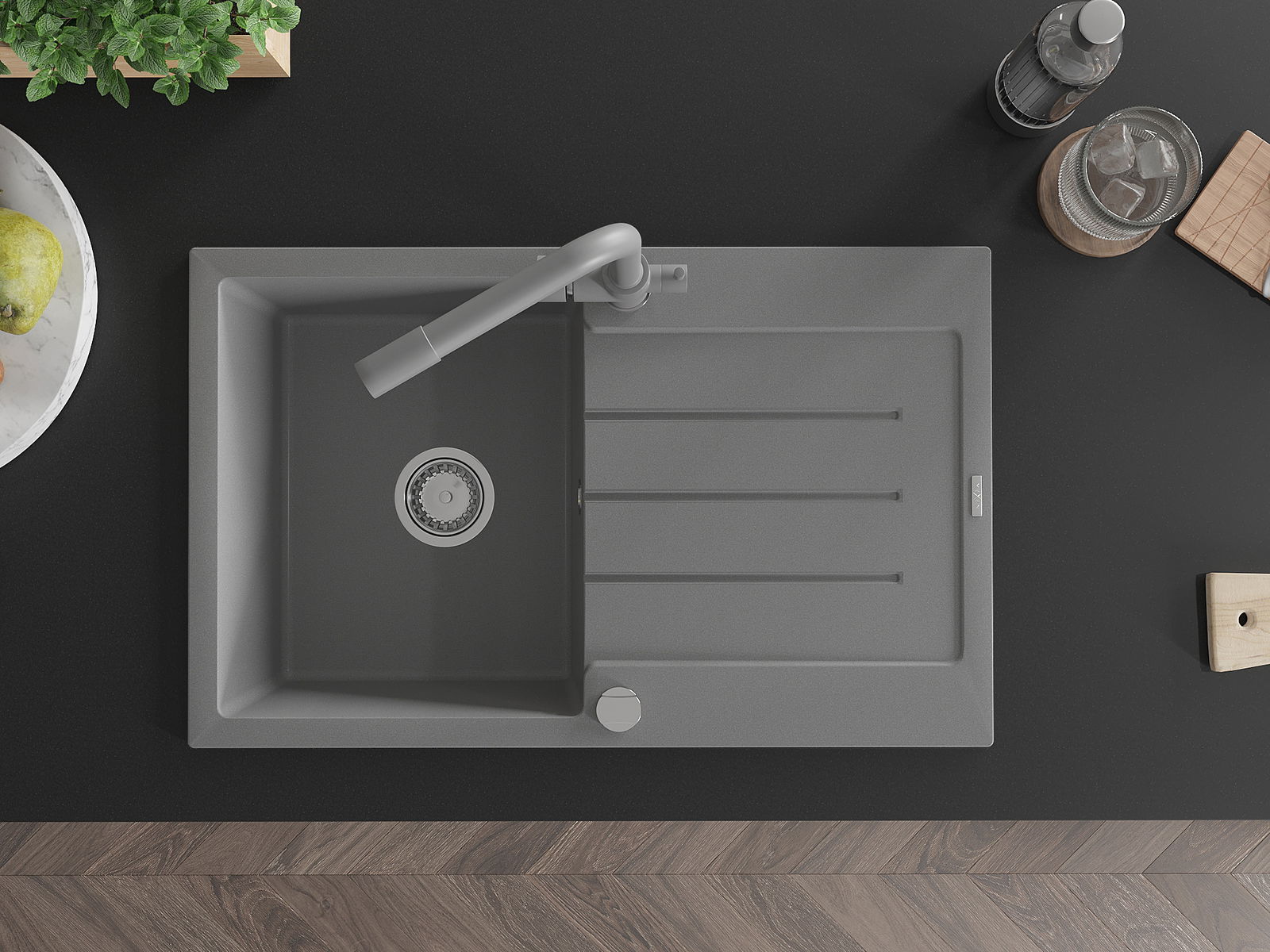 Mexen Bruno granitinė vienos plautuvės kriauklė su nusausintuvu ir virtuviniu maišytuvu Duero, pilka - 6513-71-671600-71