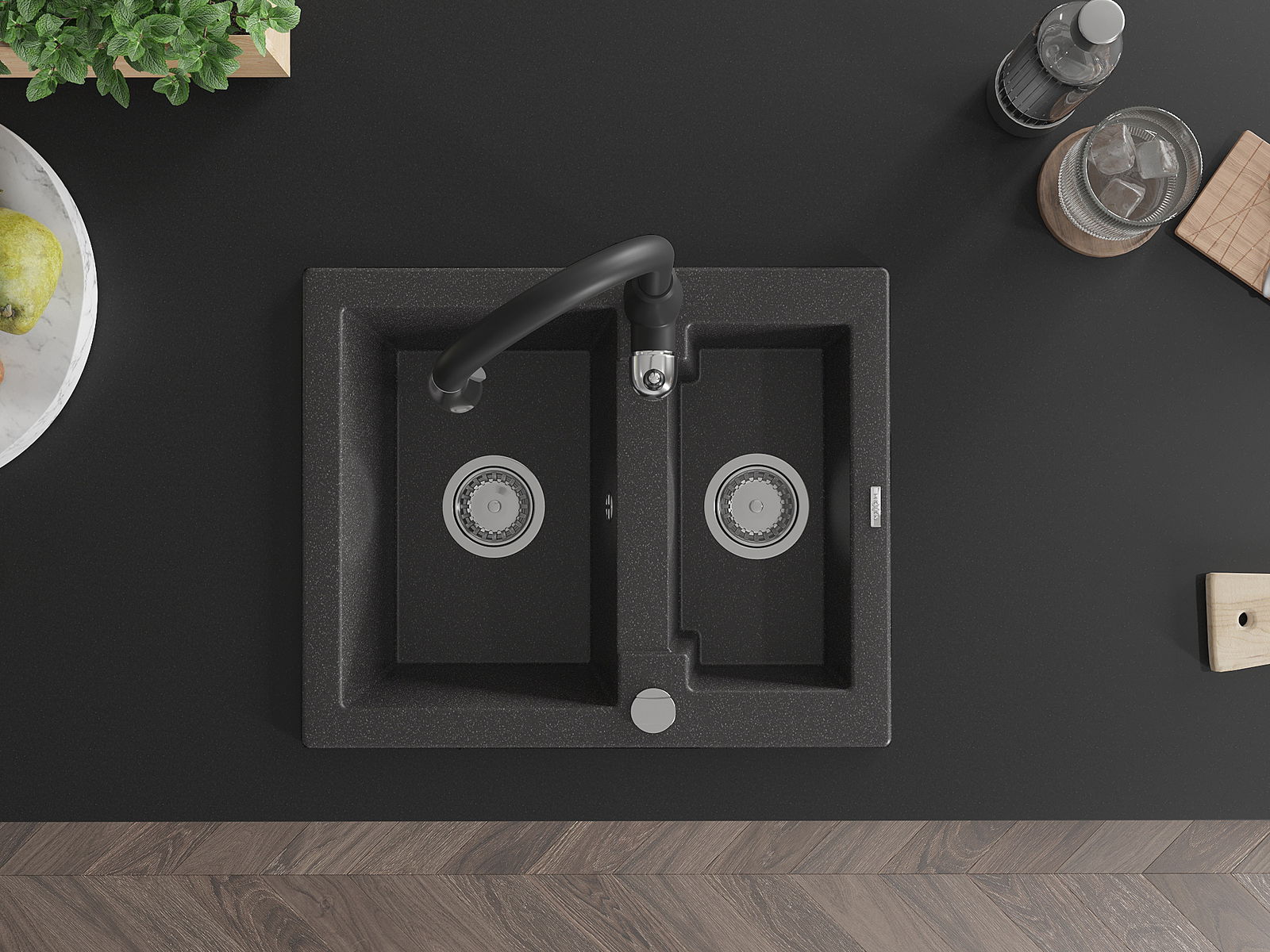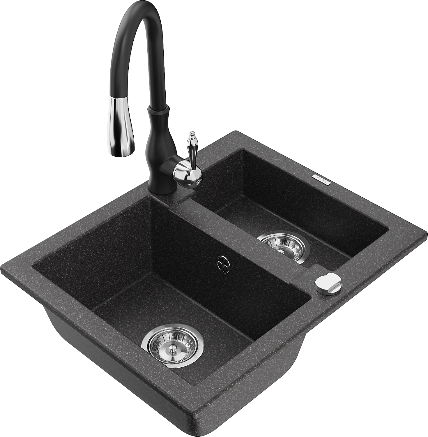 Mexen Carlos granitinė 1,5 skylių kriauklė su Savita virtuviniu maišytuvu, juoda dėmėta - 6518-76-672601-70