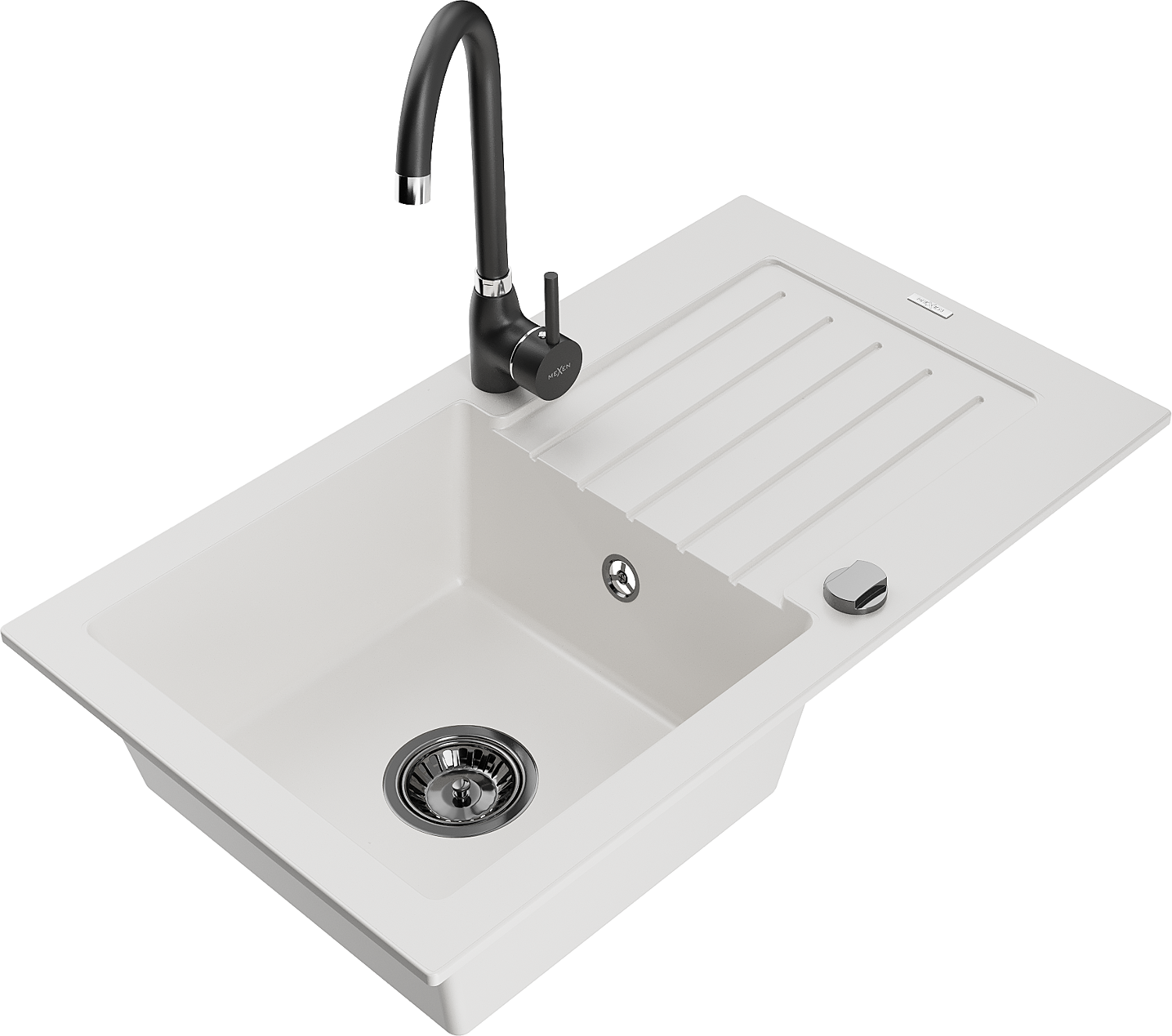 Mexen Pablo granitinė vienos kameros kriauklė su lašeline ir virtuviniu maišytuvu Telma, balta - 6510-20-670200-70