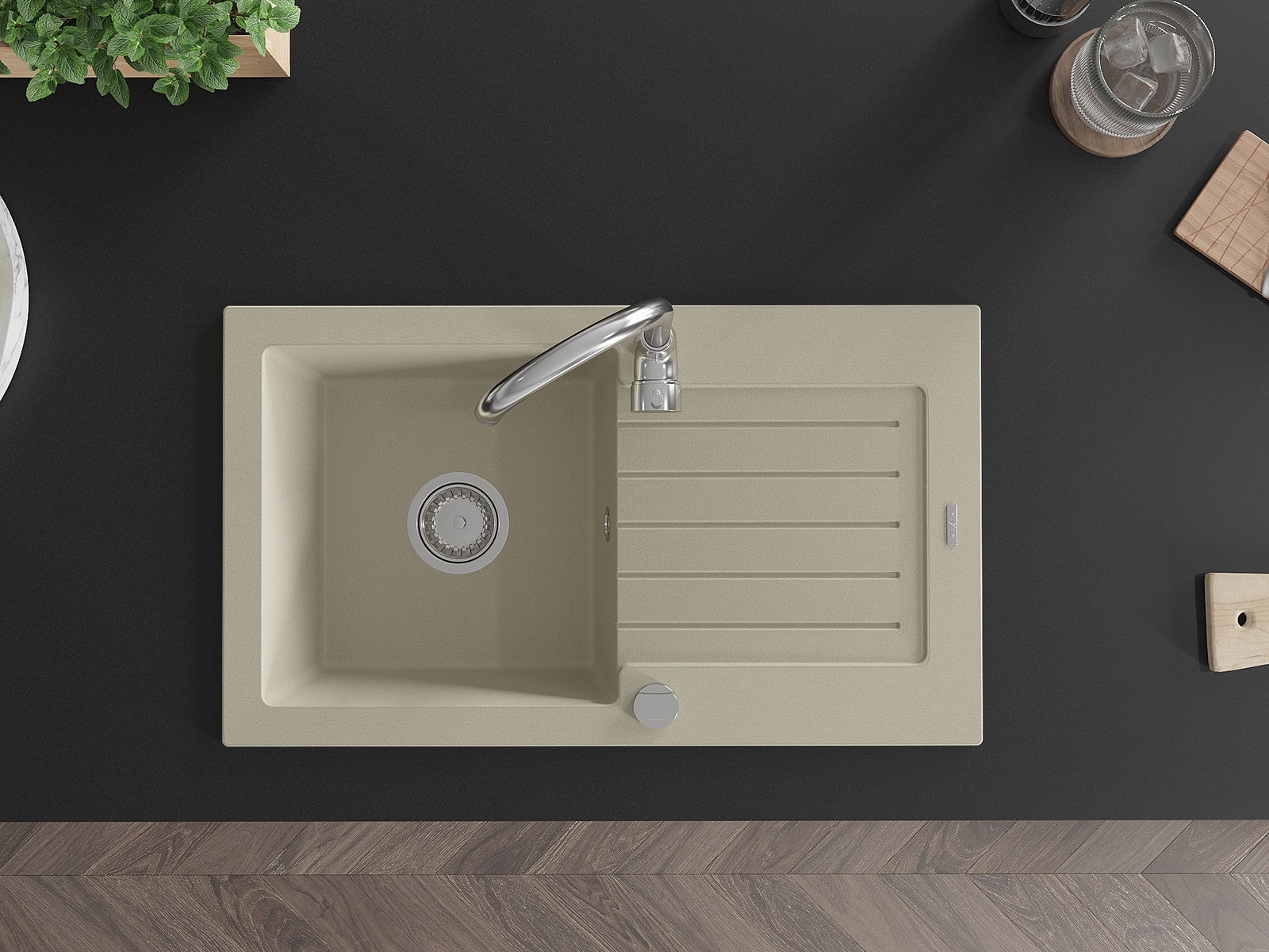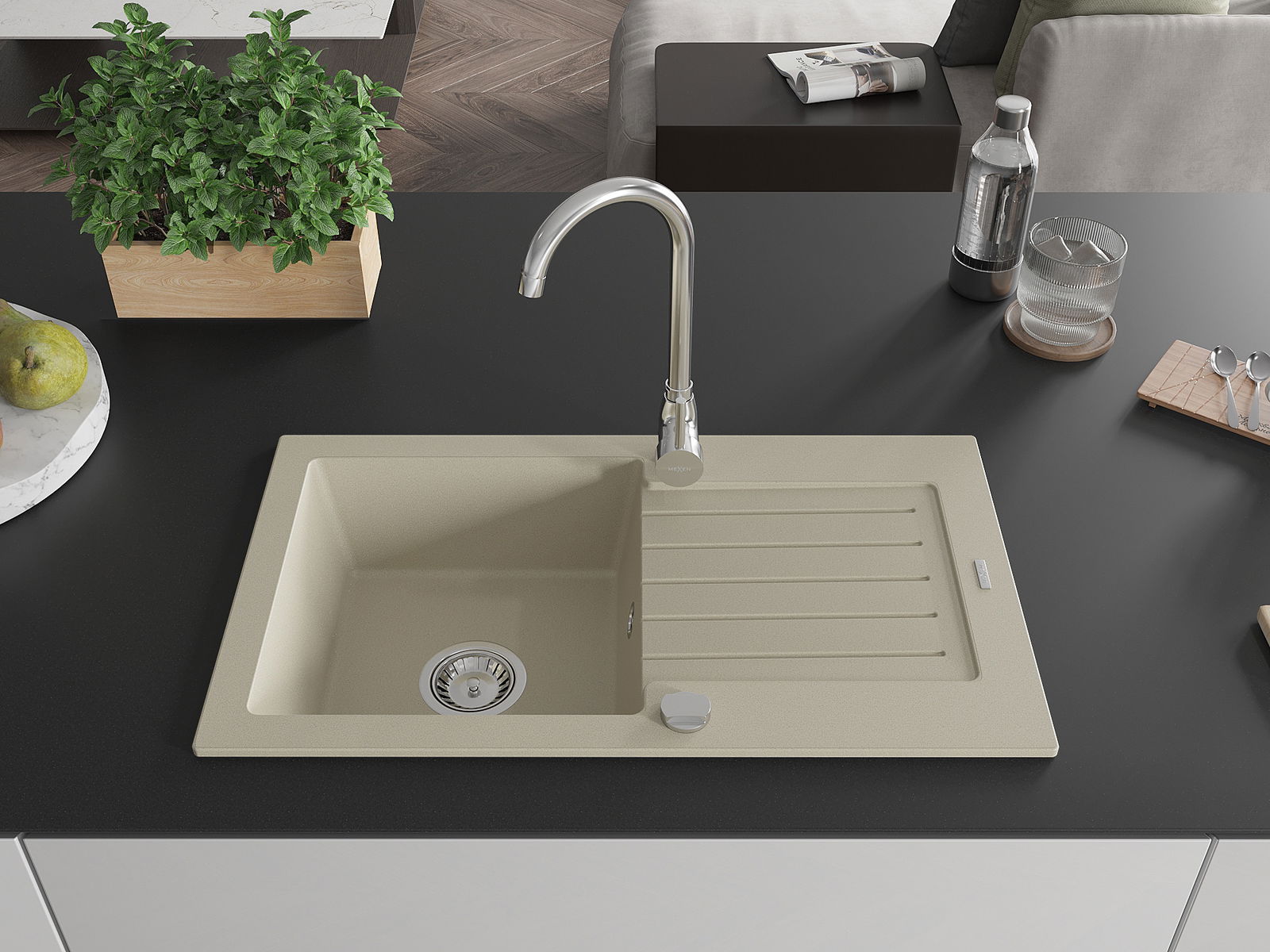 Mexen Pablo granitinė vienos kameros plautuvė su nusausintuvu ir Telma virtuviniu maišytuvu, smėlio spalvos - 6510-69-670200-00