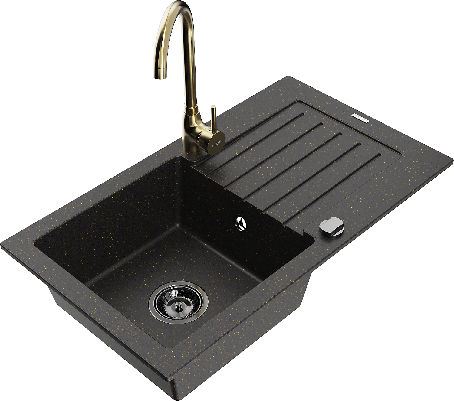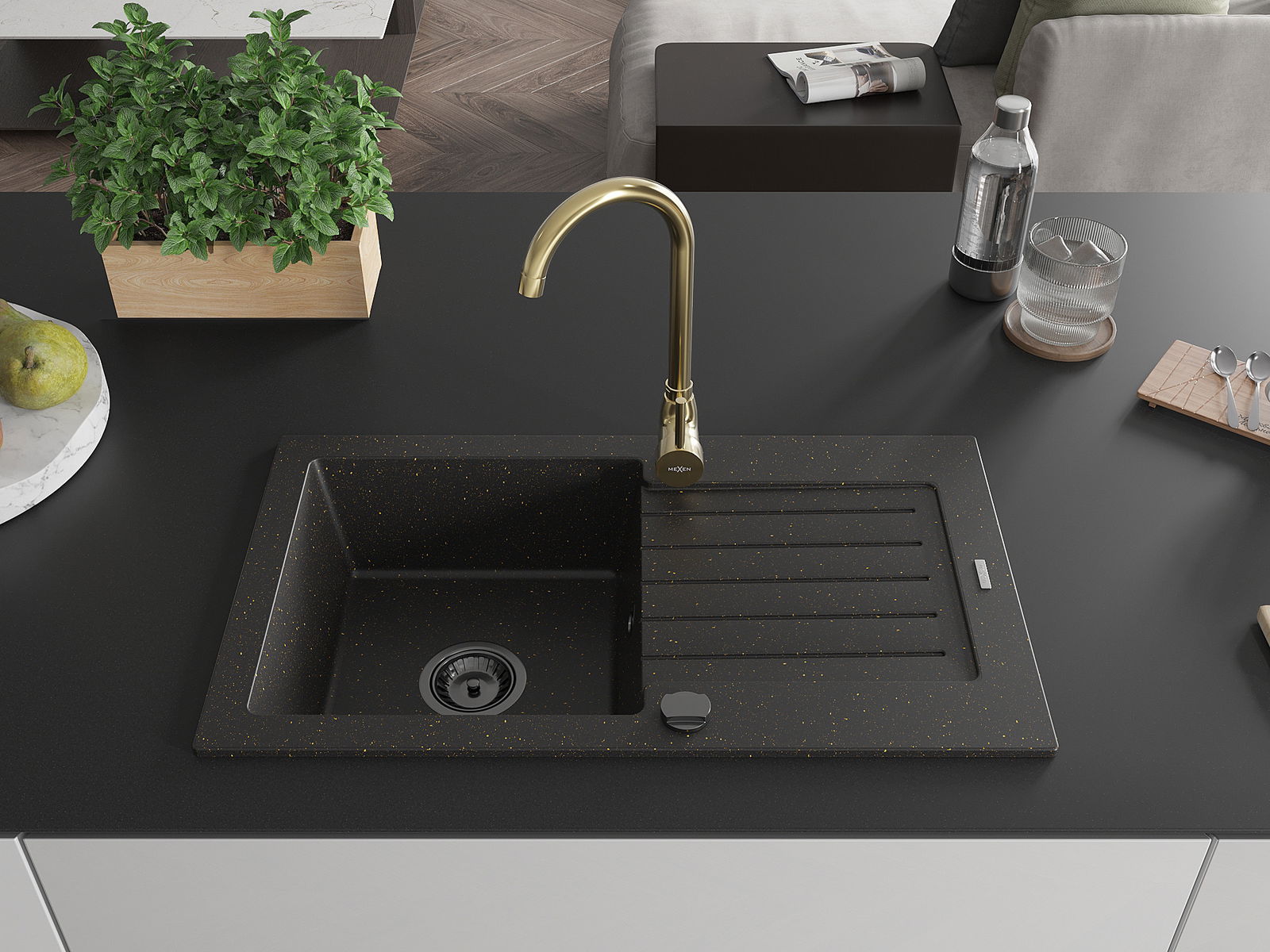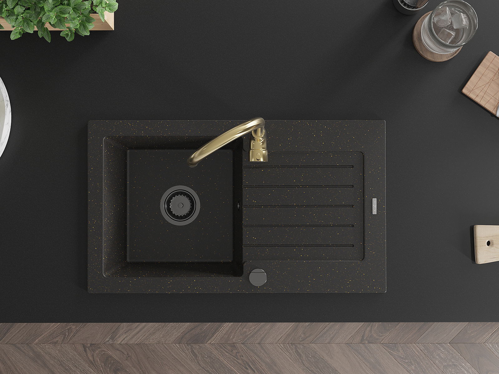 Mexen Pablo granito virtuvės kriauklė, 1 skyrius su nutekėjimu ir virtuvės maišytuvu Telma, juoda/auksinė - 6510-75-670200-50-B