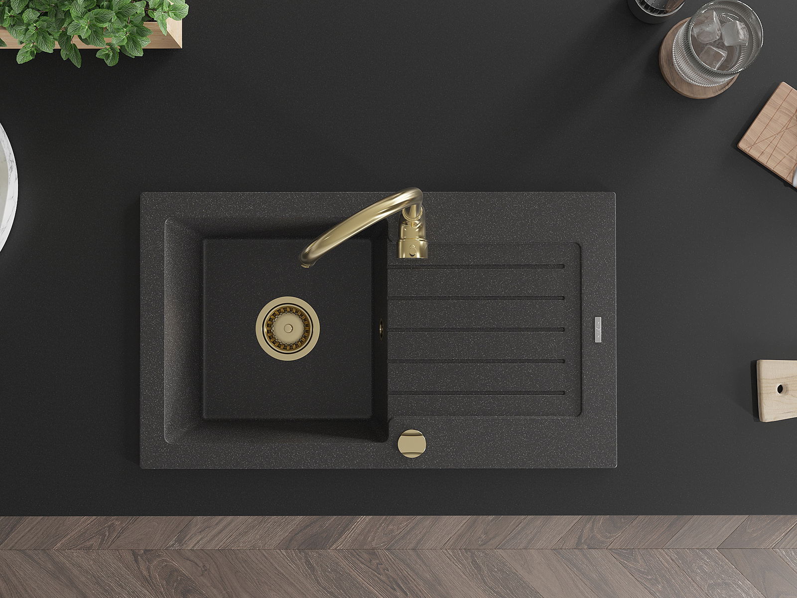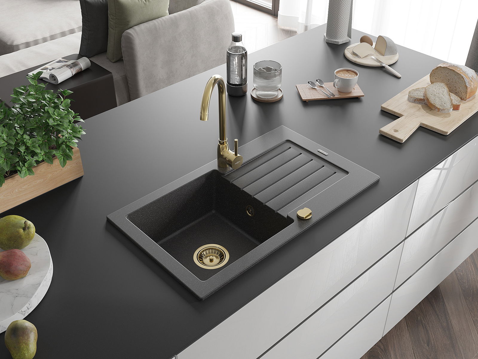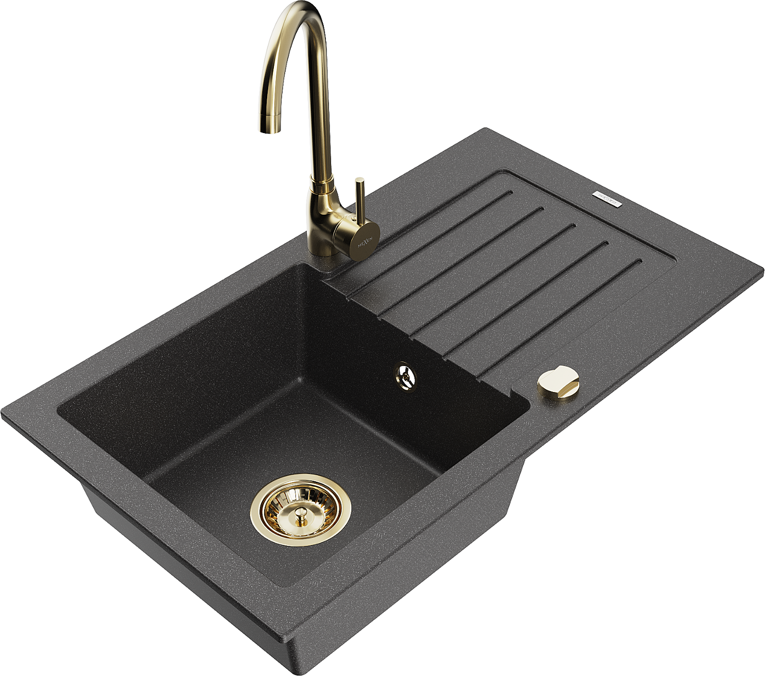 Mexen Pablo granitinė vienos dalies plautuvė su nutekėjimo paviršiumi ir Telma virtuviniu maišytuvu, juoda dėmėta