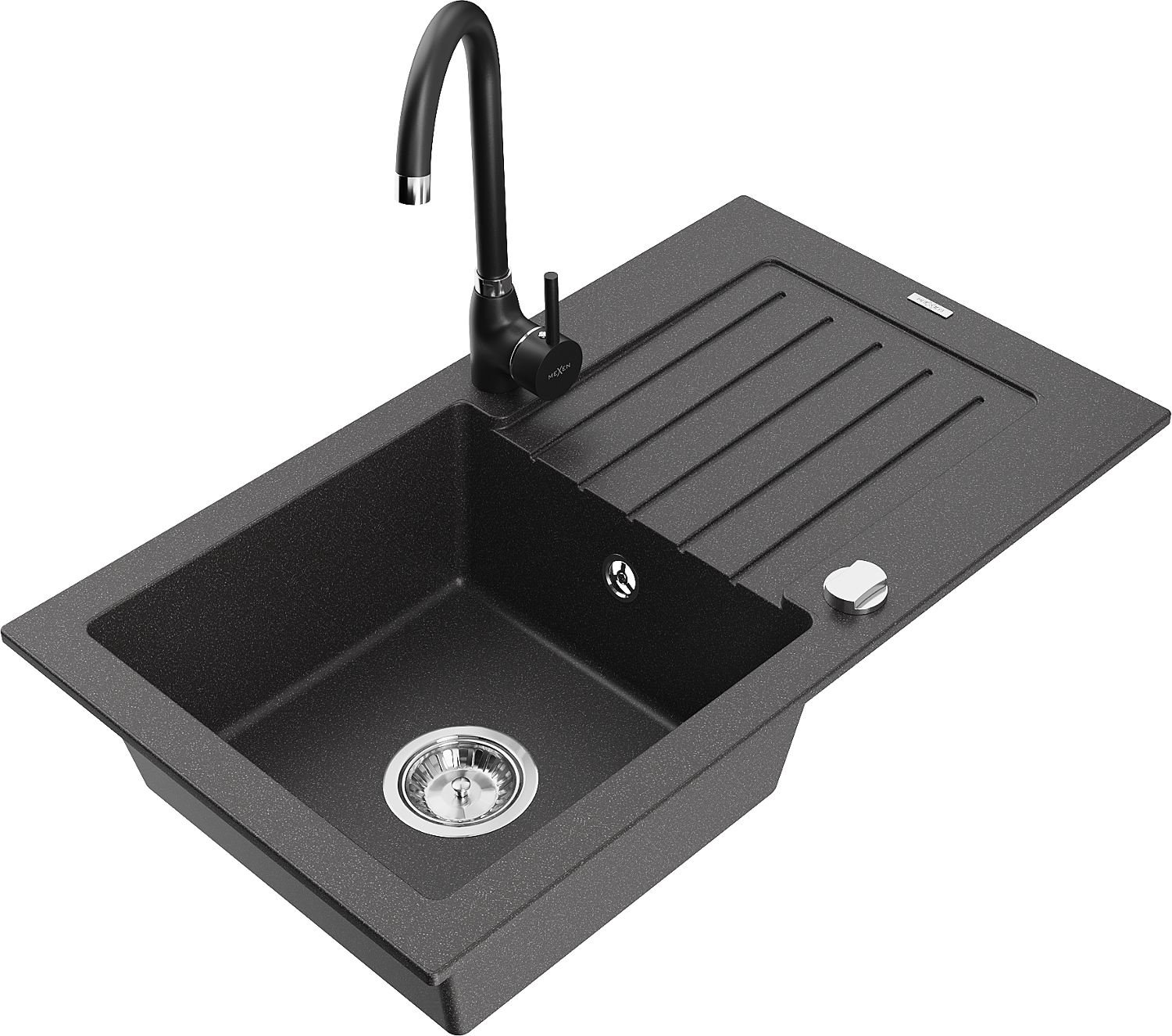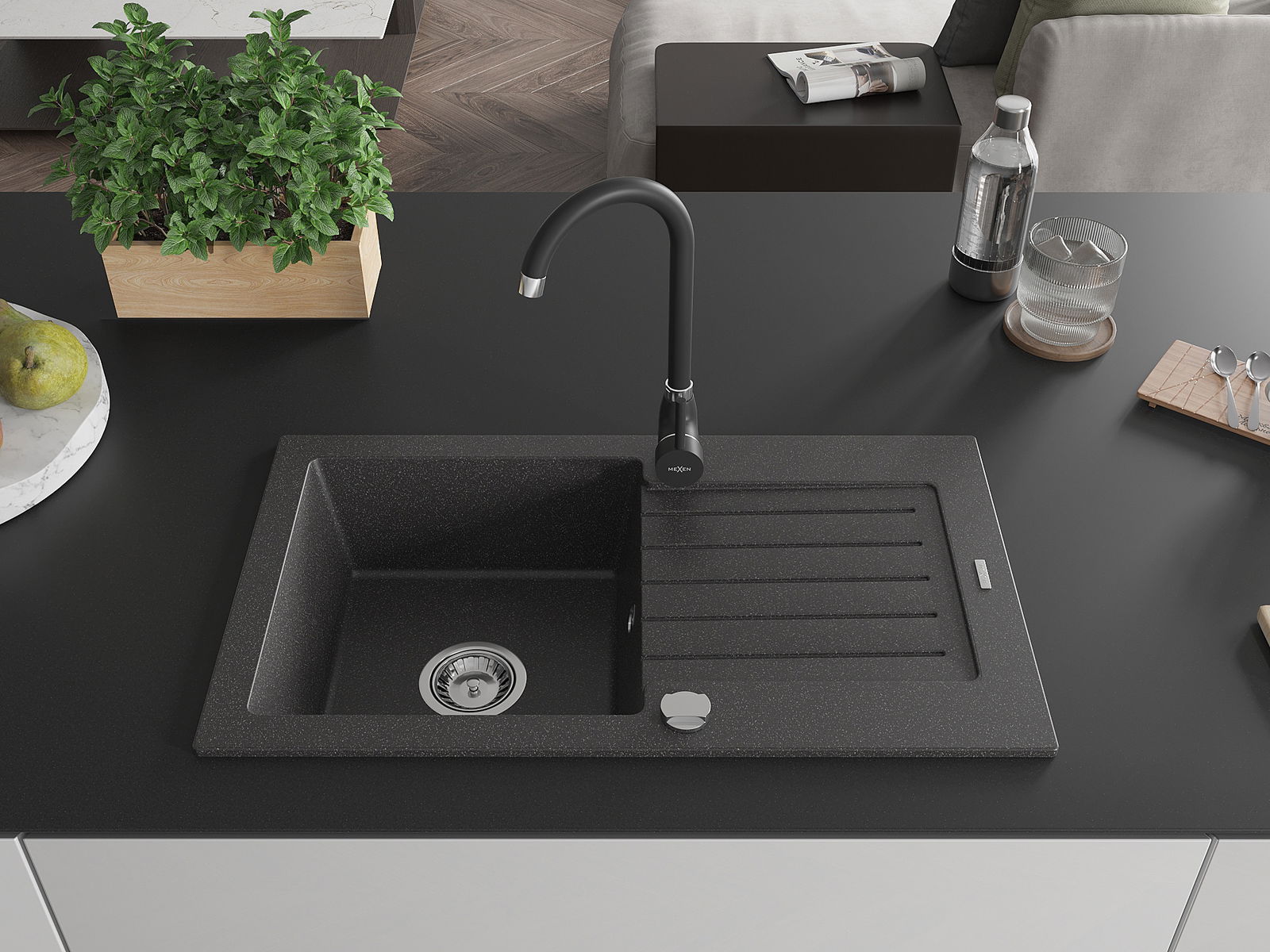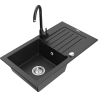 Mexen Pablo granitinė vienos kameros plautuvė su nutekėjimu ir virtuviniu maišytuvu Telma, juoda dengtine